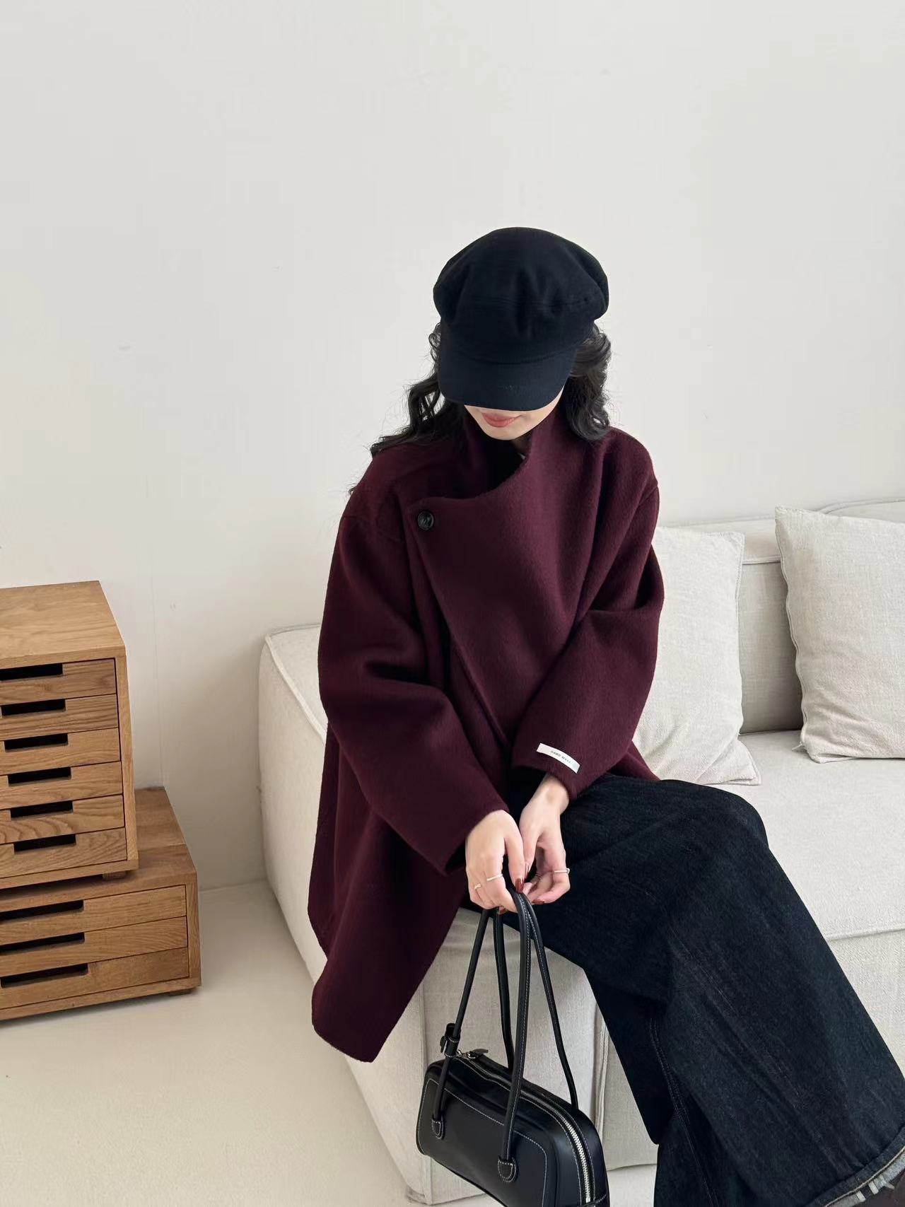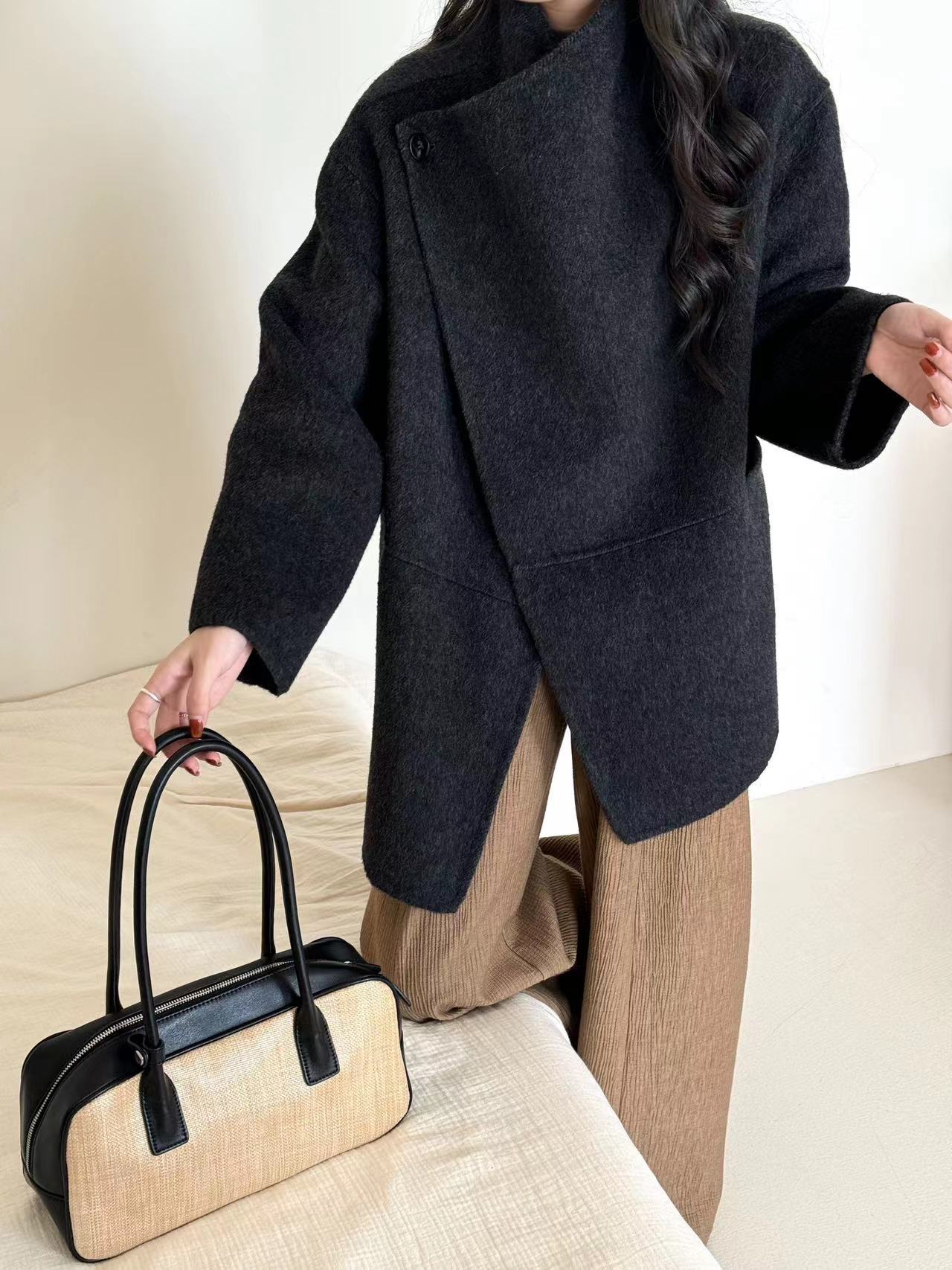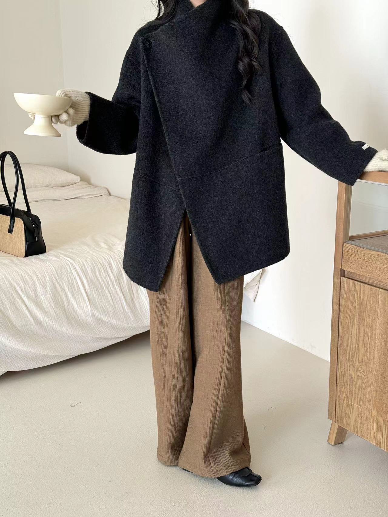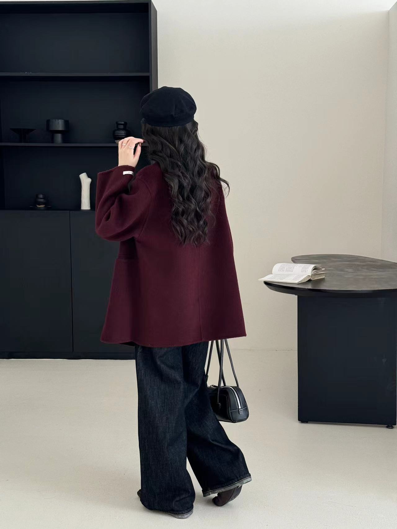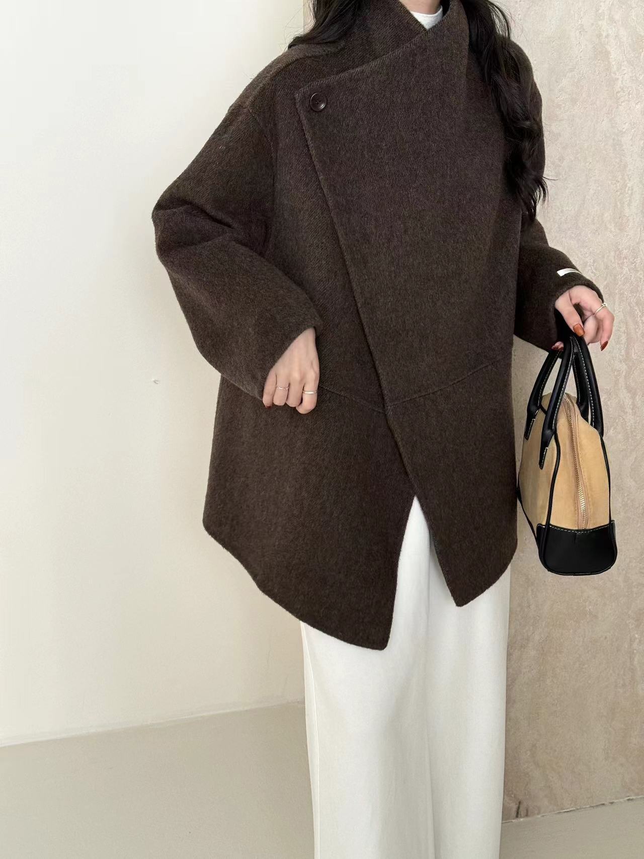 대형 옷깃 단색 한 버튼 어깨 소매 양면 양모 코트 여성용 캐주얼 올매치 따뜻한 가을과 겨울