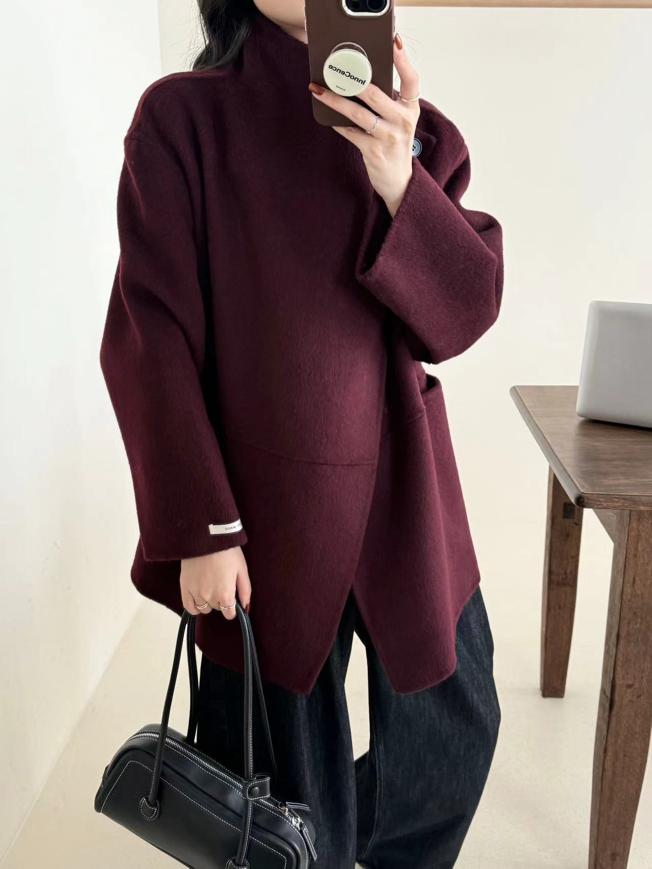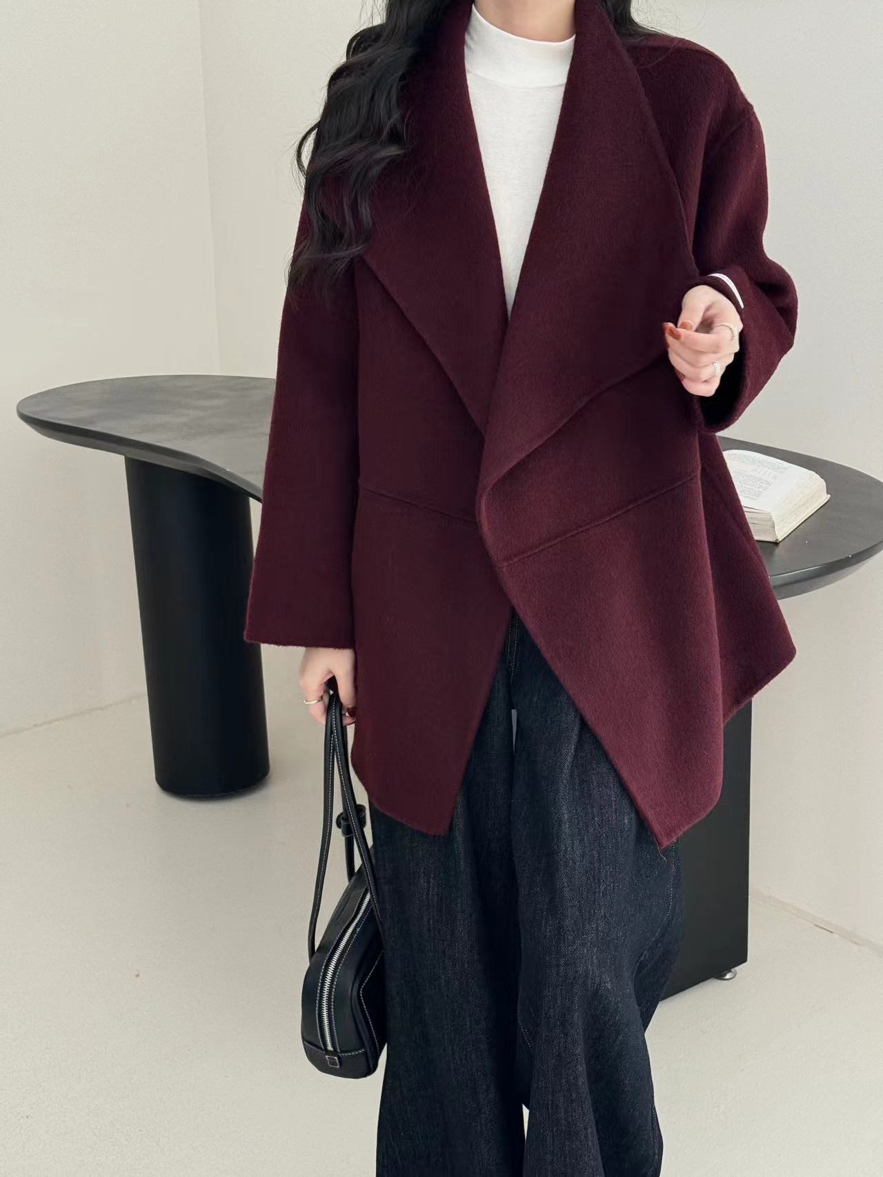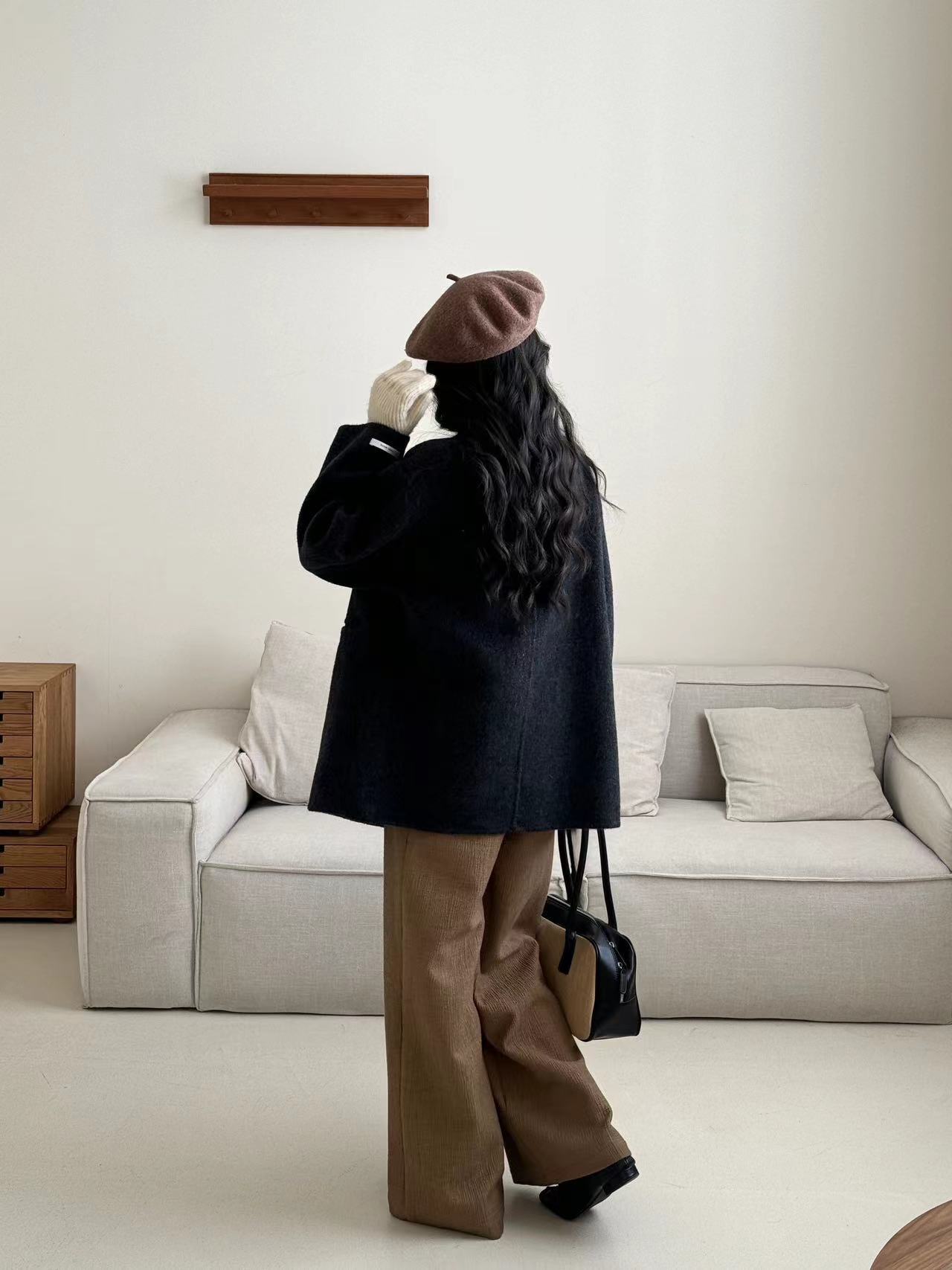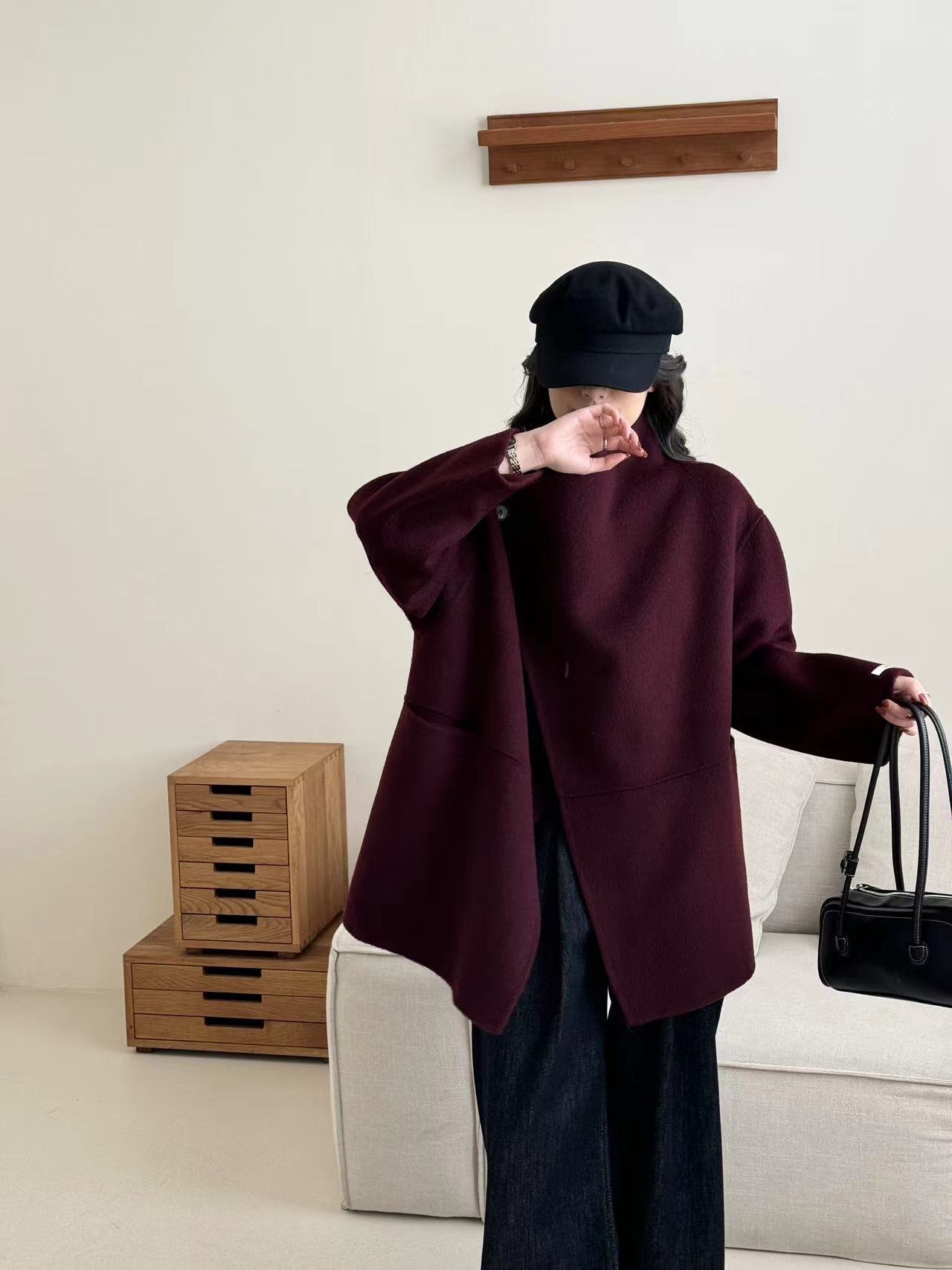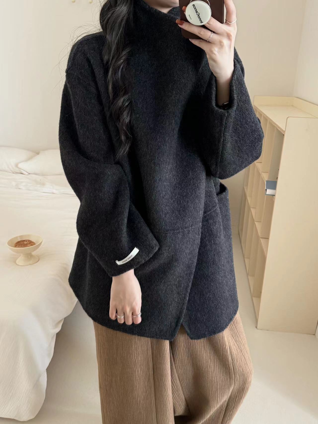 대형 옷깃 단색 한 버튼 어깨 소매 양면 양모 코트 여성용 캐주얼 올매치 따뜻한 가을과 겨울