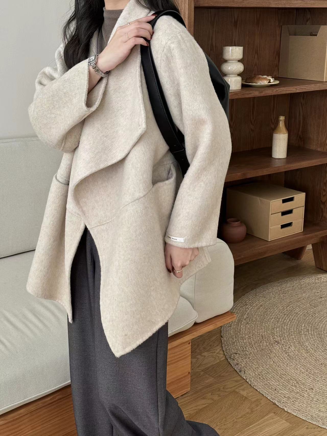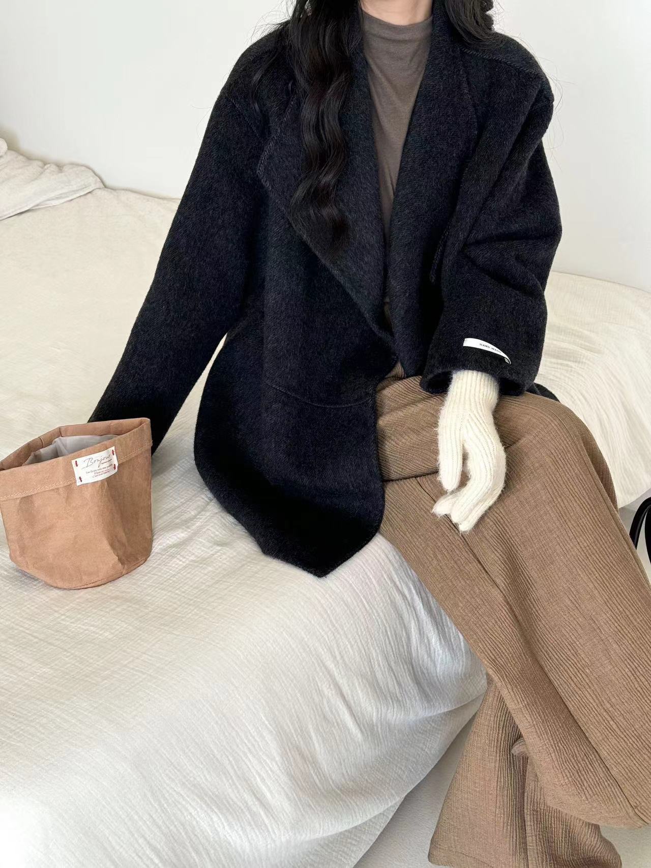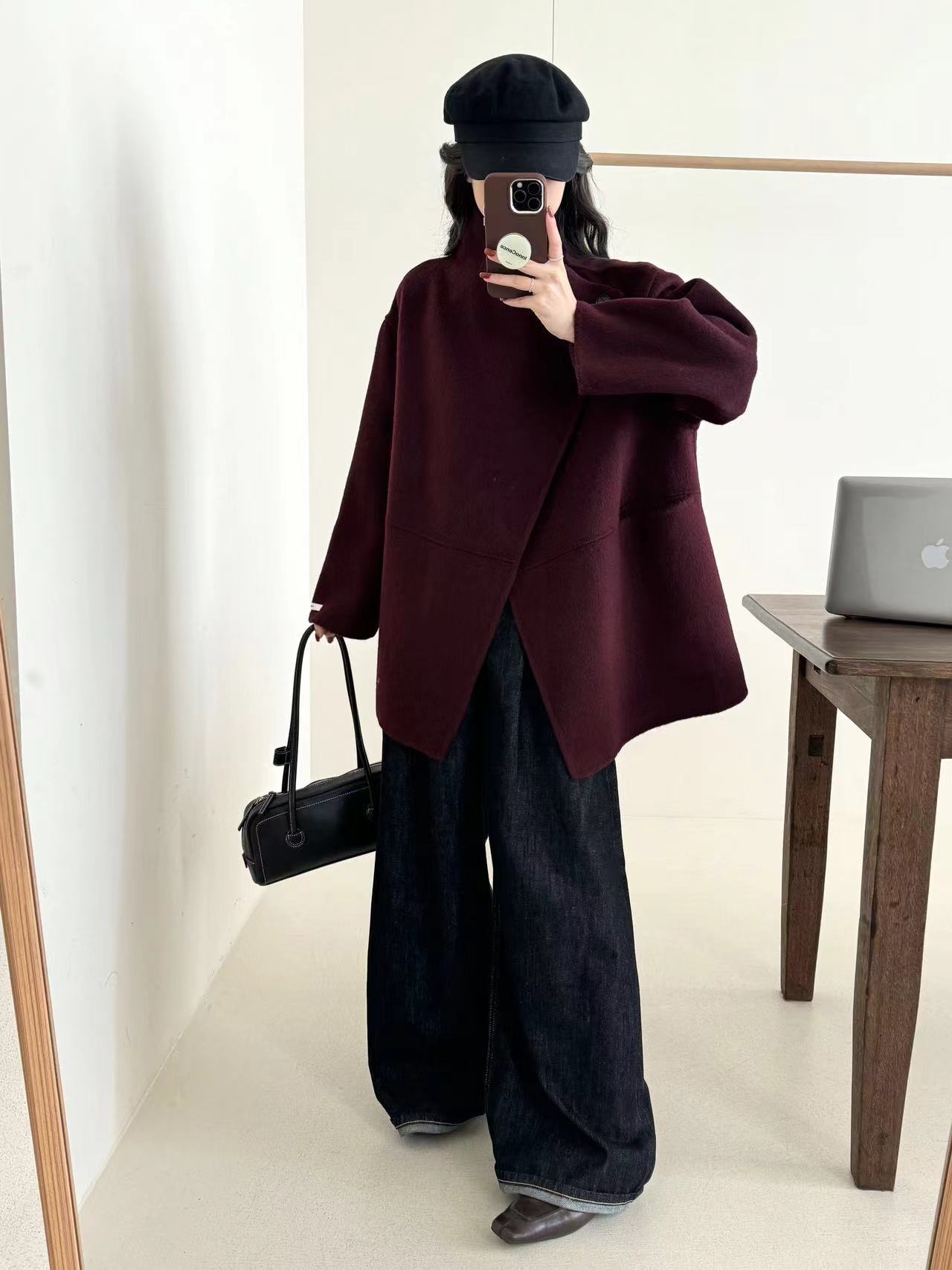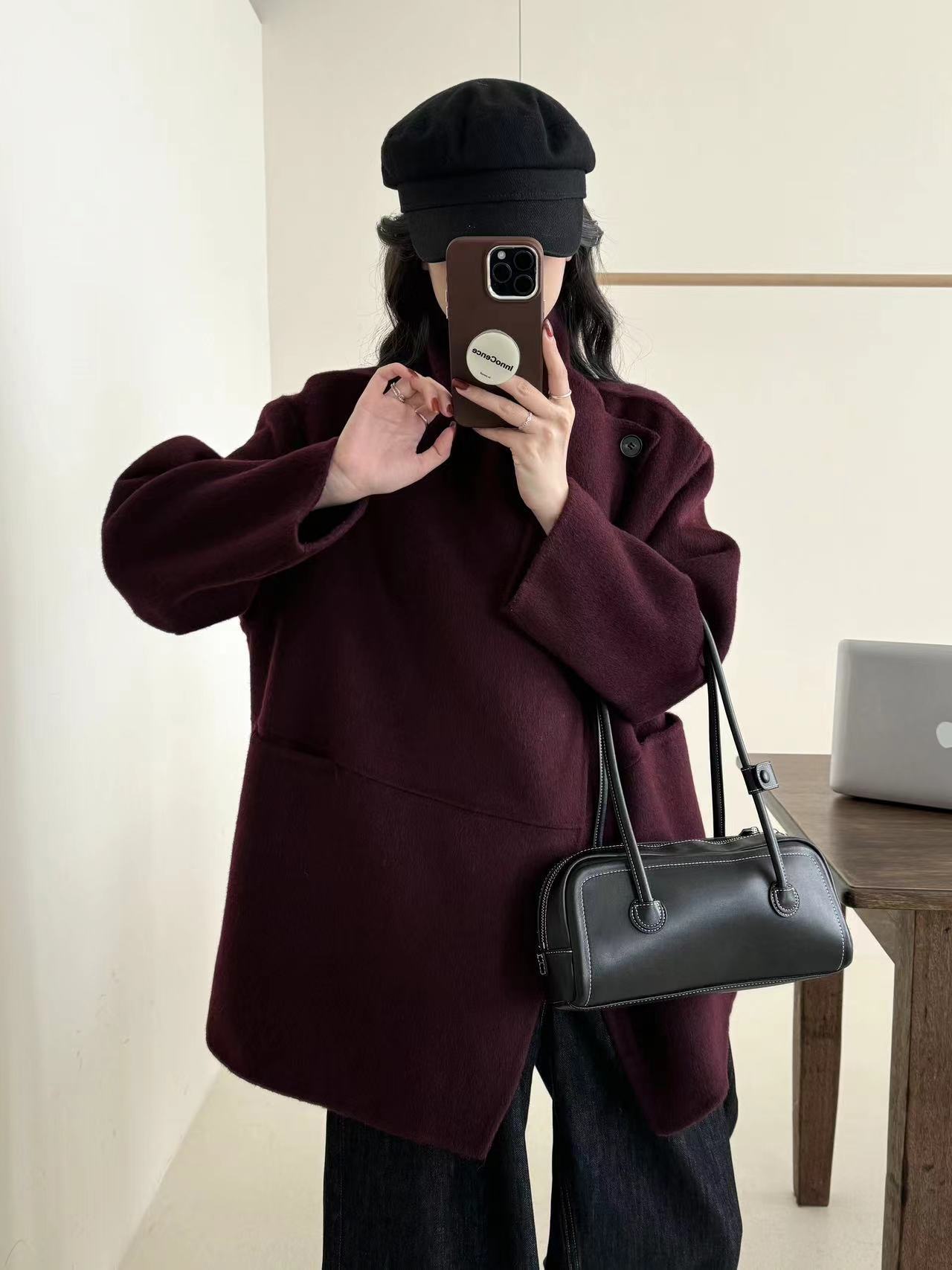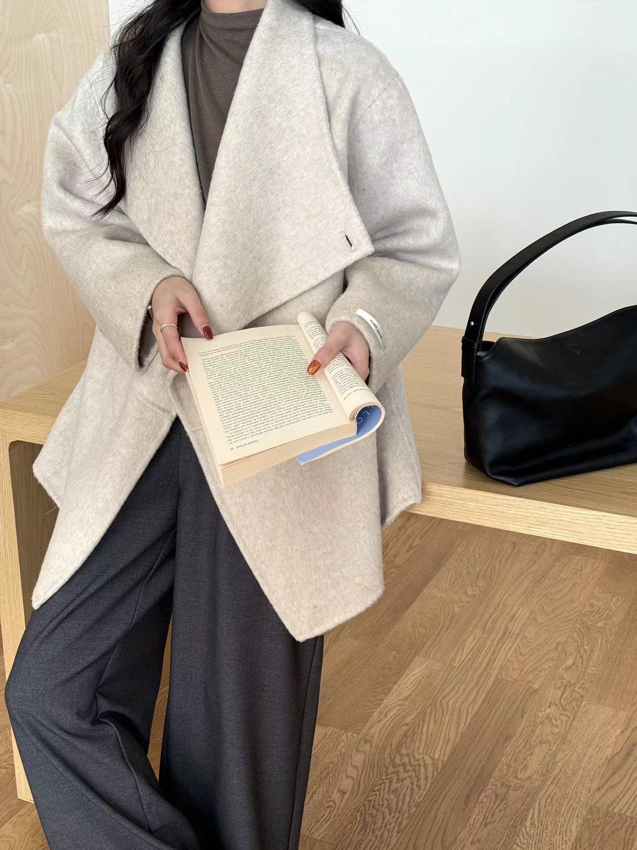 대형 옷깃 단색 한 버튼 어깨 소매 양면 양모 코트 여성용 캐주얼 올매치 따뜻한 가을과 겨울
