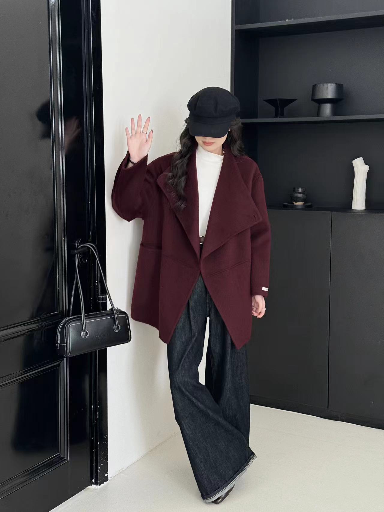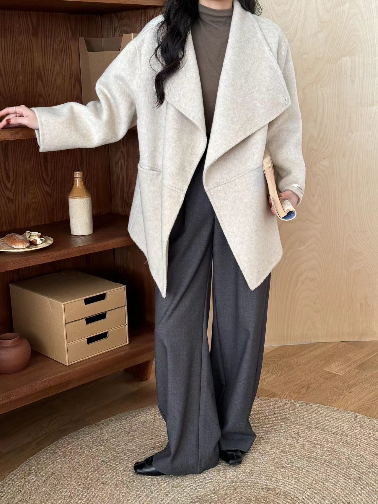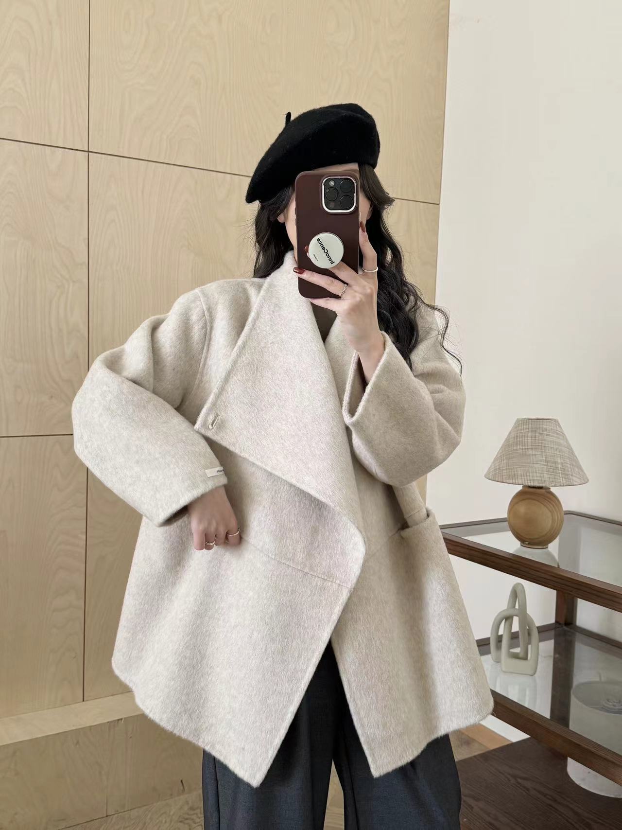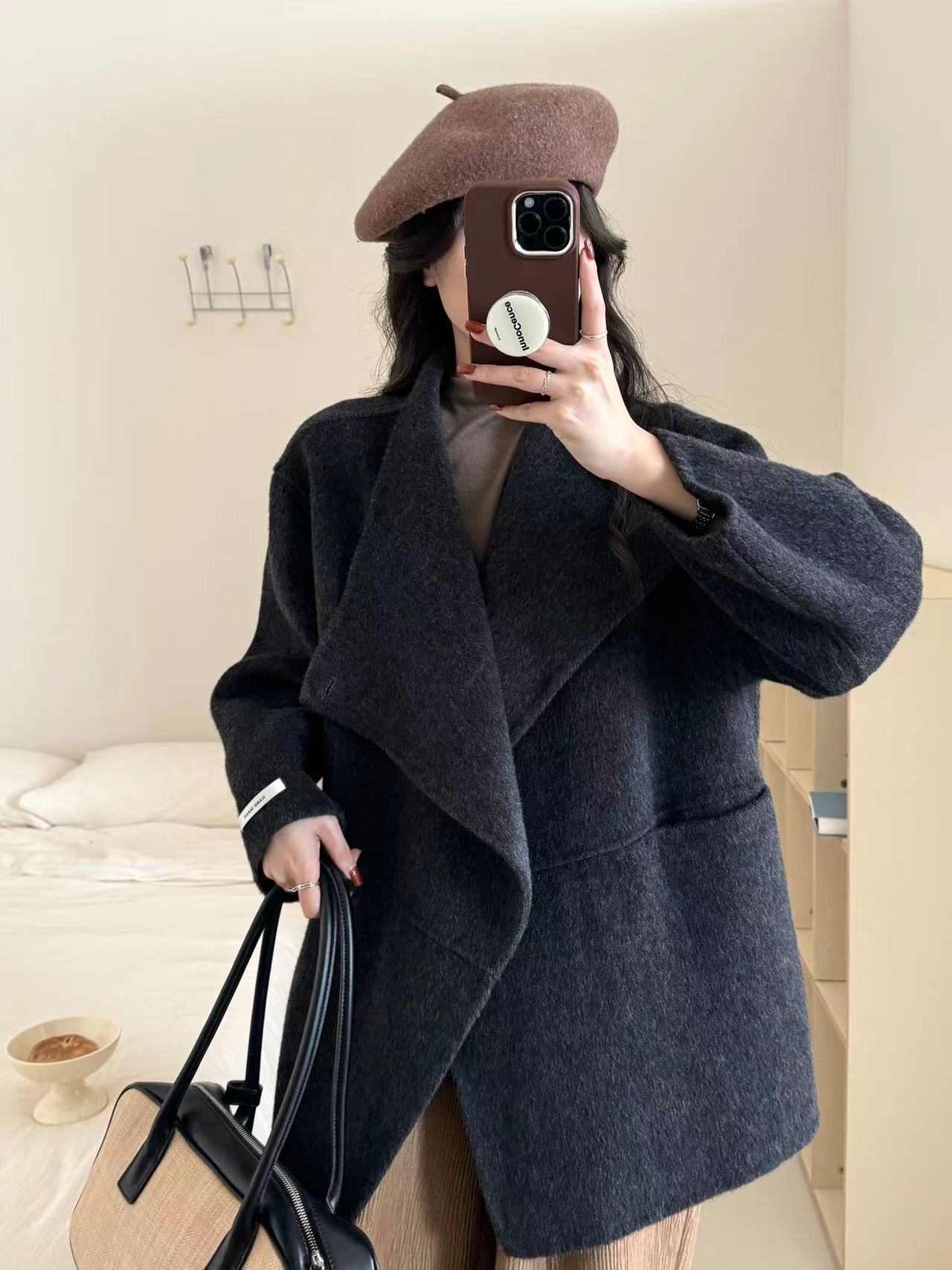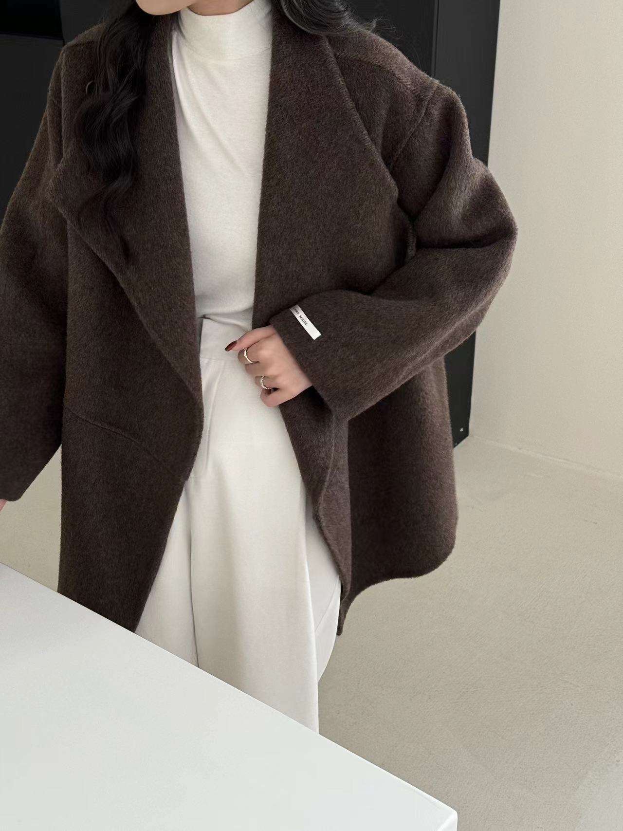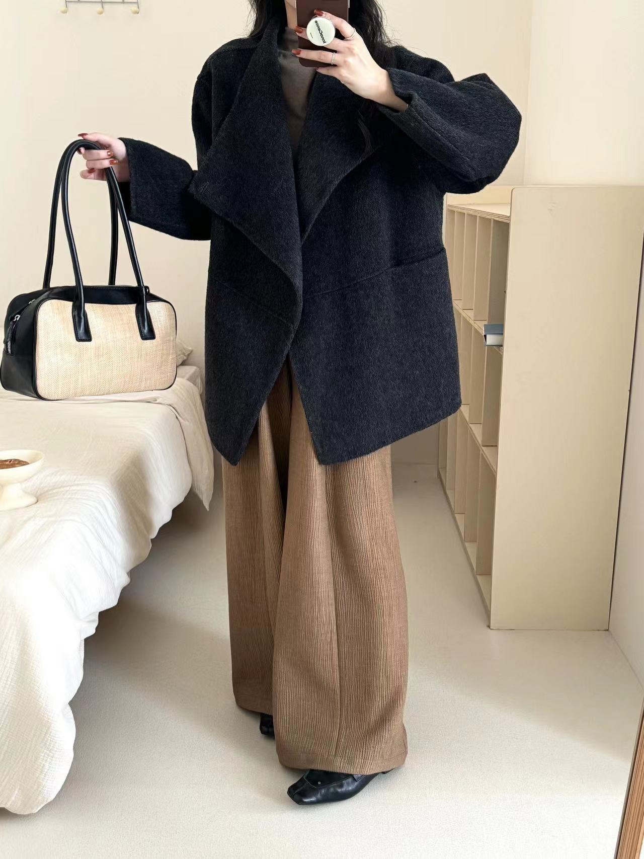 대형 옷깃 단색 한 버튼 어깨 소매 양면 양모 코트 여성용 캐주얼 올매치 따뜻한 가을과 겨울