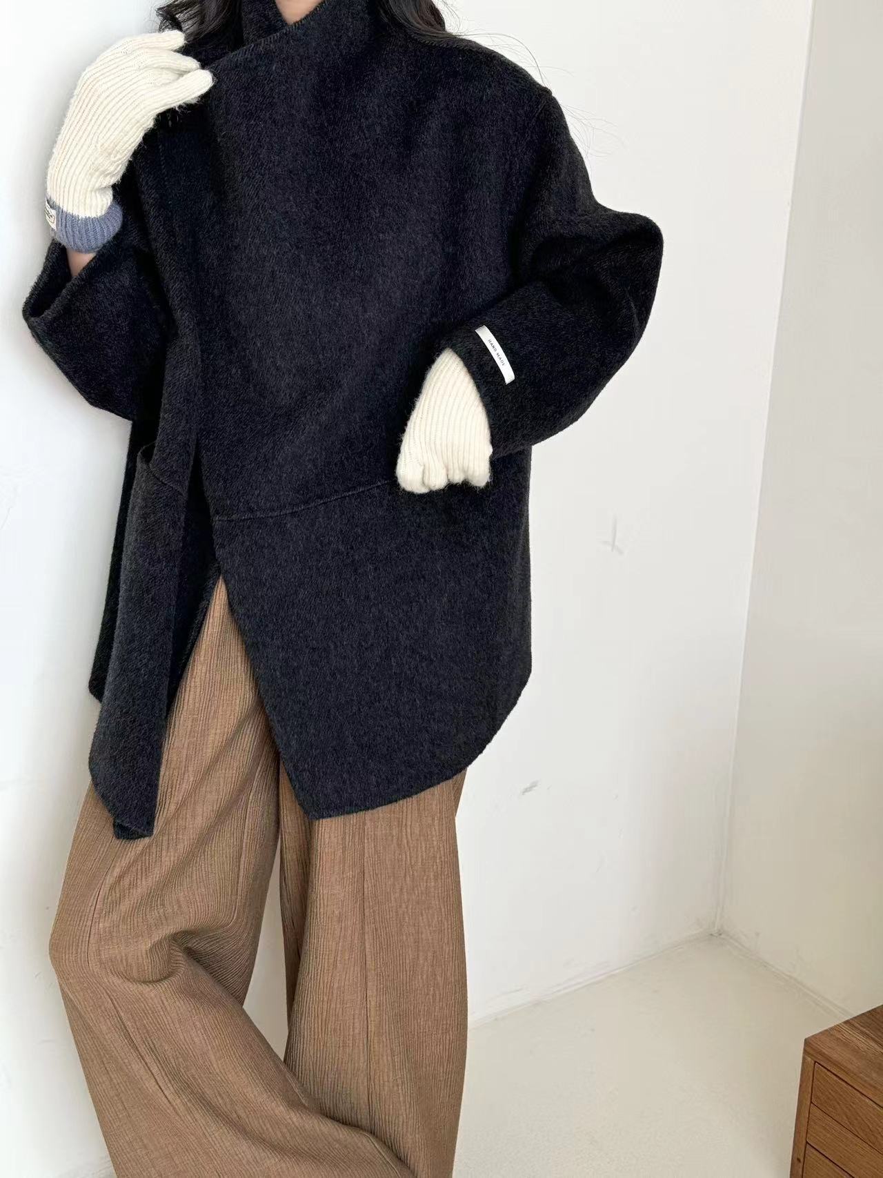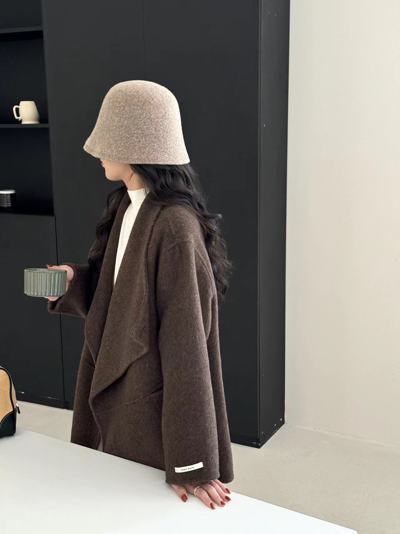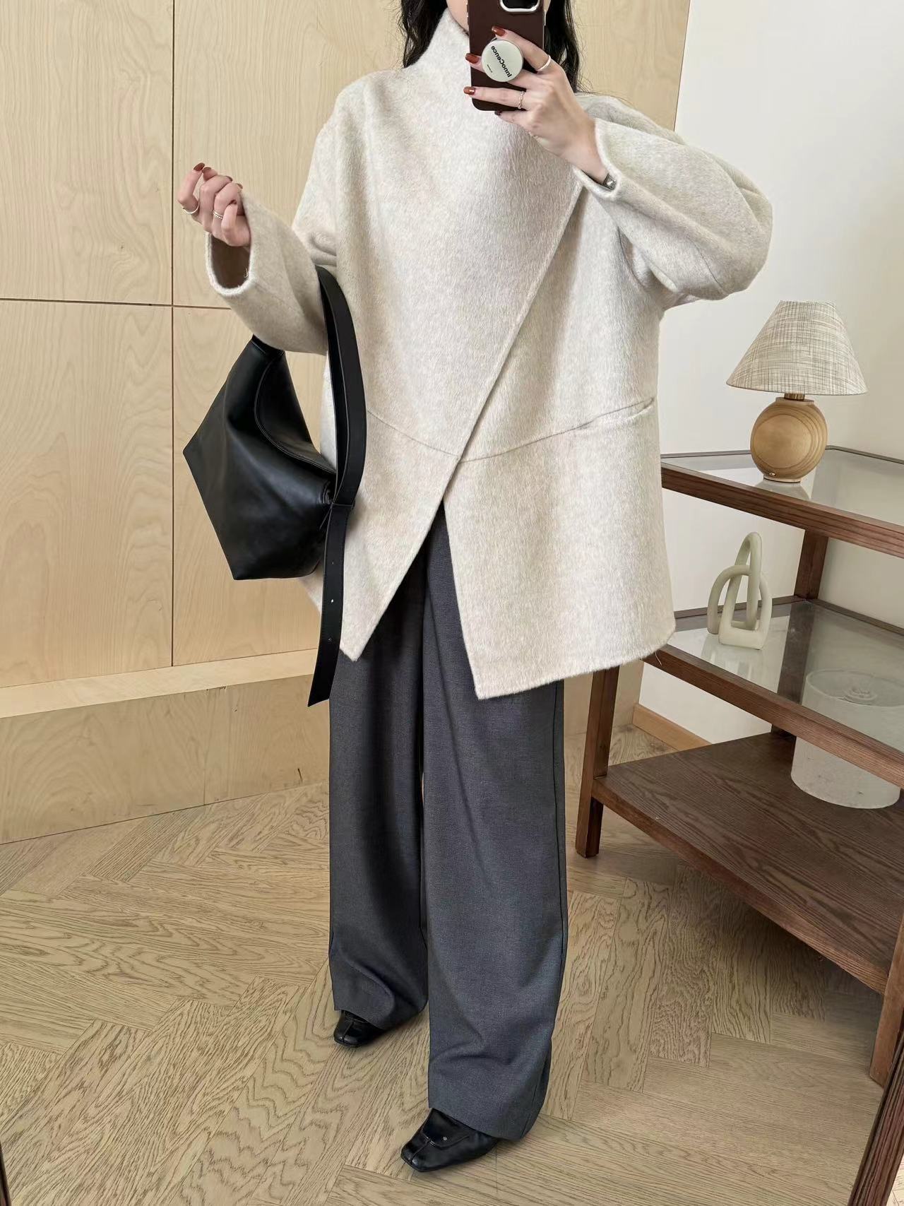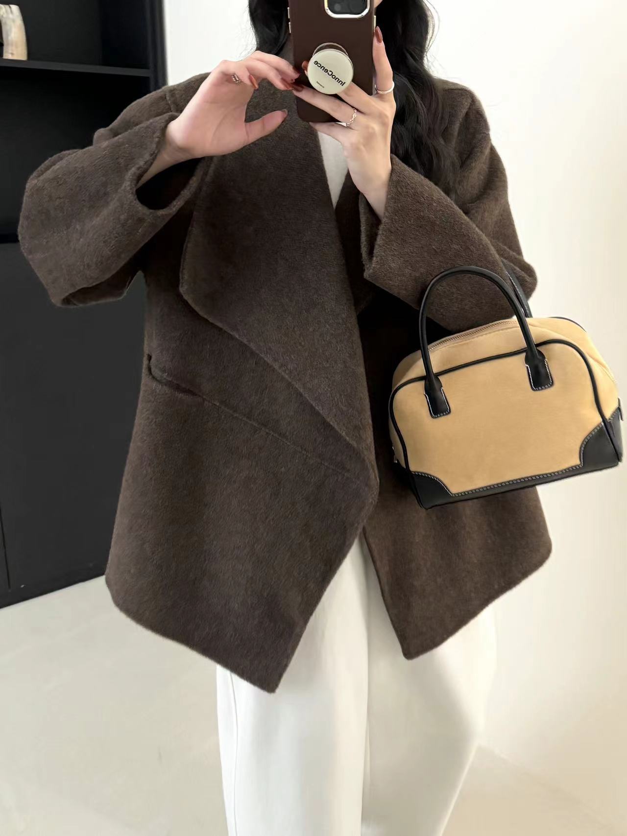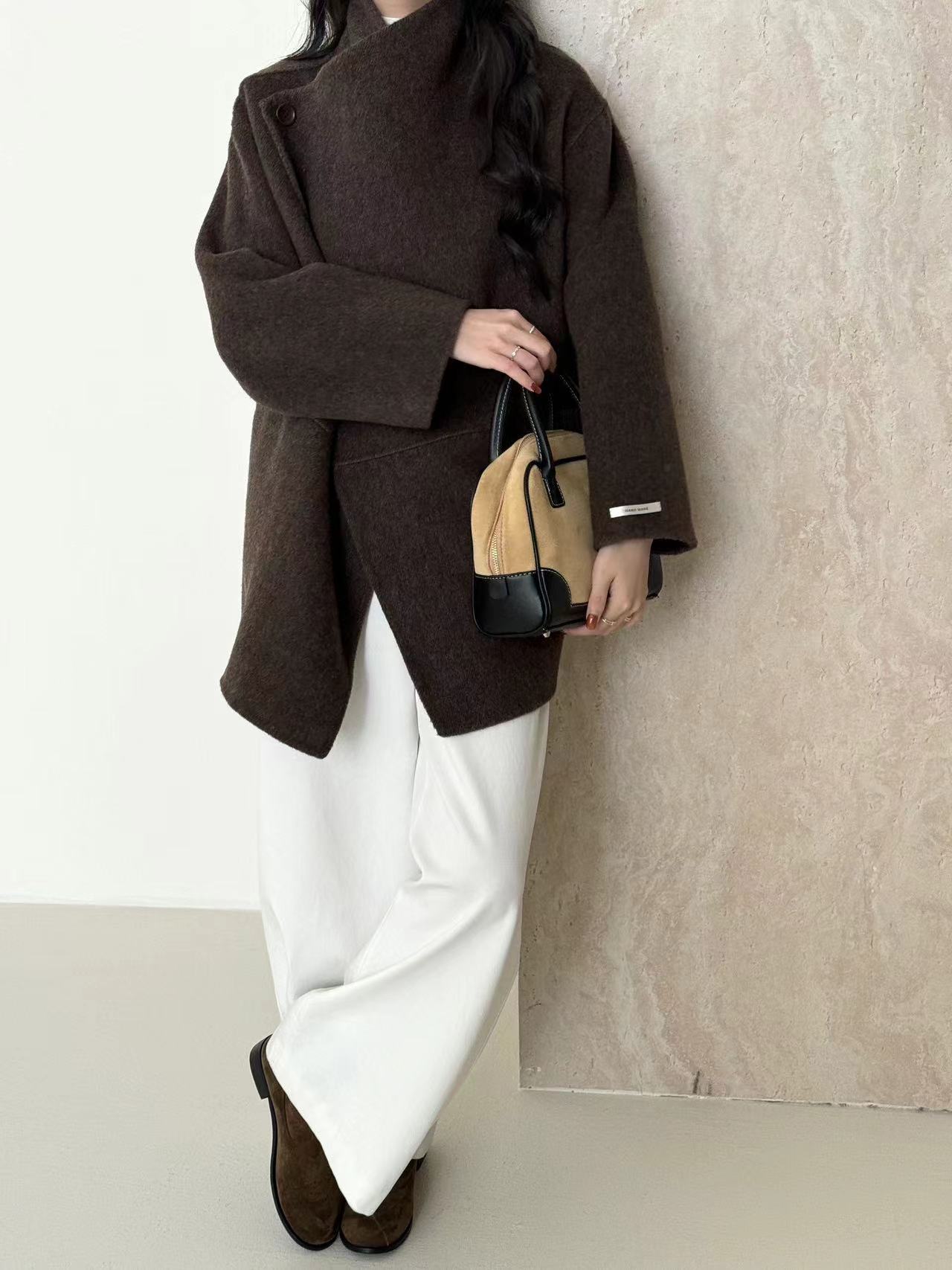대형 옷깃 단색 한 버튼 어깨 소매 양면 양모 코트 여성용 캐주얼 올매치 따뜻한 가을과 겨울