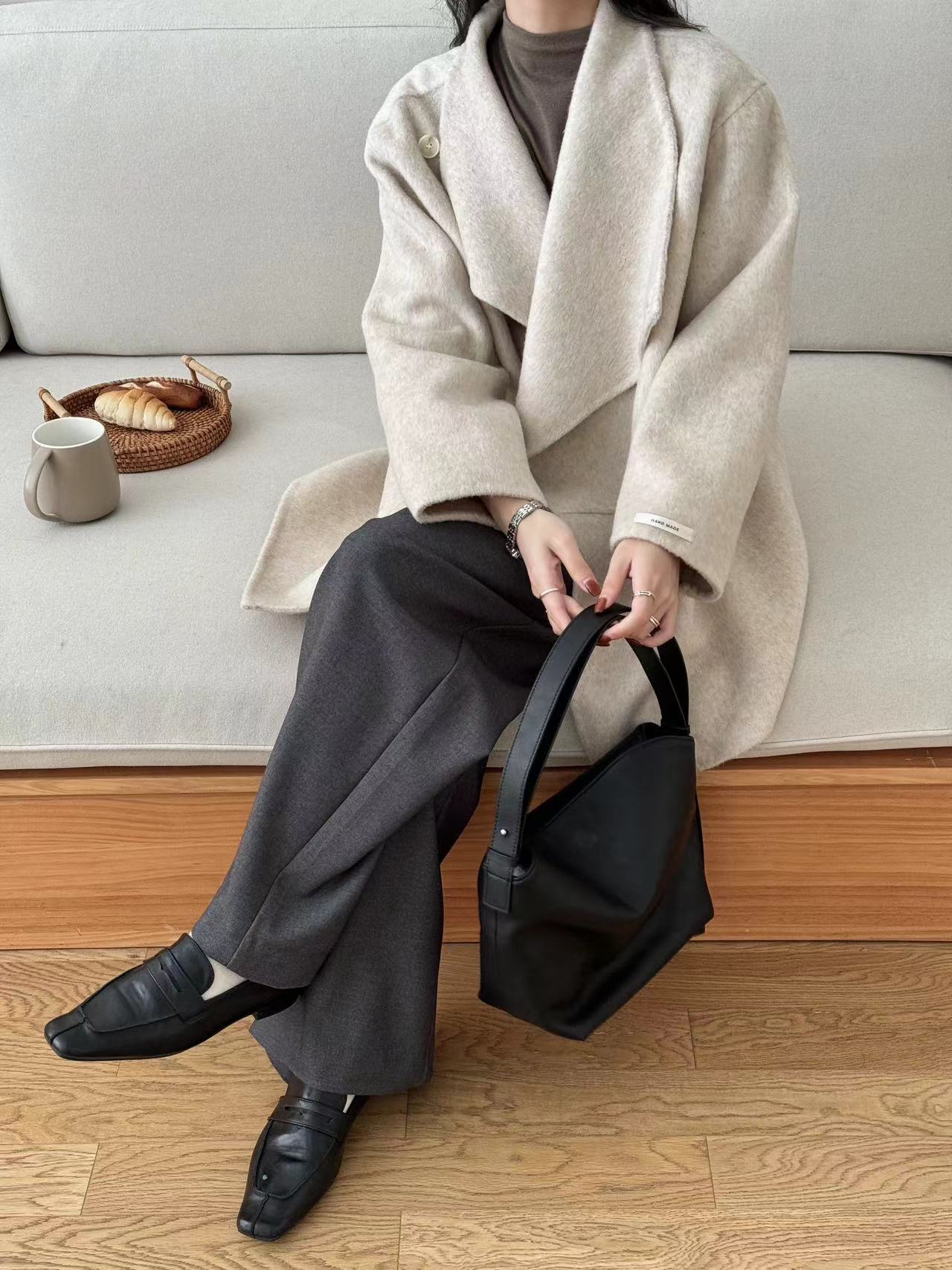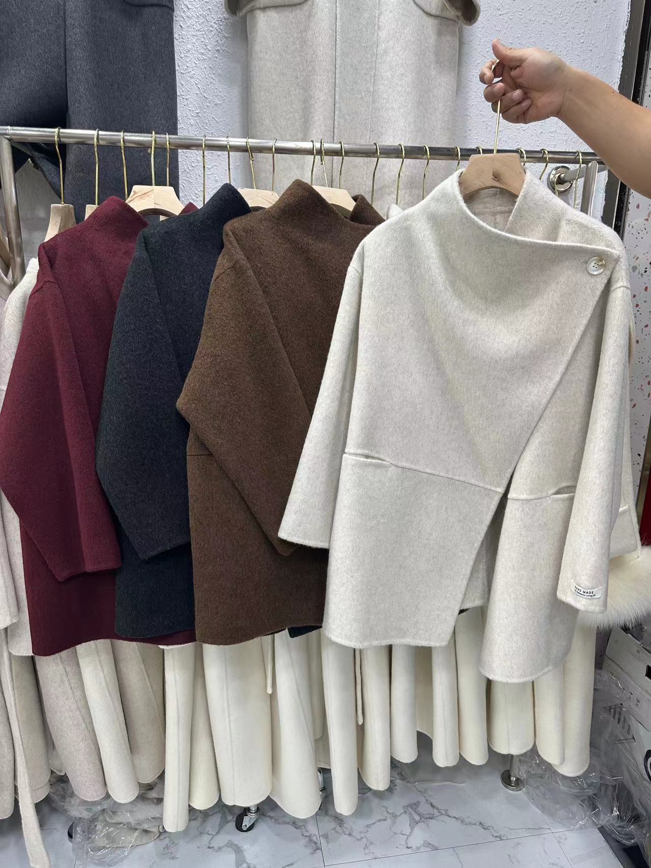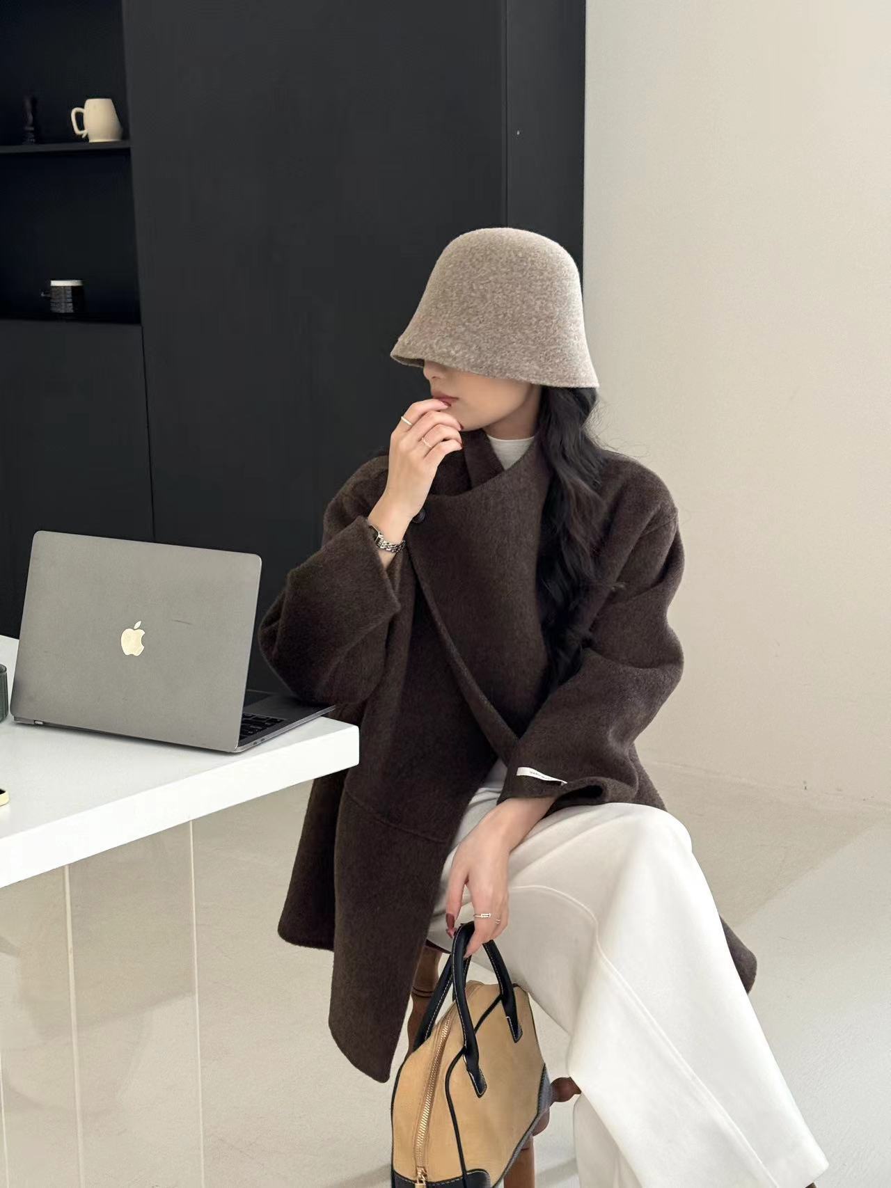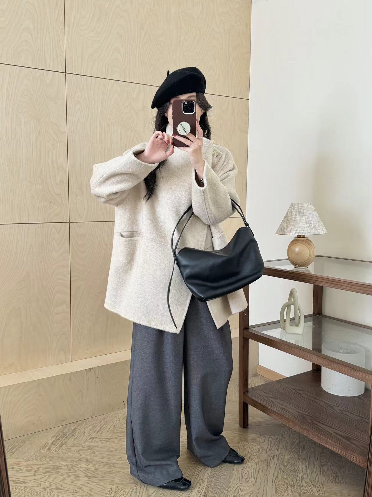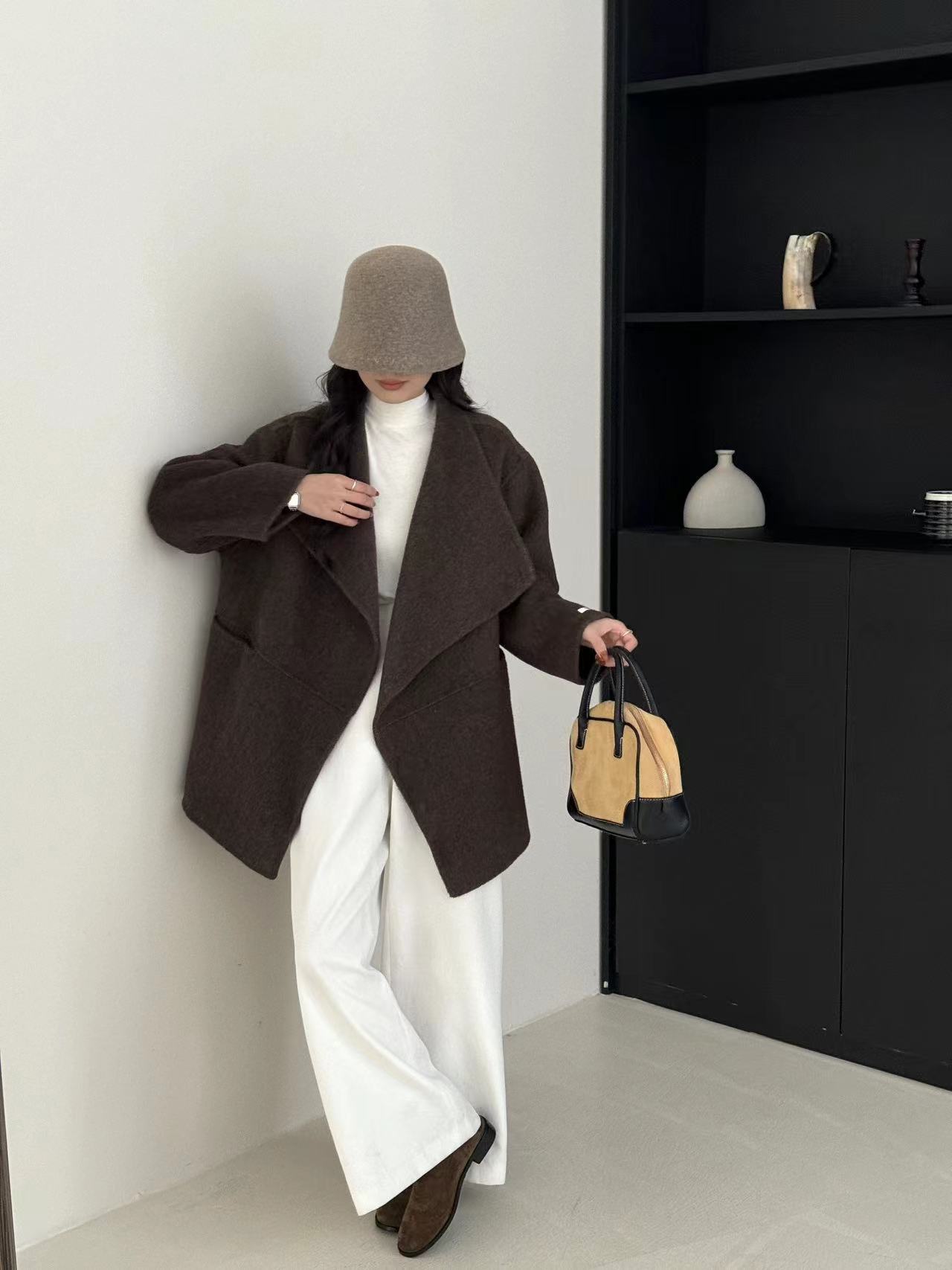 대형 옷깃 단색 한 버튼 어깨 소매 양면 양모 코트 여성용 캐주얼 올매치 따뜻한 가을과 겨울