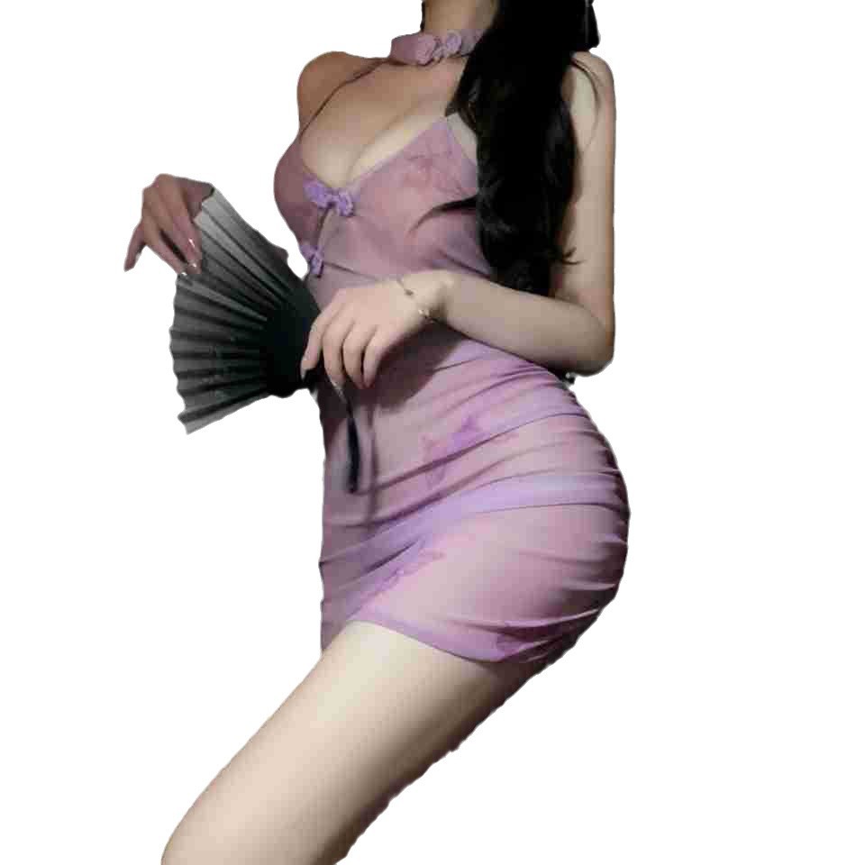 섹시한 속옷 섹시 파자마 여성 골동품 투시 작은 가슴 끈 유니폼 순수 보라색 청삼 원피스 머리