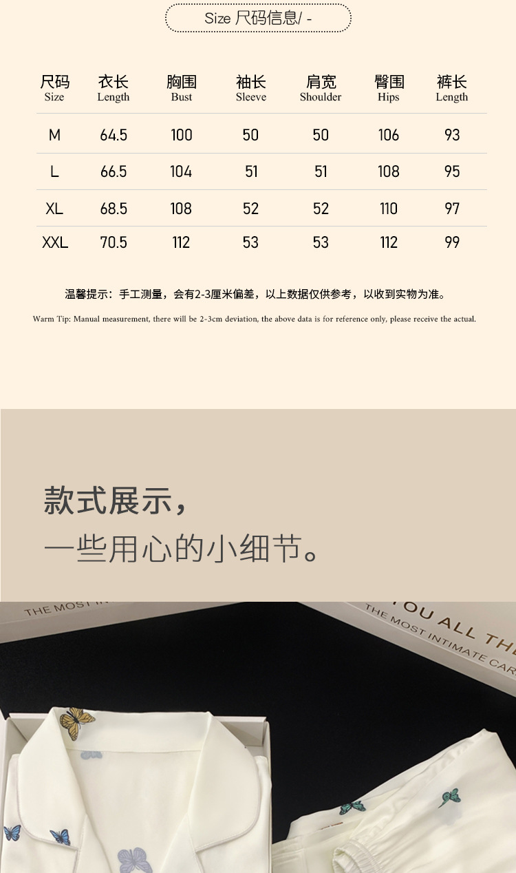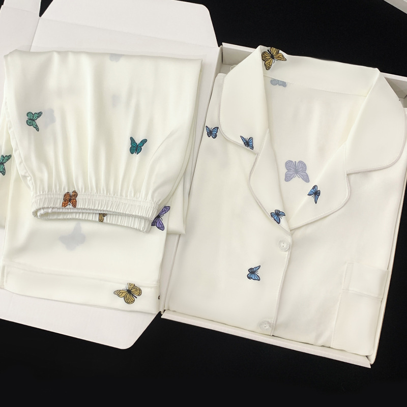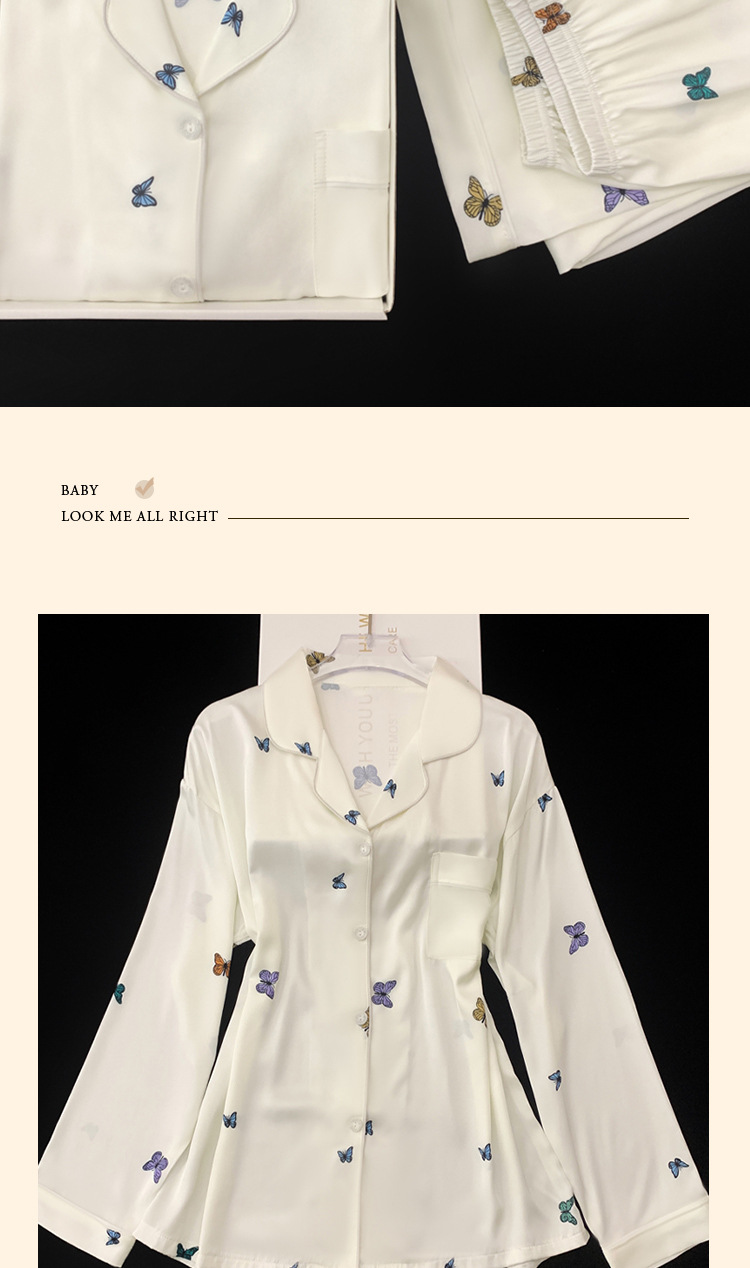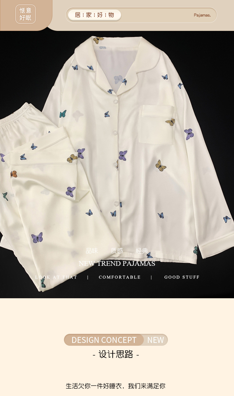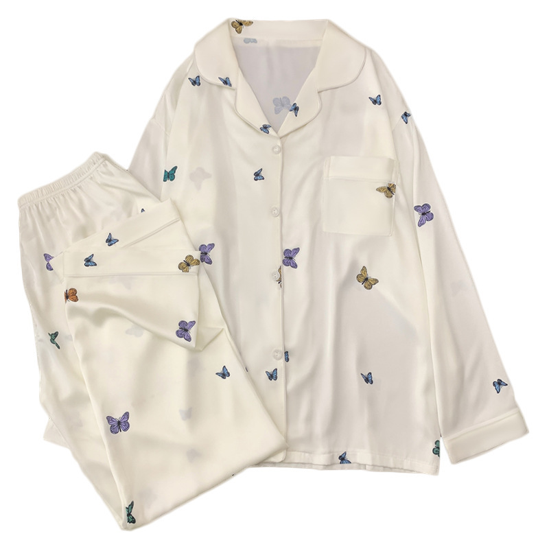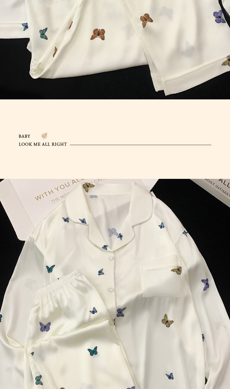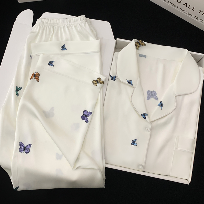 새로운 아이스 실크 잠옷 여성의 가을 긴 소매 세트 나비 풀 프린트 하이 엔드 캐주얼 홈 의류 실제 샷 도매