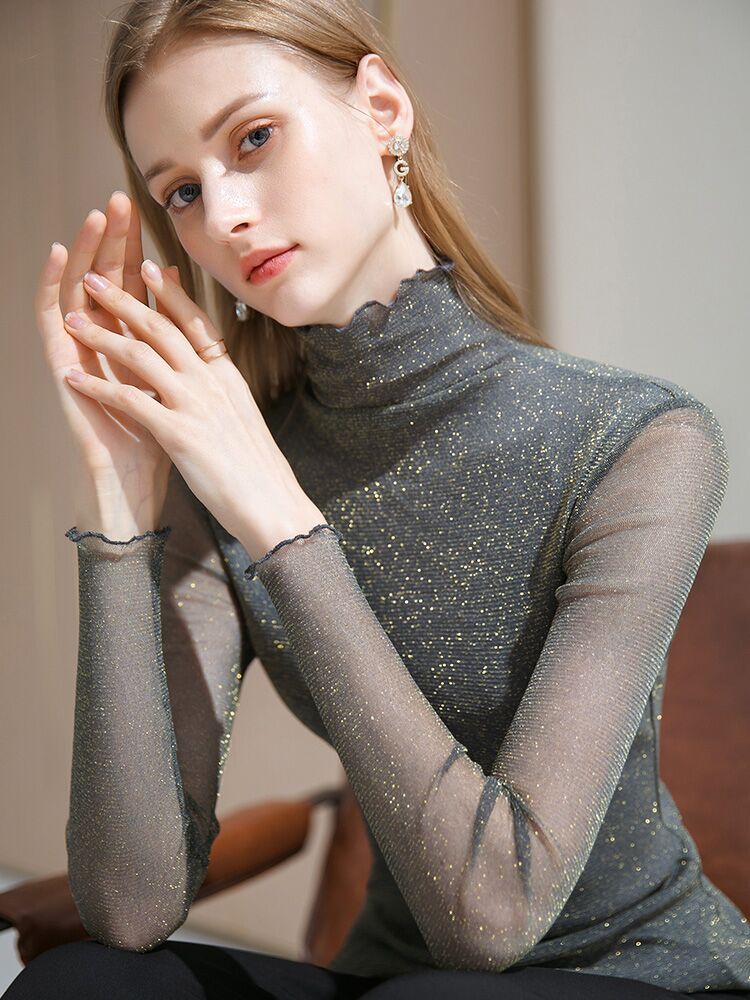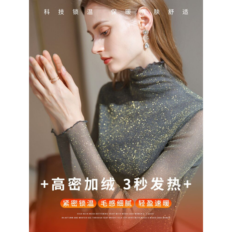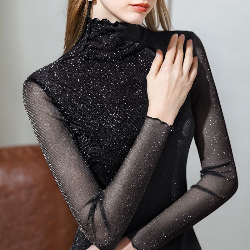 2024 귀 테두리 높은 칼라 메쉬베이스 셔츠 여성용 봄과 가을 서양식 내부 긴팔 티셔츠 섹시한 밝은 실크 탑