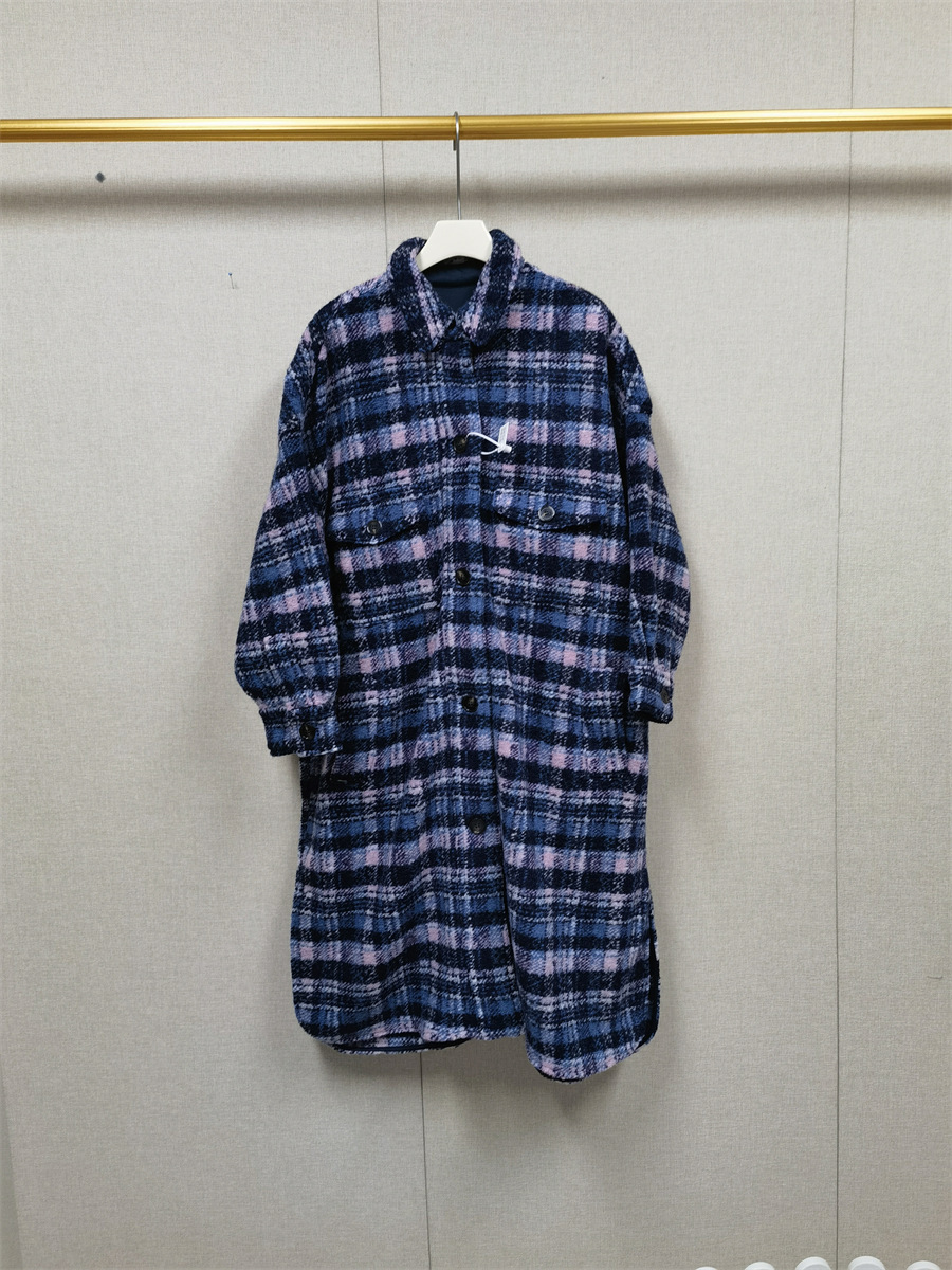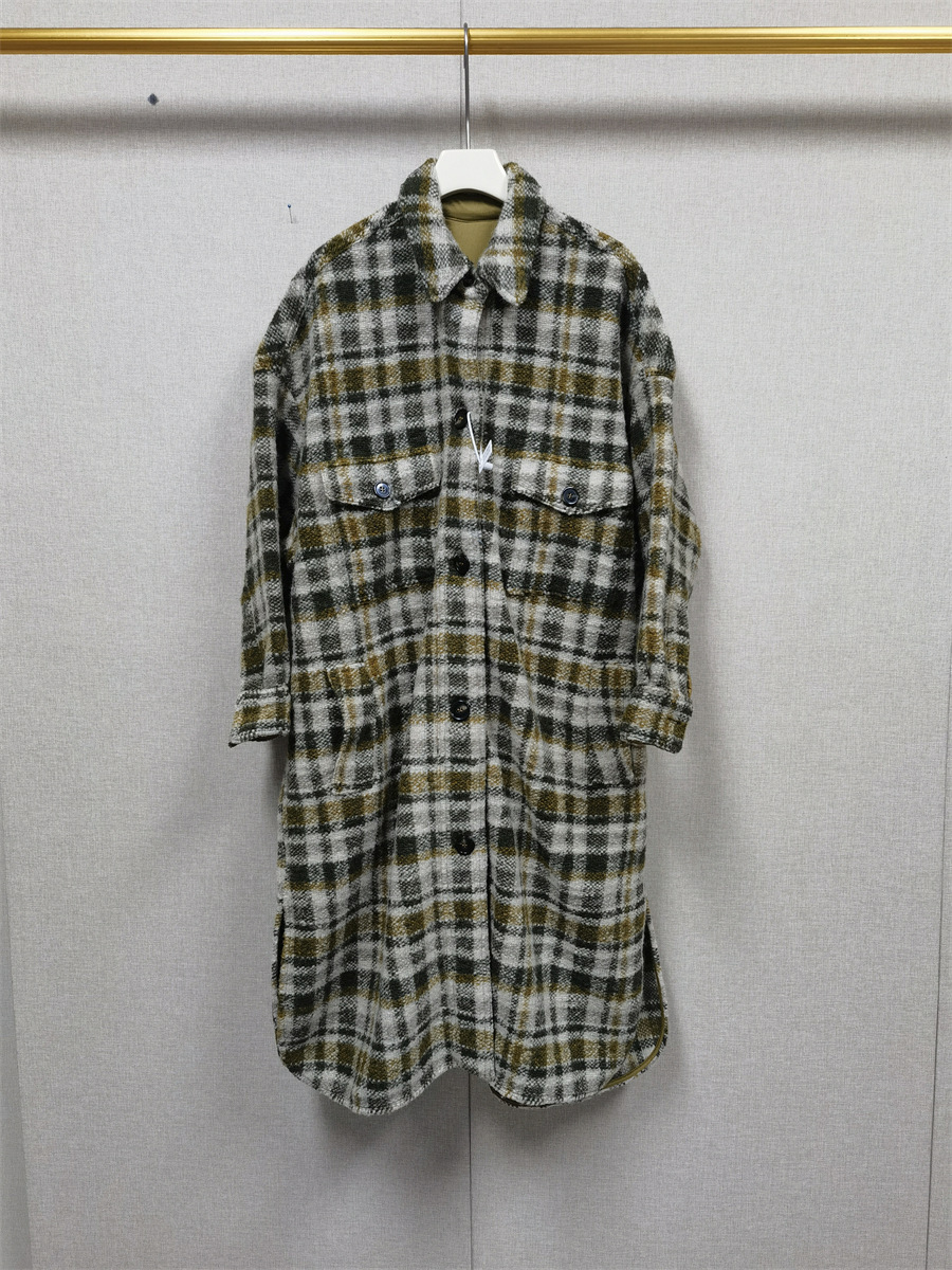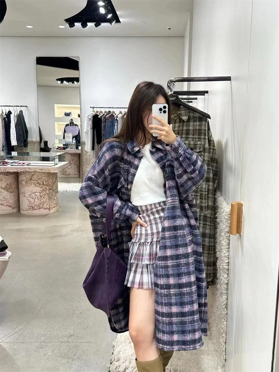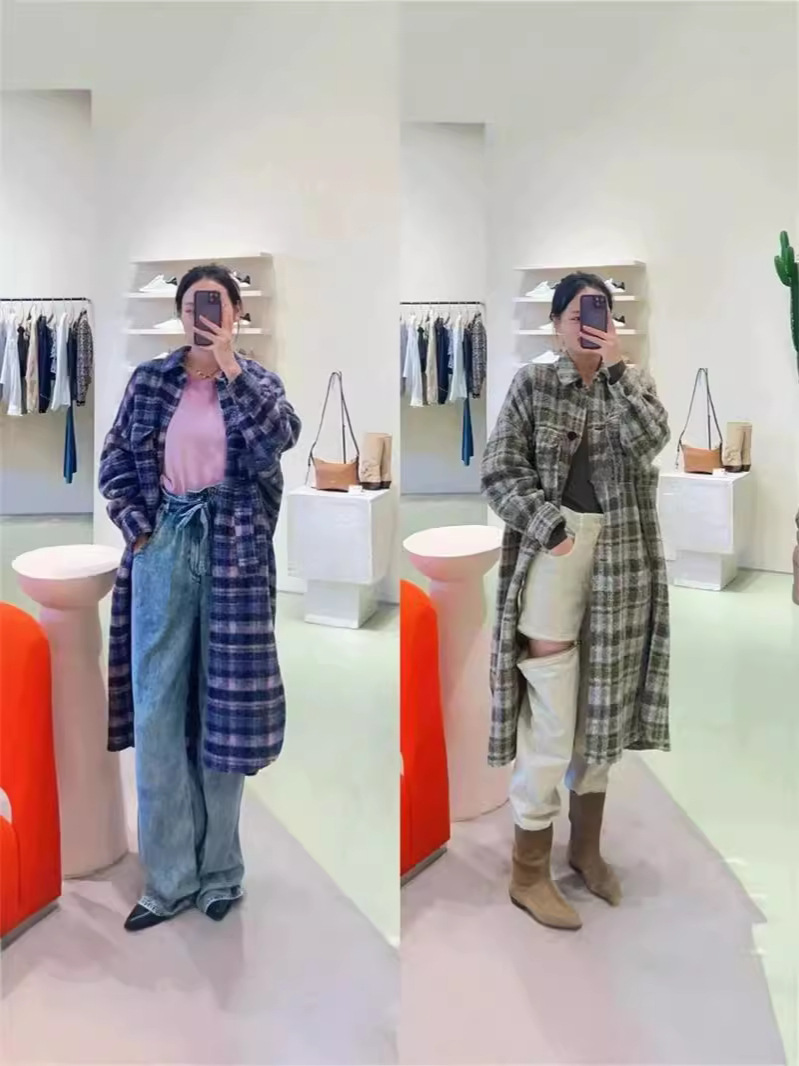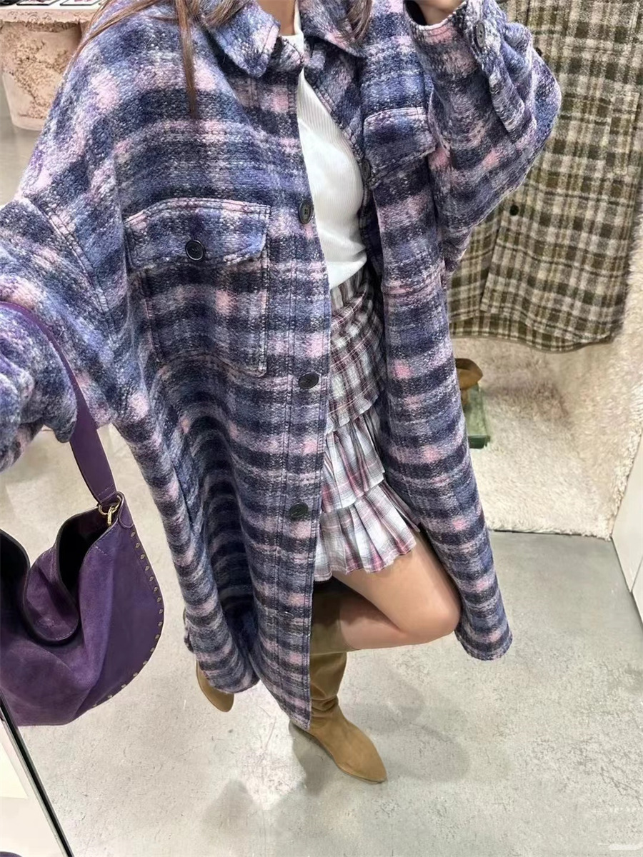 法式小众时髦复古2024秋冬新款羊毛混纺翻领格纹毛呢长款外套大衣