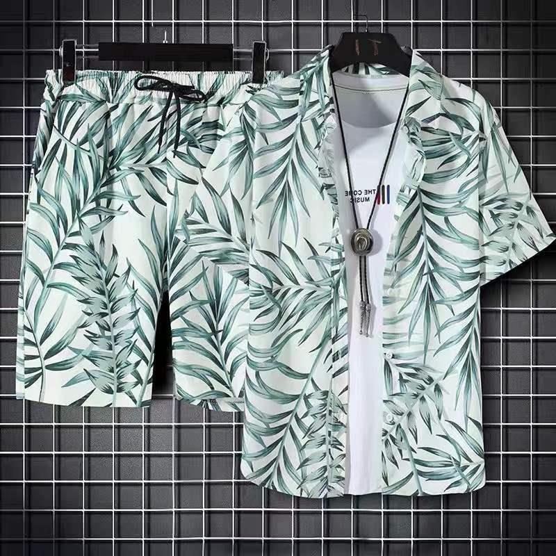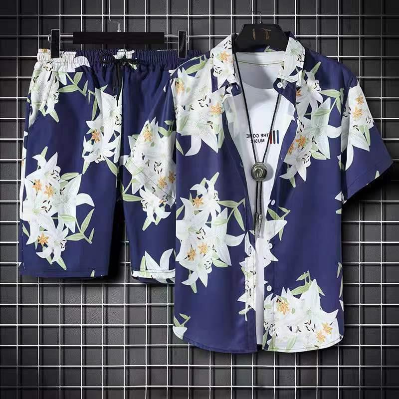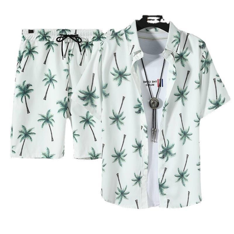태국 여름 남자의 새로운 얇은 느슨한 세트 하와이 꽃 인쇄 해변 짧은 소매 세트 트렌디