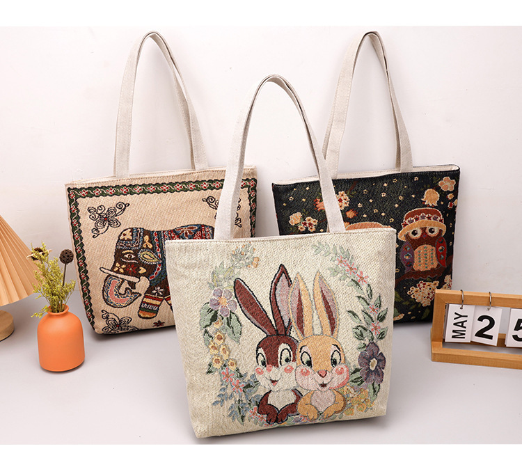 도매 새로운 양면 골드 자카드 자수 토끼 코끼리 공작 어깨 가방 민족 스타일 휴대용 통근 가방