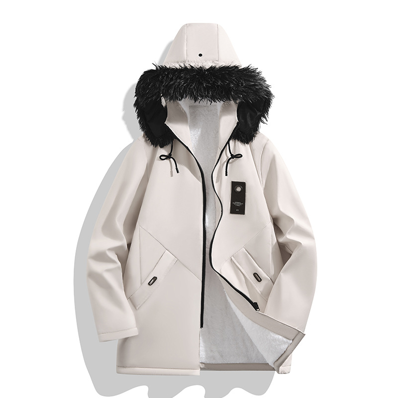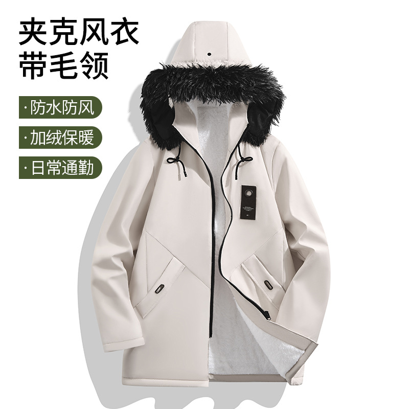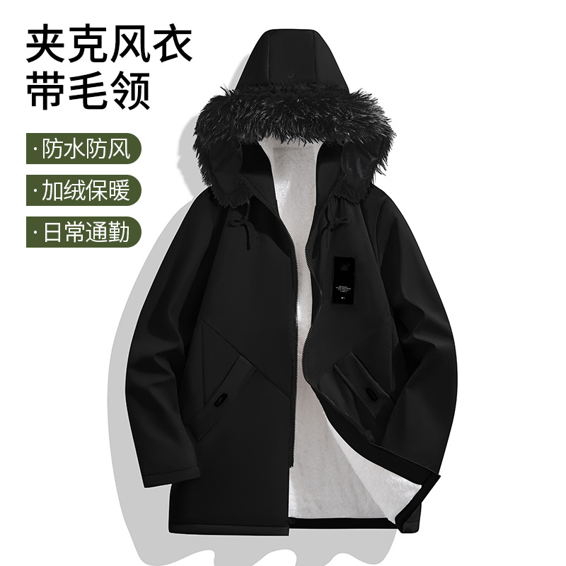 알리 후 남자의 겨울 새 후드 기모 모피 칼라 라인 양고기 양털 긴팔 자켓이있는 중간 길이의 윈드 브레이커