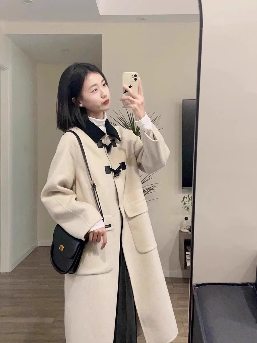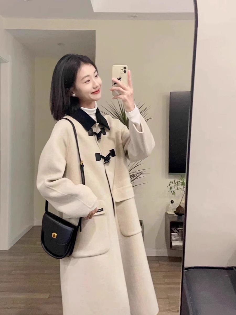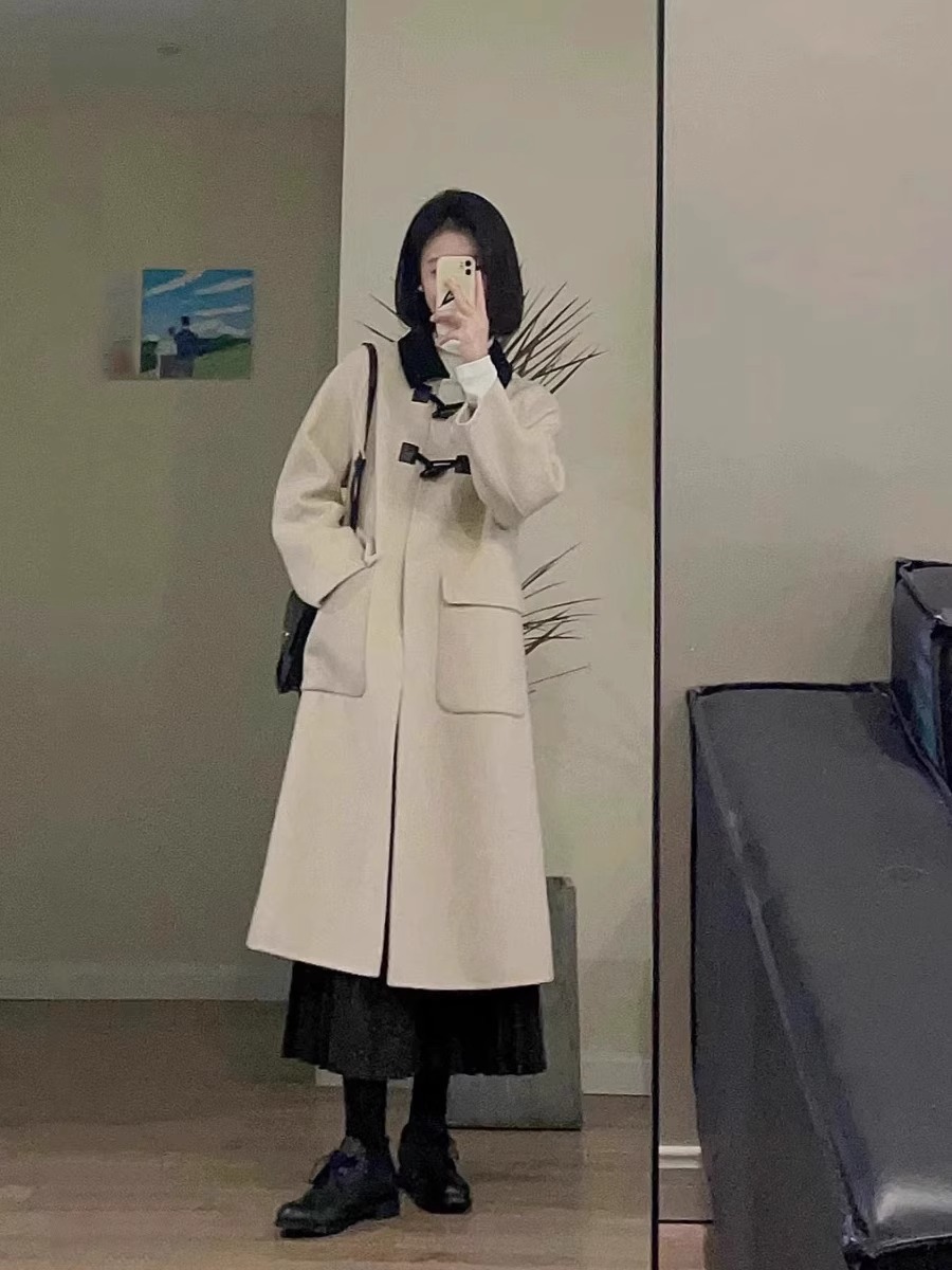 코너 버튼 모직 코트 여자 중간 길이 2024 새로운 가을과 겨울 한국 느슨한 모직 코트