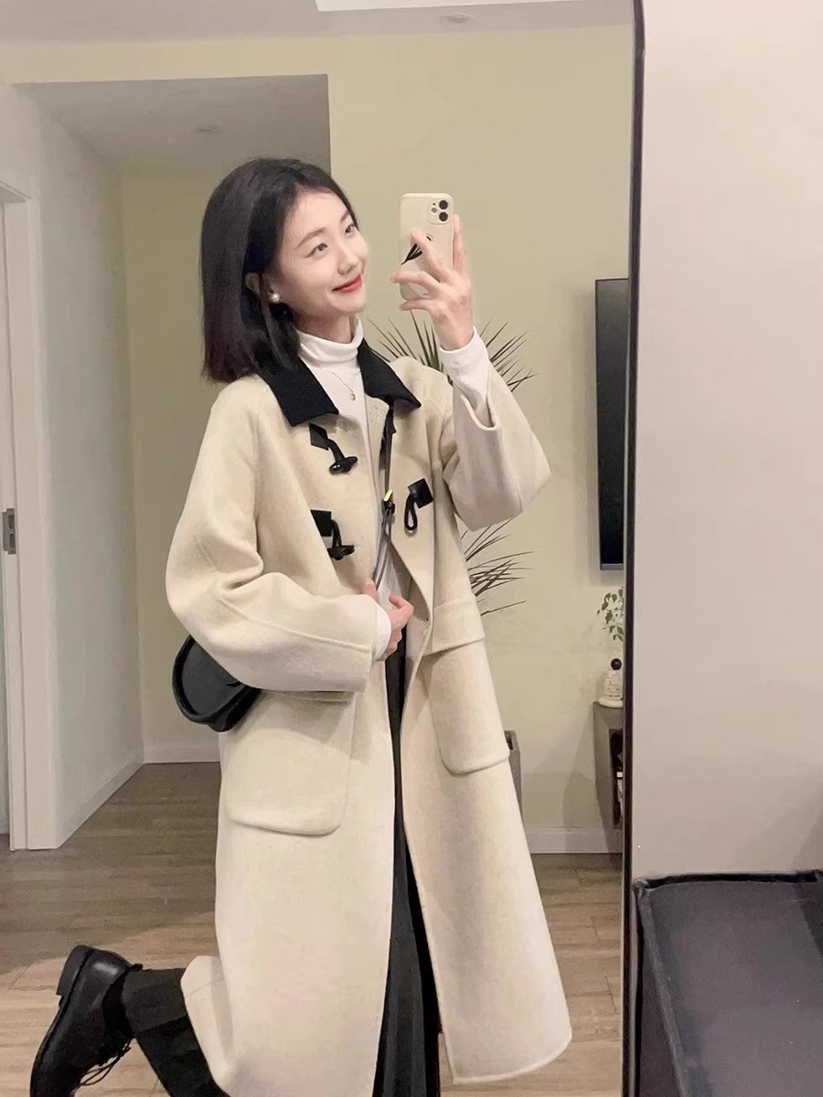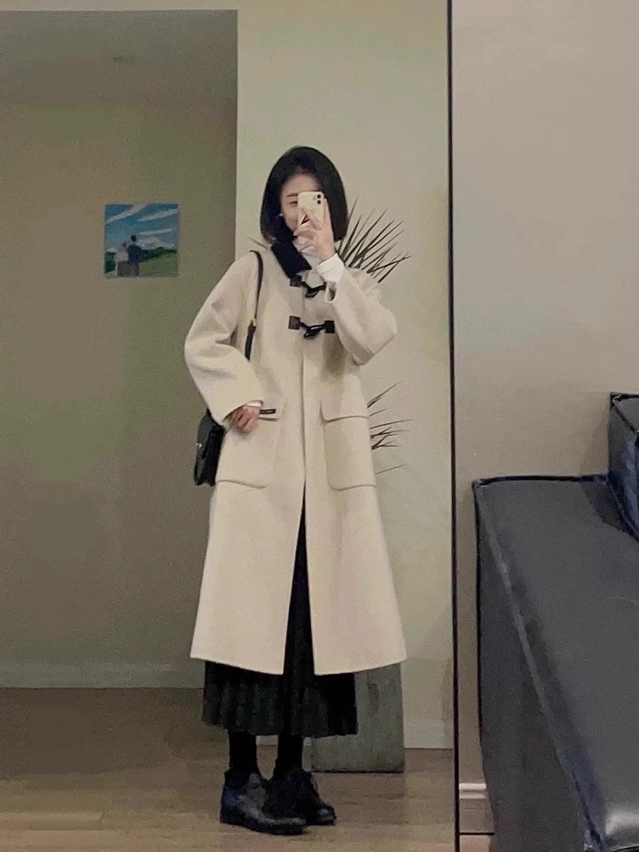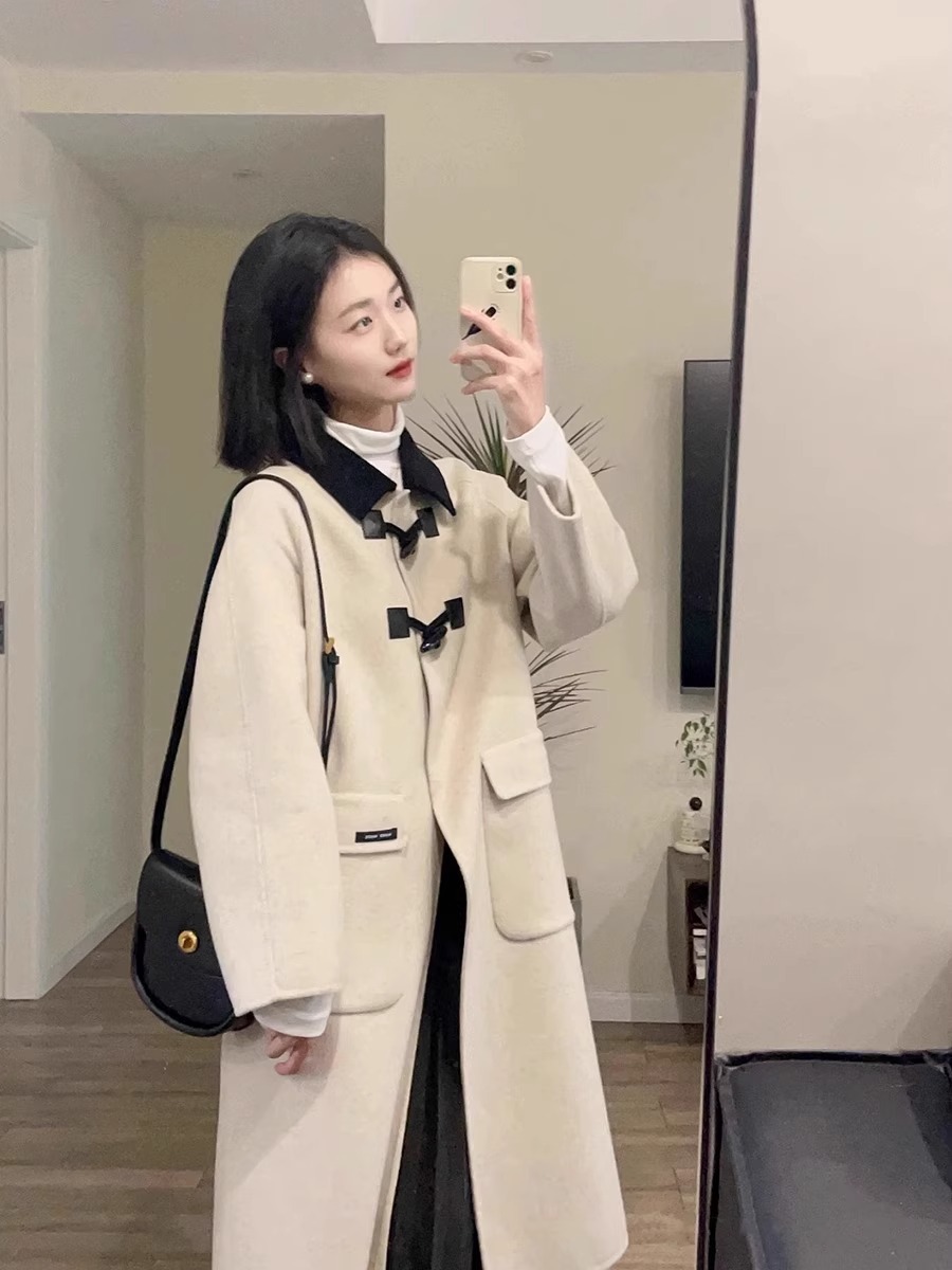 코너 버튼 모직 코트 여자 중간 길이 2024 새로운 가을과 겨울 한국 느슨한 모직 코트
