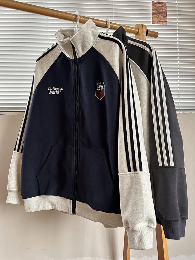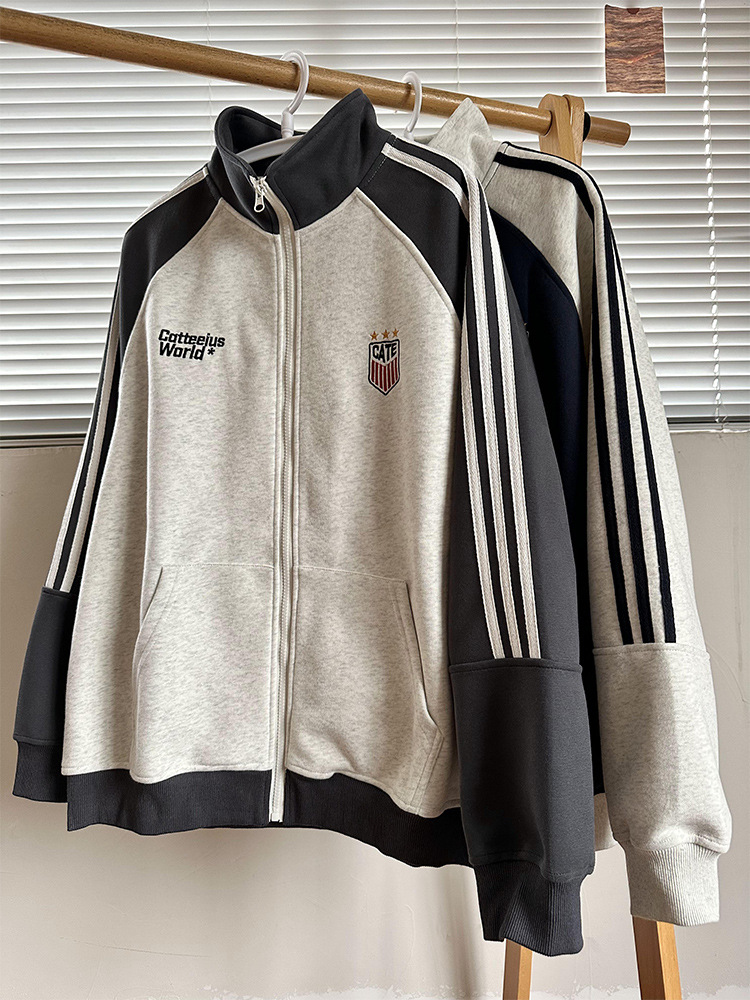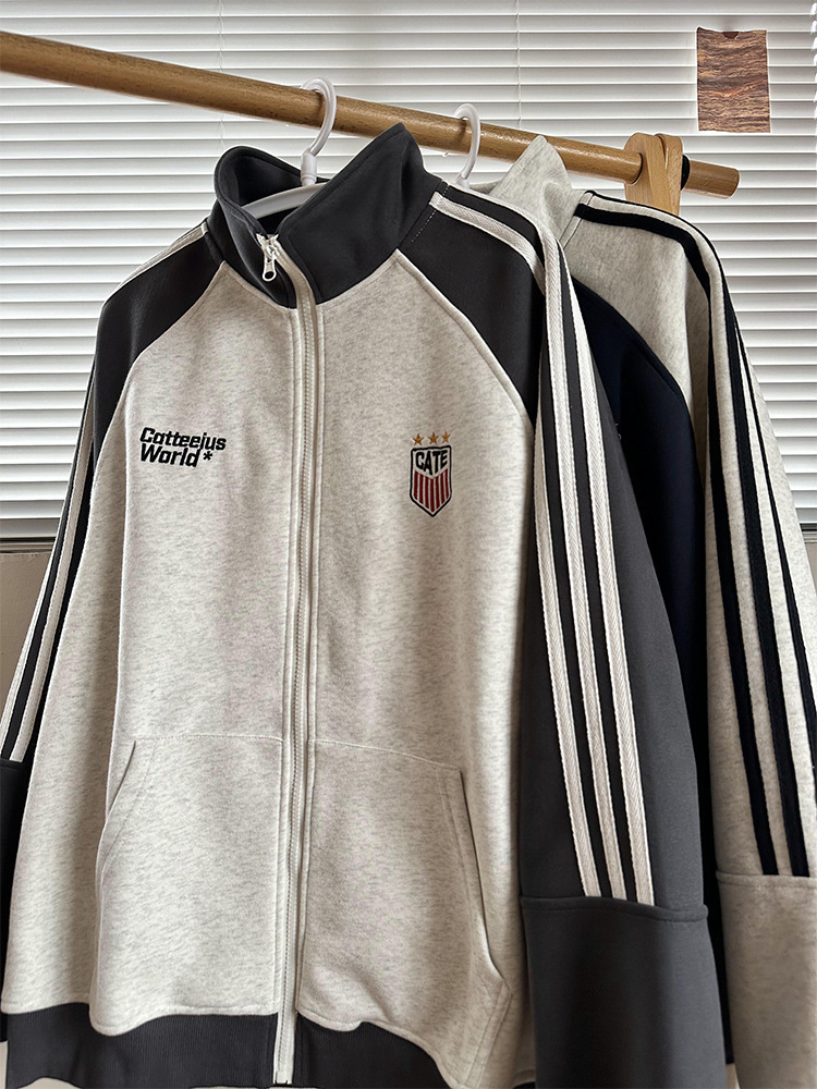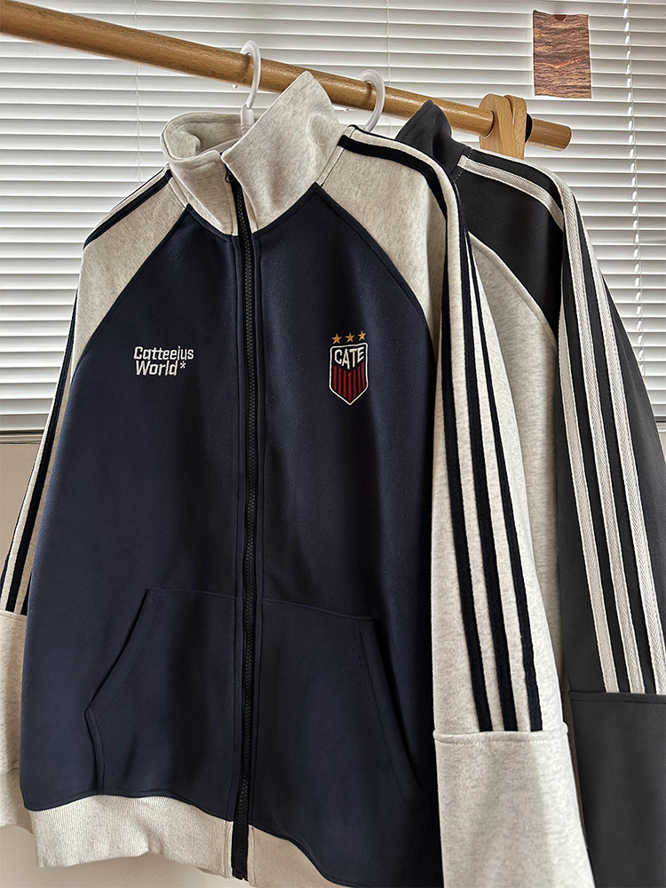미국식 레트로 3 바 재킷 남자 봄과 가을 라글란 슬리브 카디건 스웨터 유행 콘트라스트 컬러 스포츠 캐주얼 야구 세트