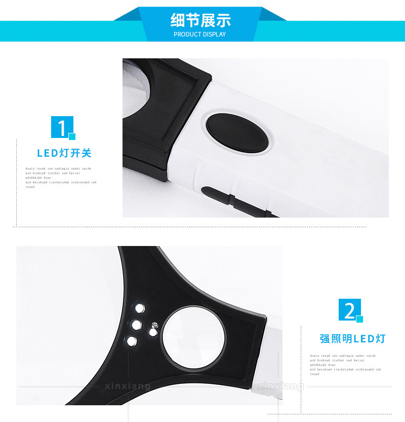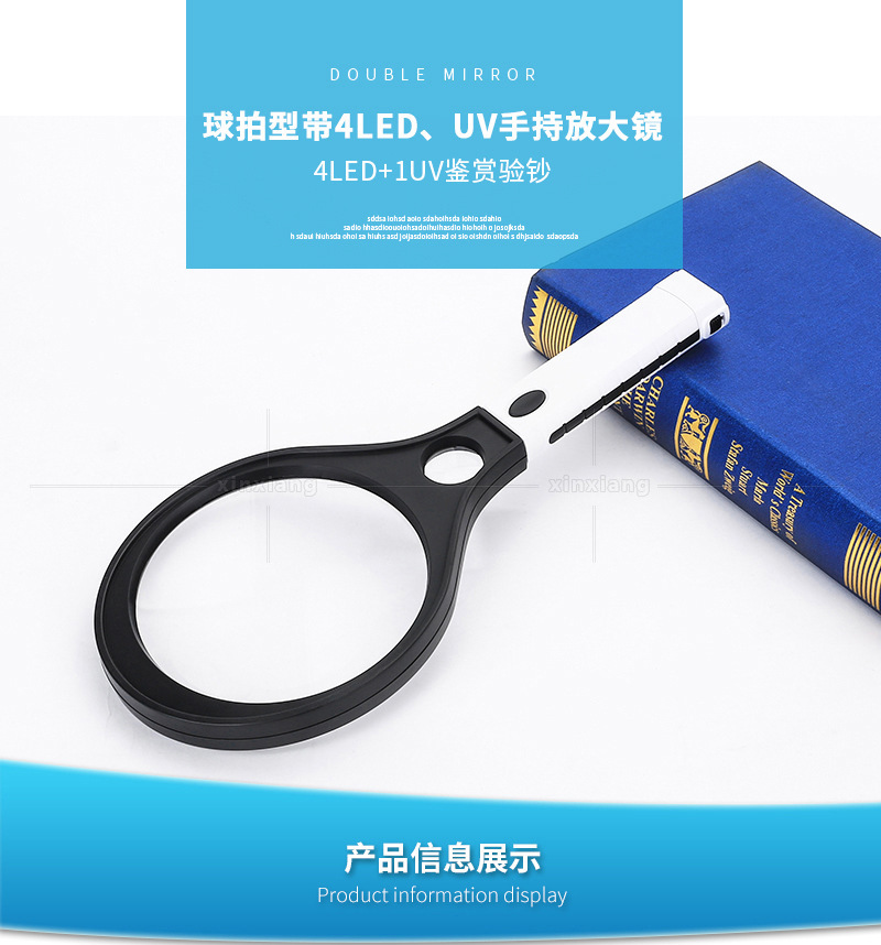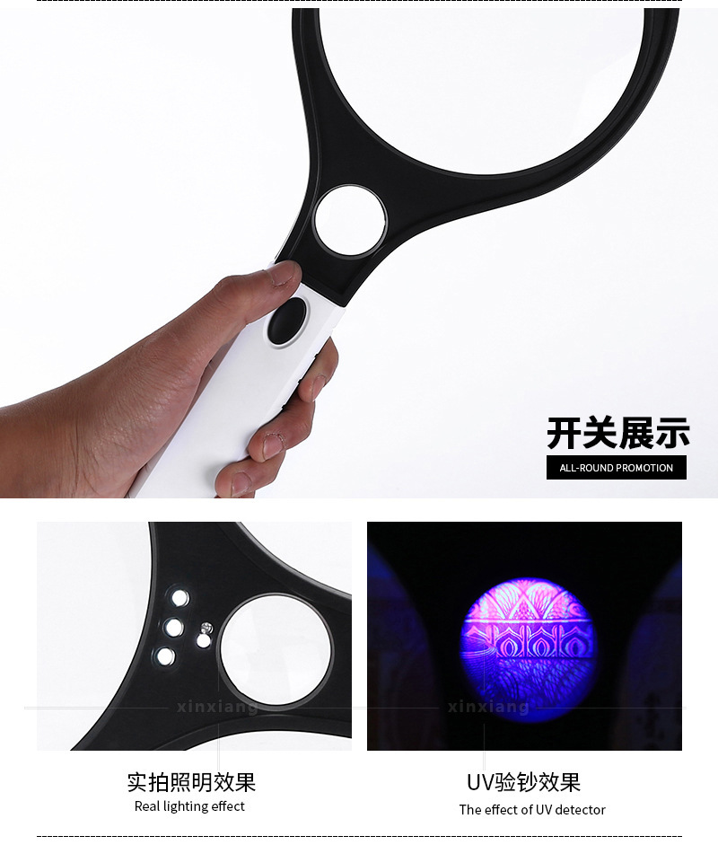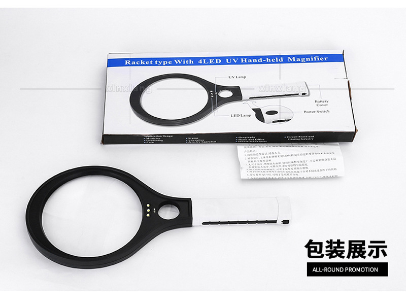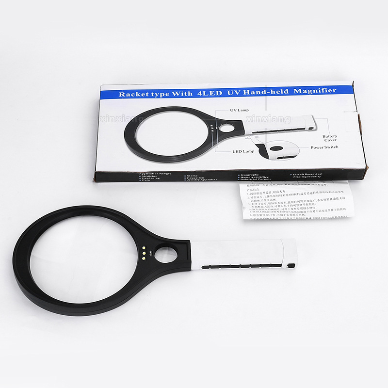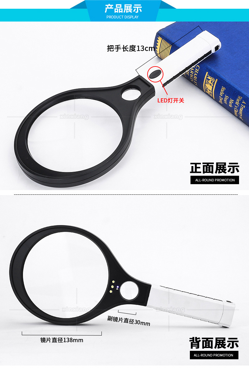 노인 핸드 헬드 대형 돋보기 휴대용 고화질 실용적인 LED 돈 탐지기 램프가있는 138mm 대형 라켓 유형