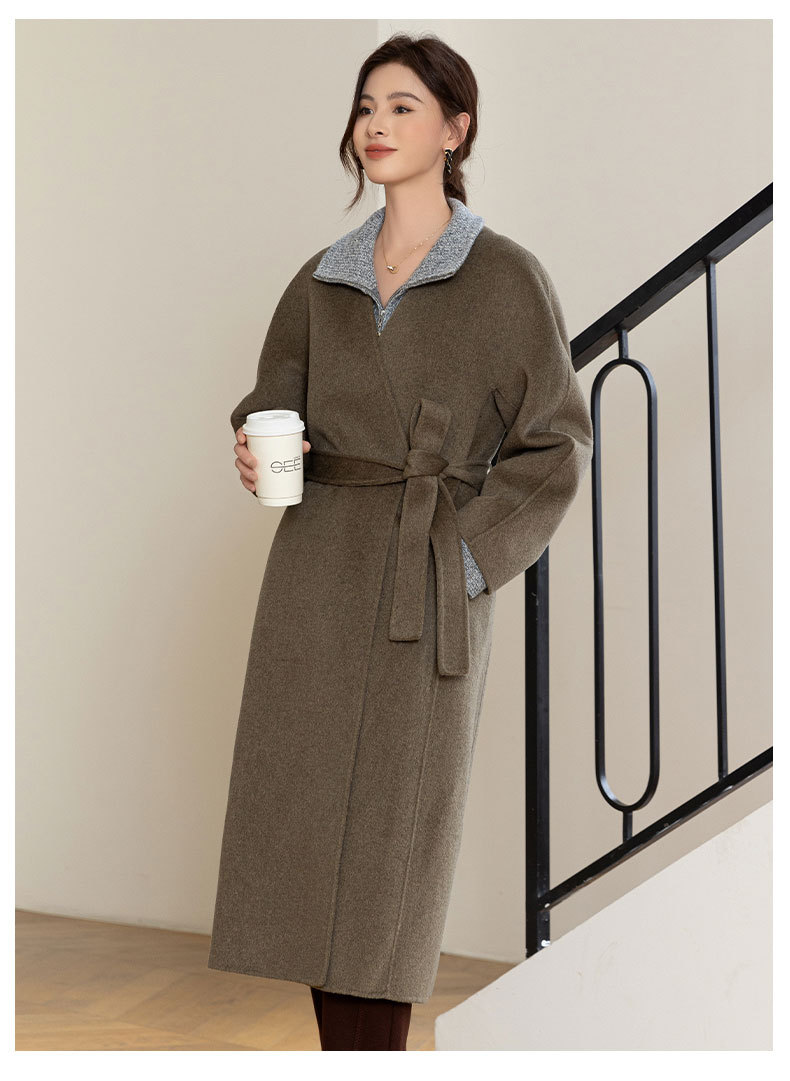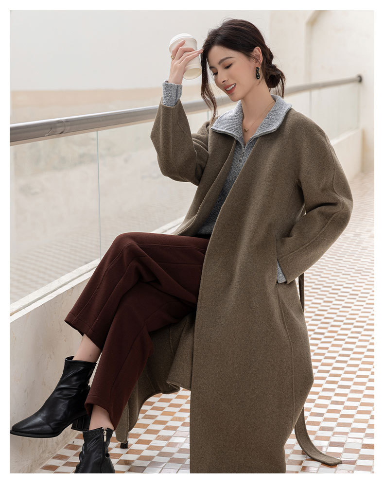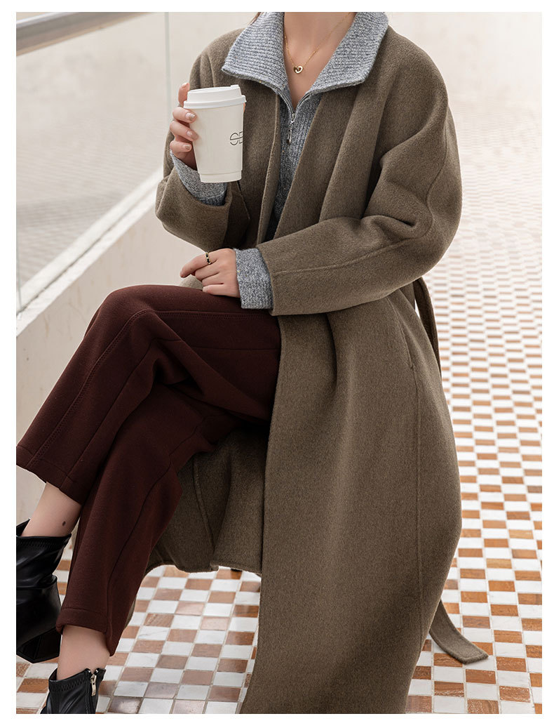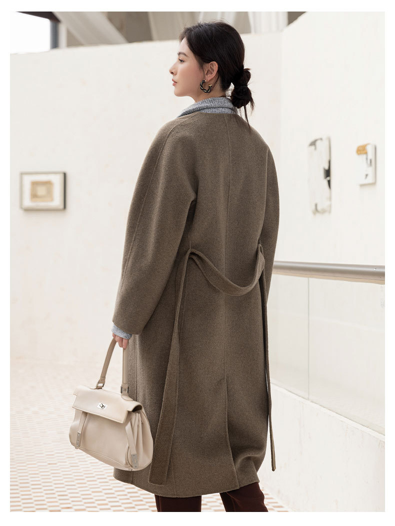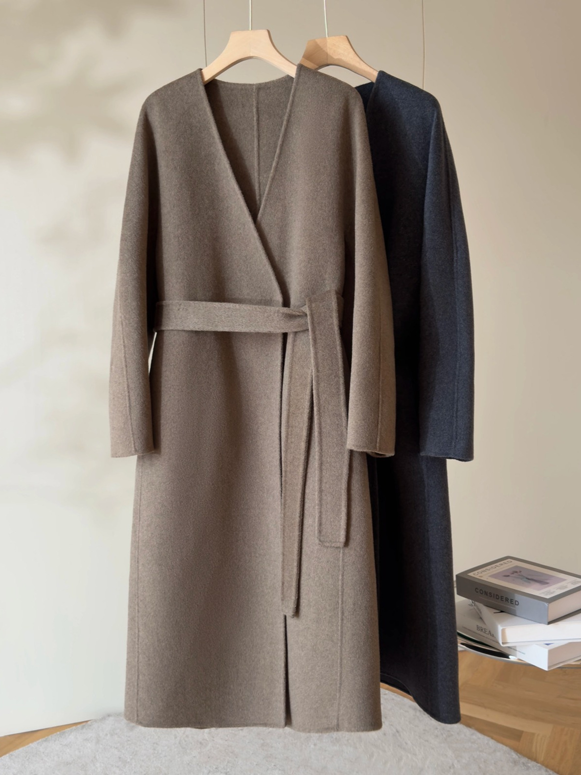 엔디 레이스 업 캐시미어 코트 여자 2024 년 겨울 새로운 V-넥 그레이 더블 페이스 롱 코트