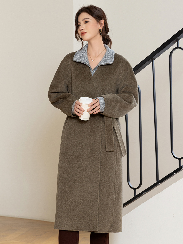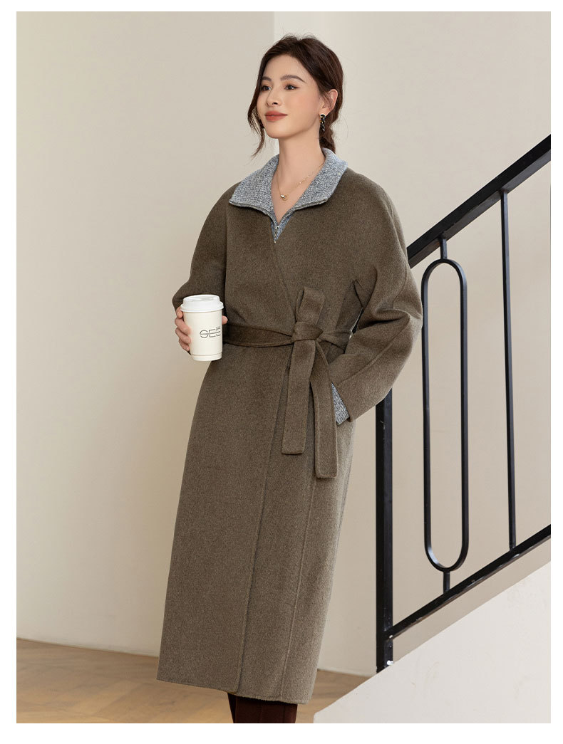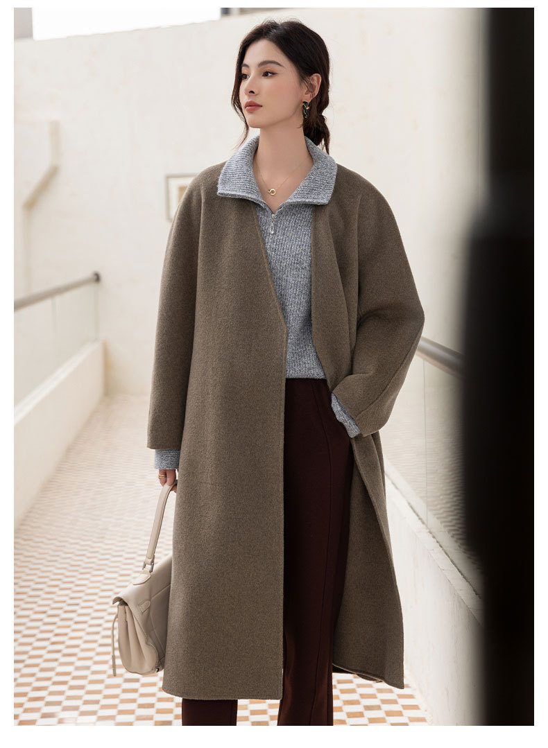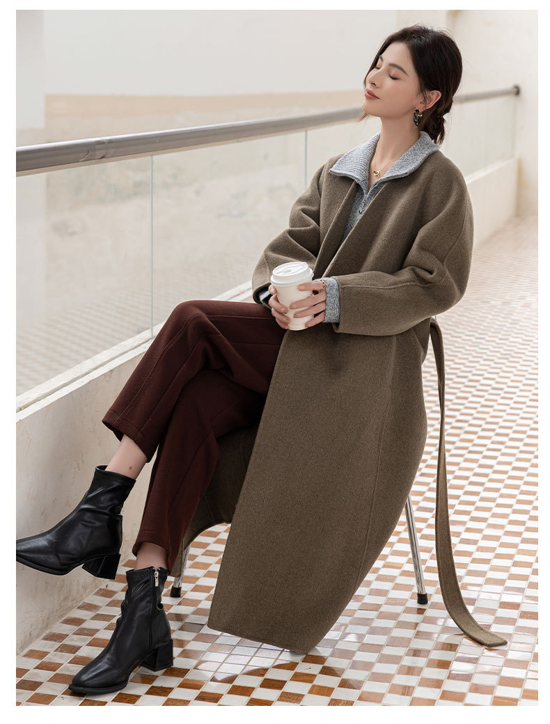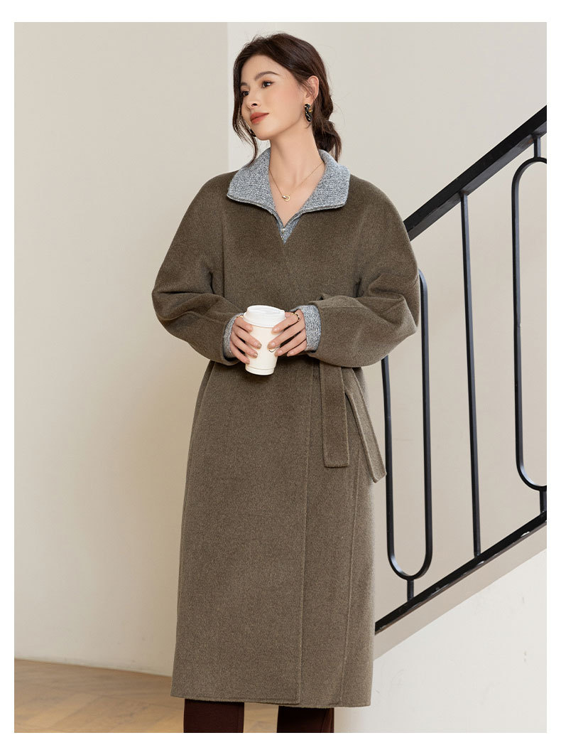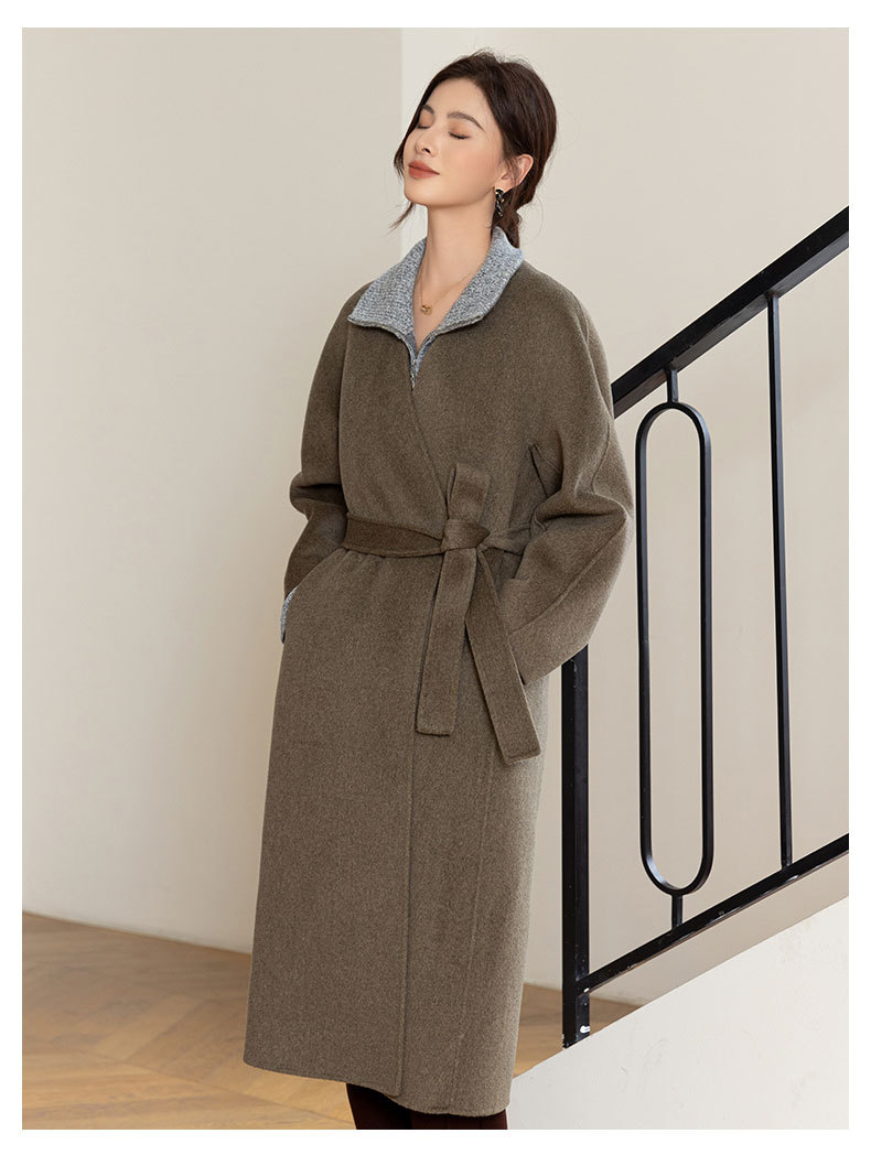 엔디 레이스 업 캐시미어 코트 여자 2024 년 겨울 새로운 V-넥 그레이 더블 페이스 롱 코트