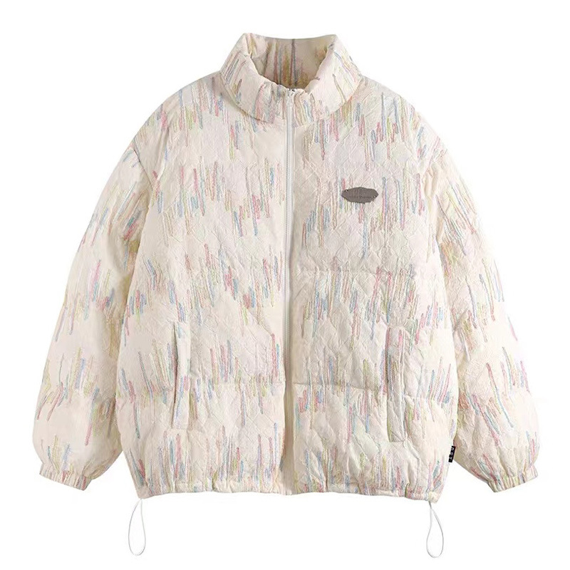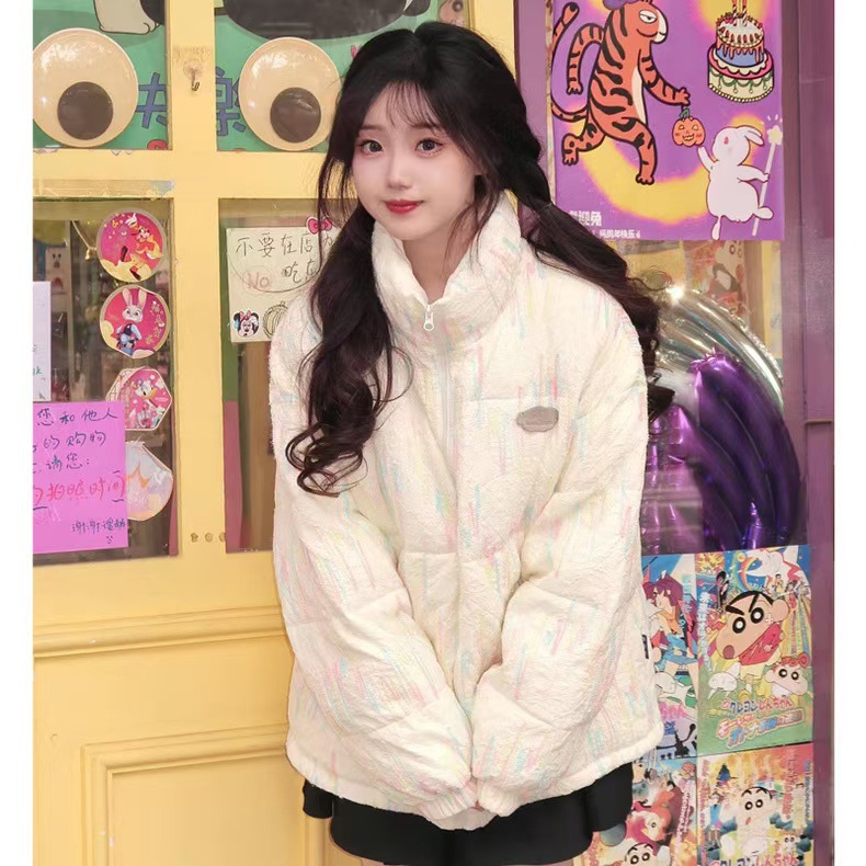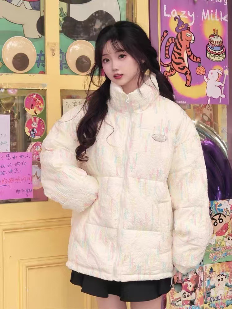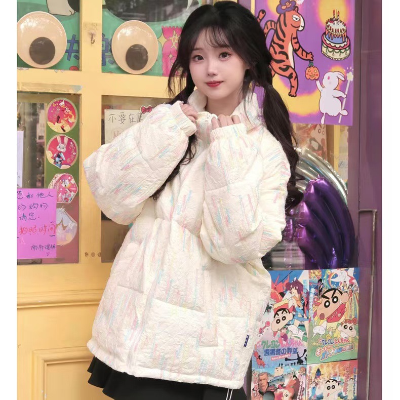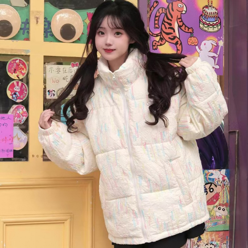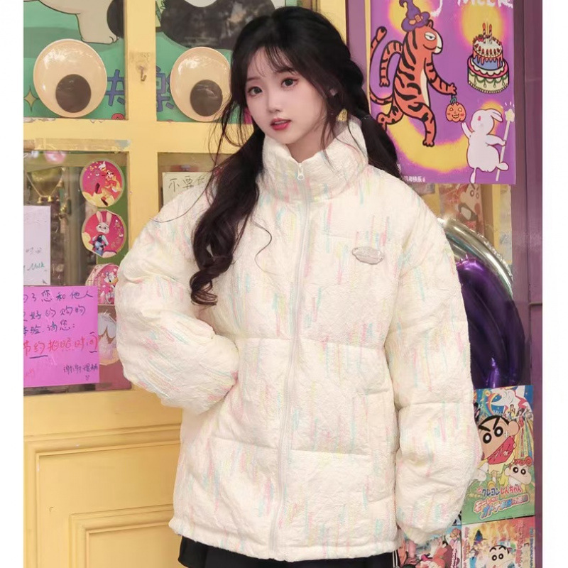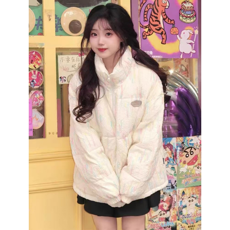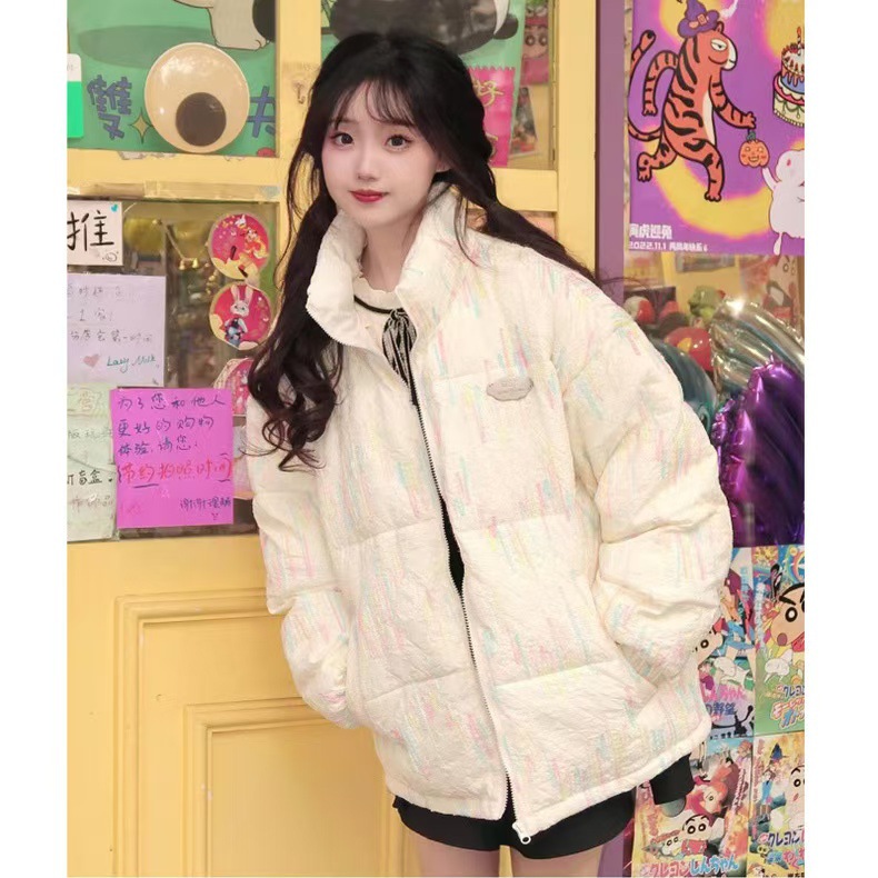 무지개 주름 칼라 빵 세트 2024 새로운 우유 Huhu 느슨한 면화 패딩 재킷 Ins 아카데미 스타일 코트