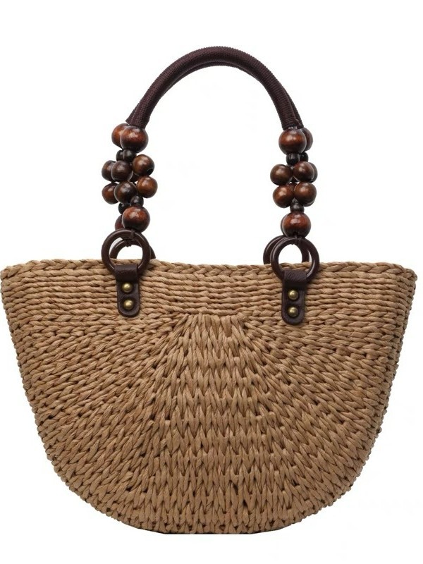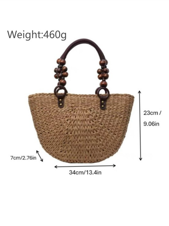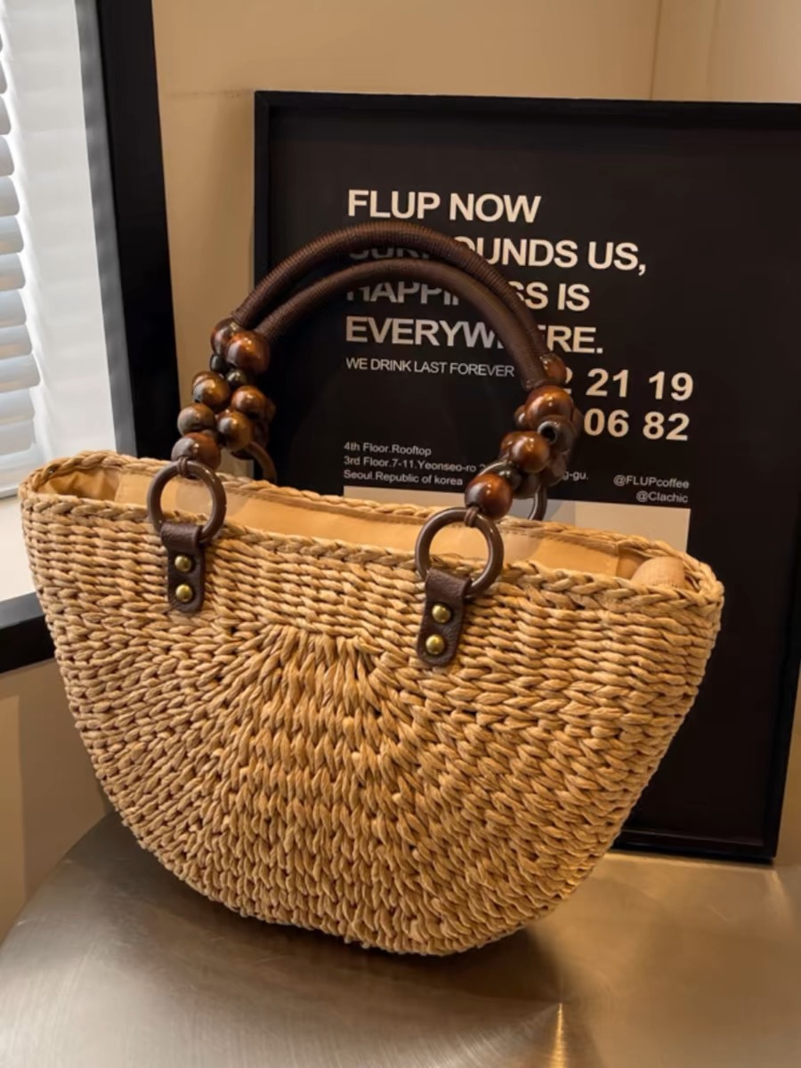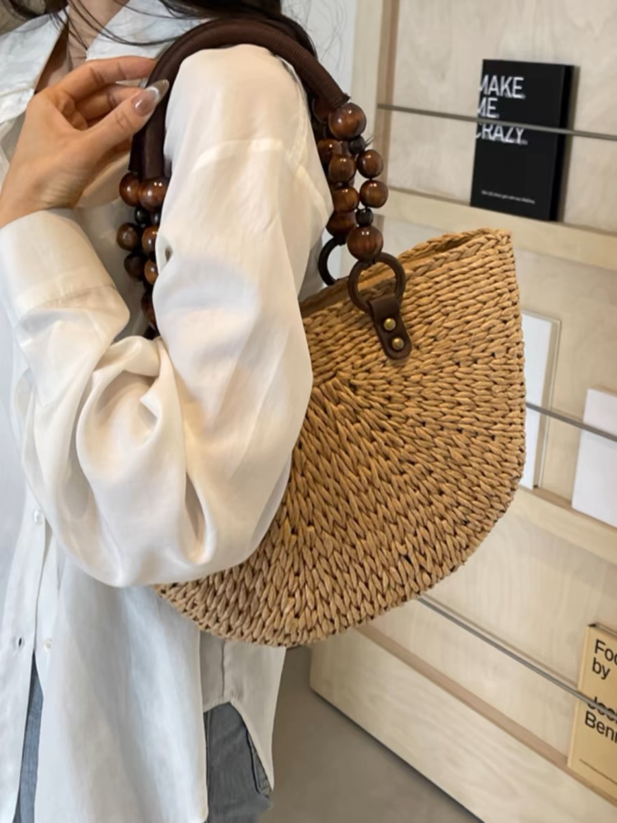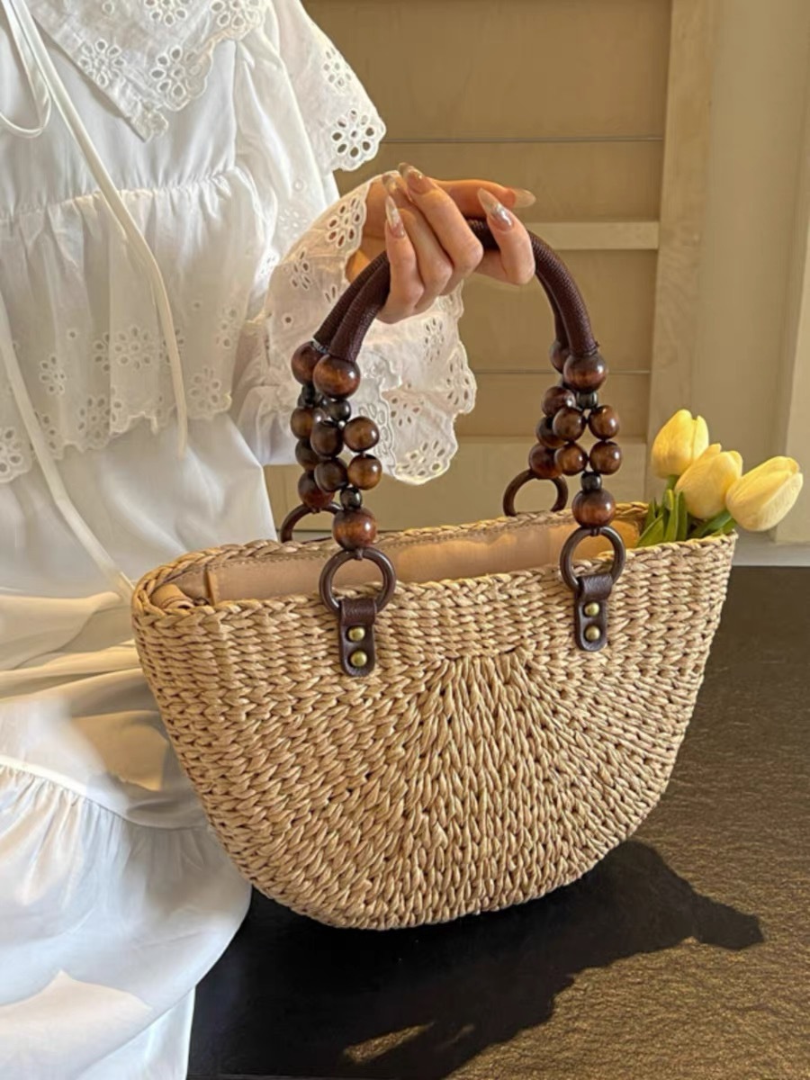 나무구슬 장식 휴대용 밀짚가방, 손으로 짠 가방, 대용량 토트백, 여성용 숄더백, 바구니형 가방, 휴가용 비치백