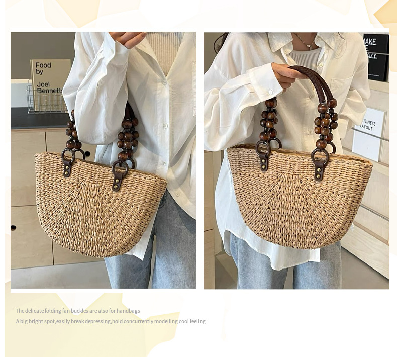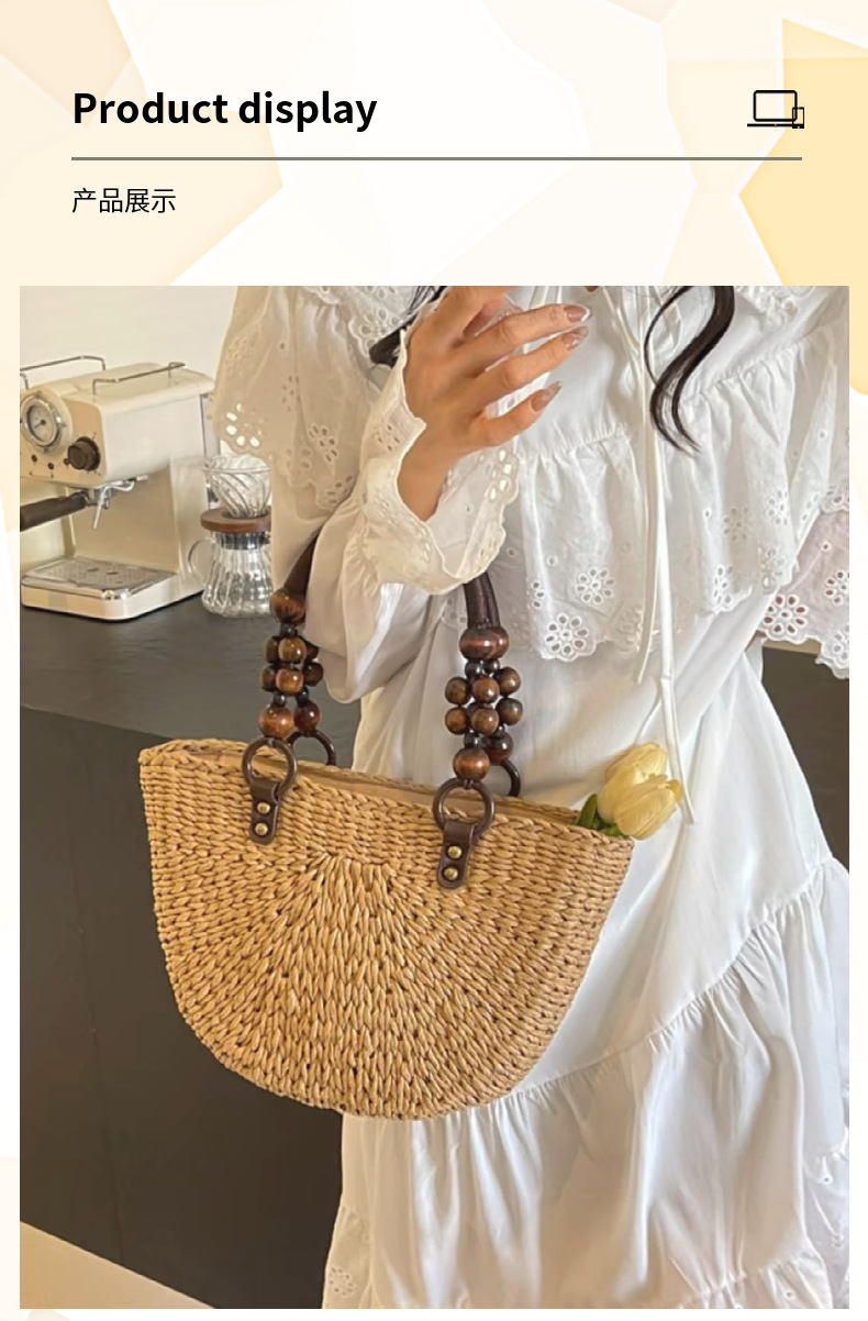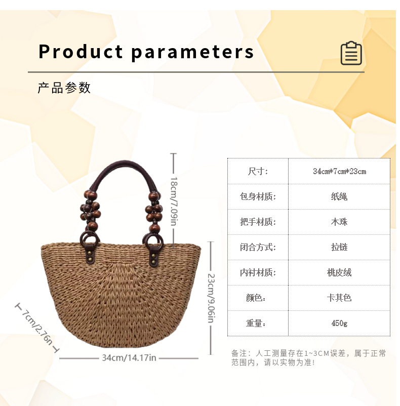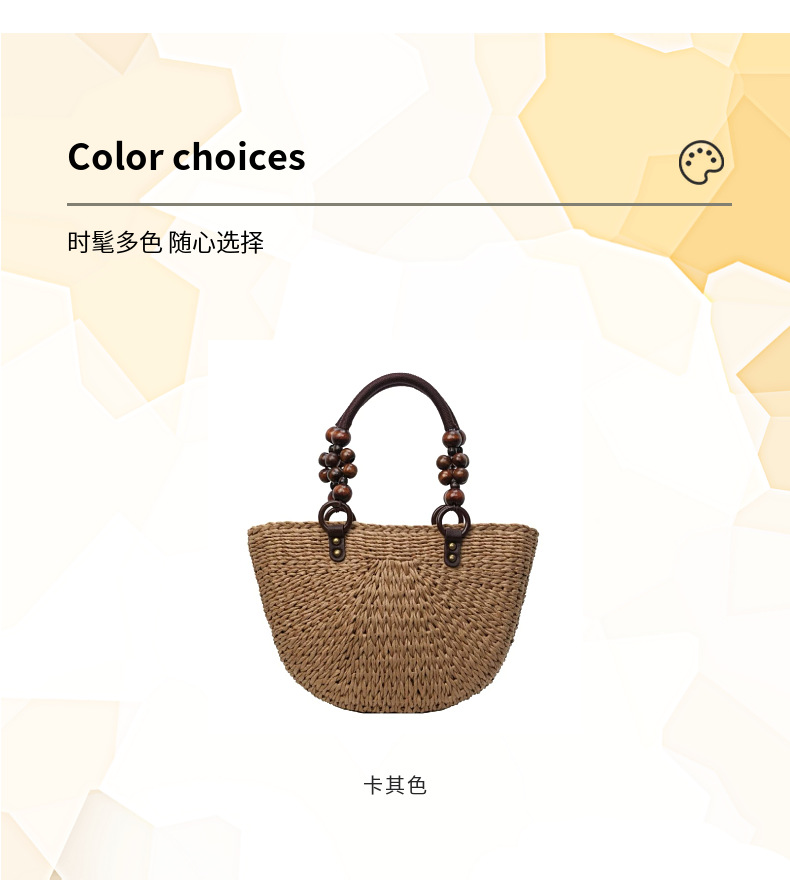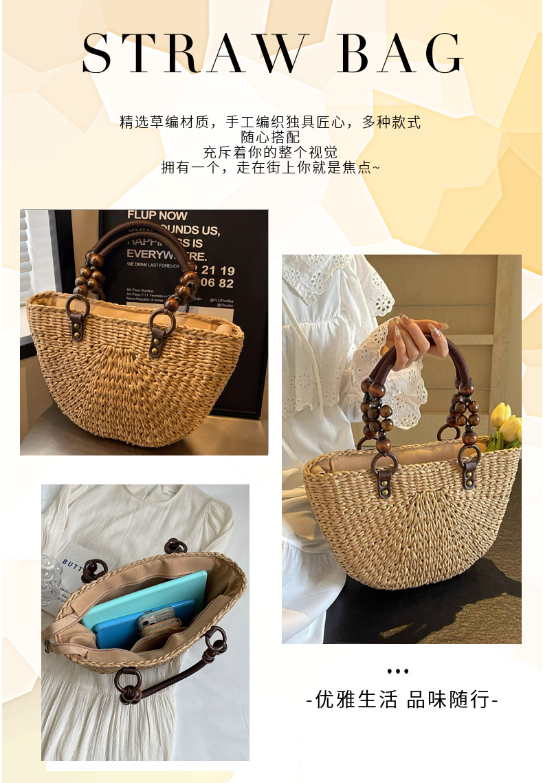 나무구슬 장식 휴대용 밀짚가방, 손으로 짠 가방, 대용량 토트백, 여성용 숄더백, 바구니형 가방, 휴가용 비치백