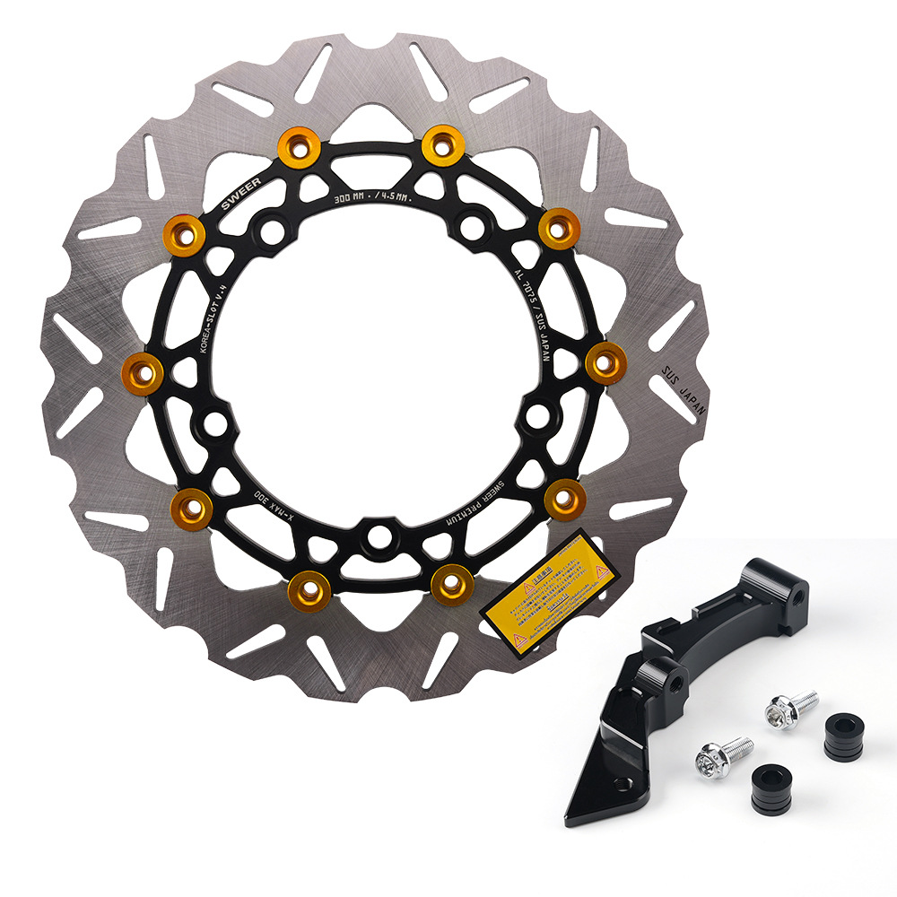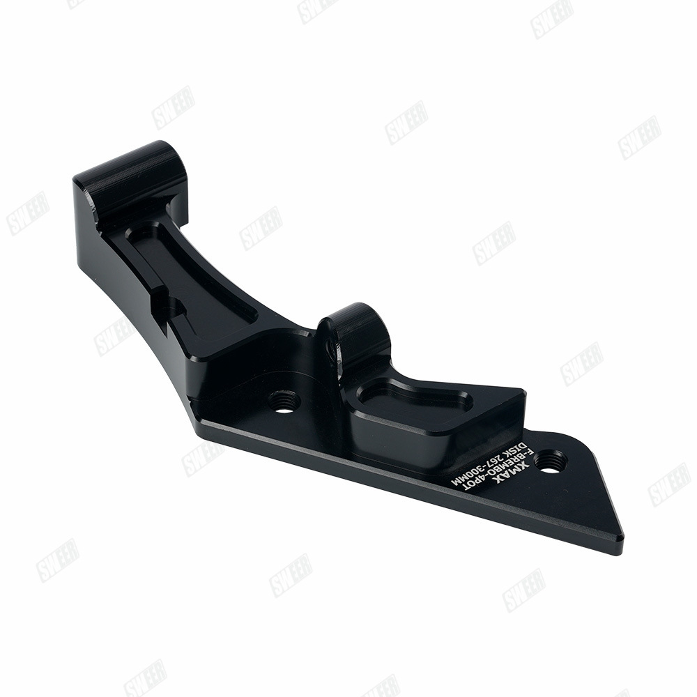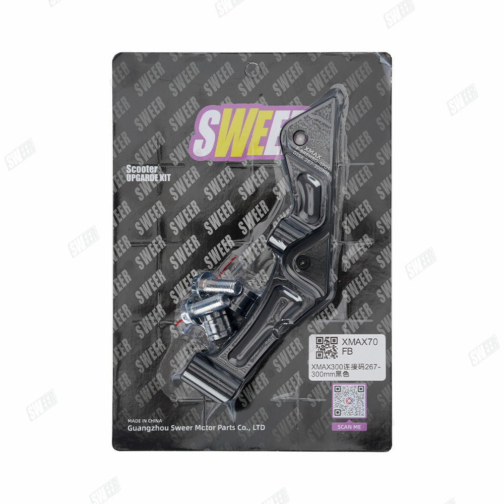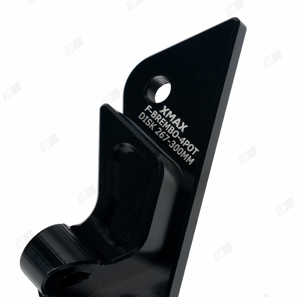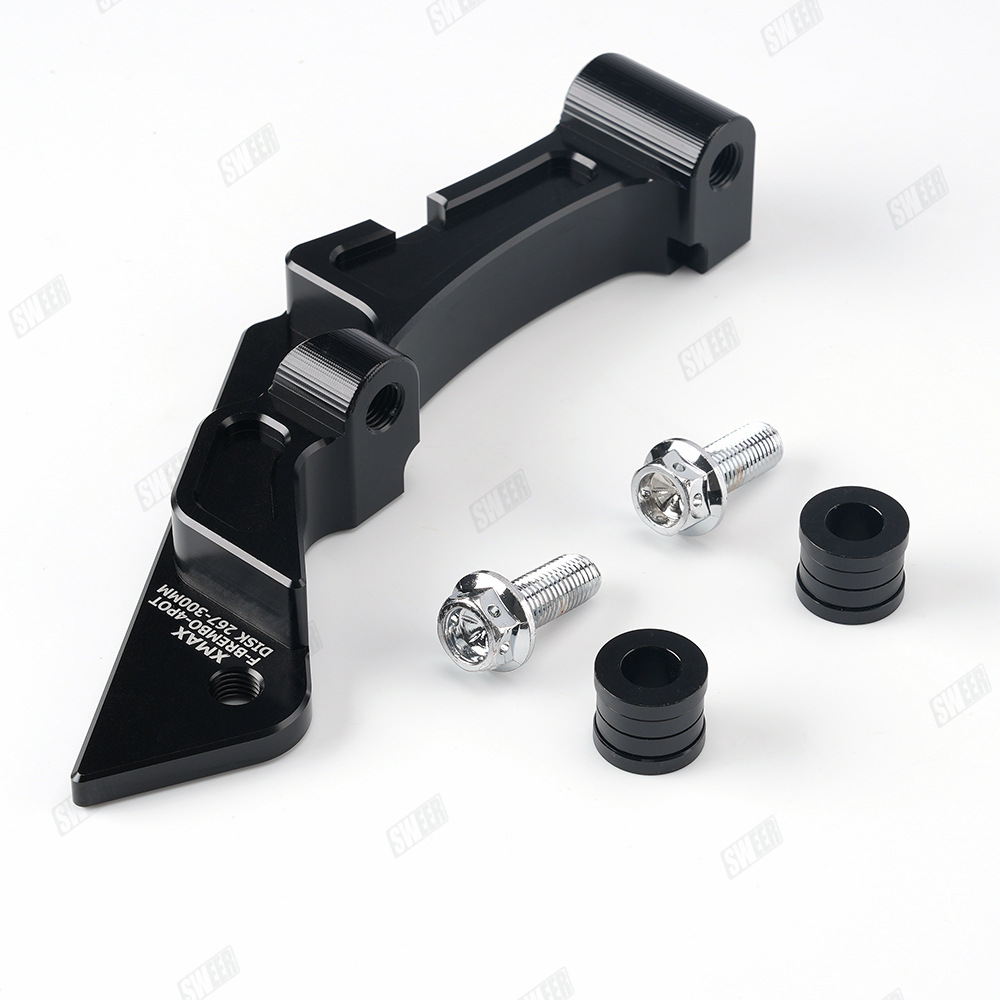 xmax300原车前轮267mm刹车盘的卡钳,如果改鲍鱼卡钳+267mm或者300mm浮动刹车盘需要用此 卡钳转接码(267mm刹车盘直上,300mm刹车盘需要加衬套增大),配高品质不锈钢加固螺丝,下图刹车盘300mm展示效果,产品不带刹车盘,够买300mm刹车盘连接