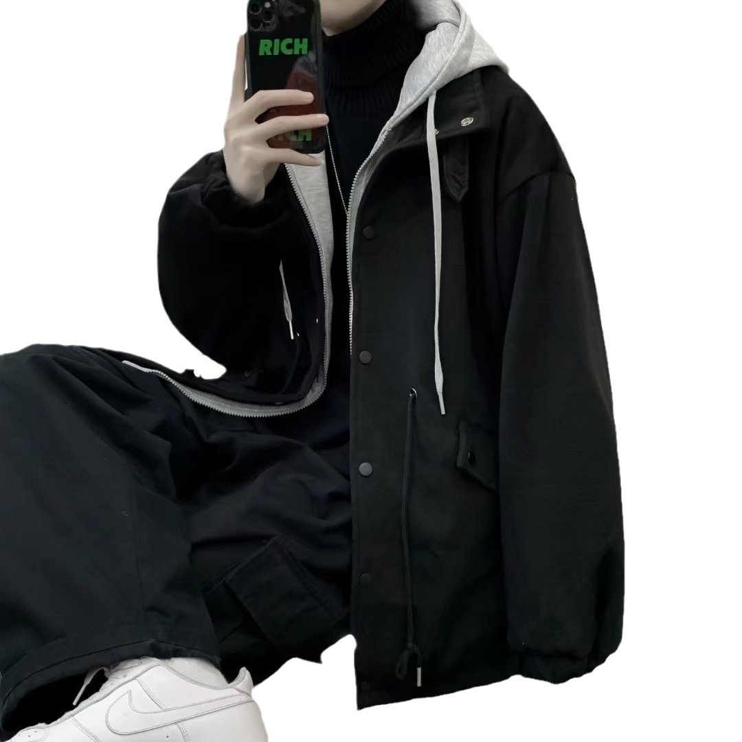 겨울 가짜 투피스 루즈 인 홍콩 스타일 의류 남성 가을과 겨울 두꺼운 모직 재킷 캐주얼 후드 모직 코트