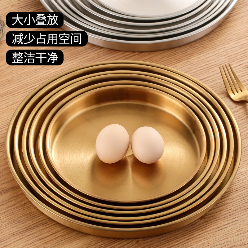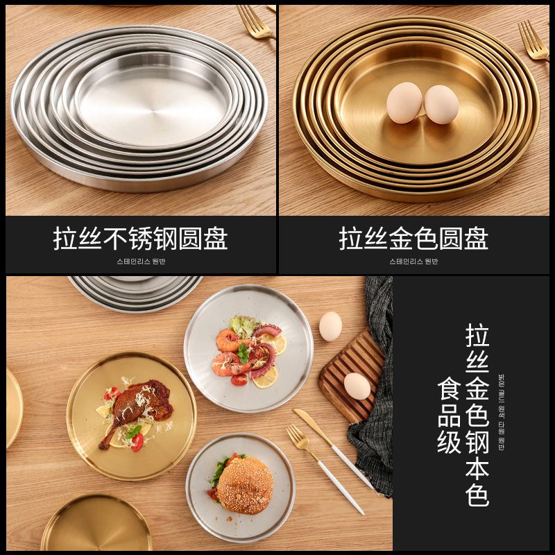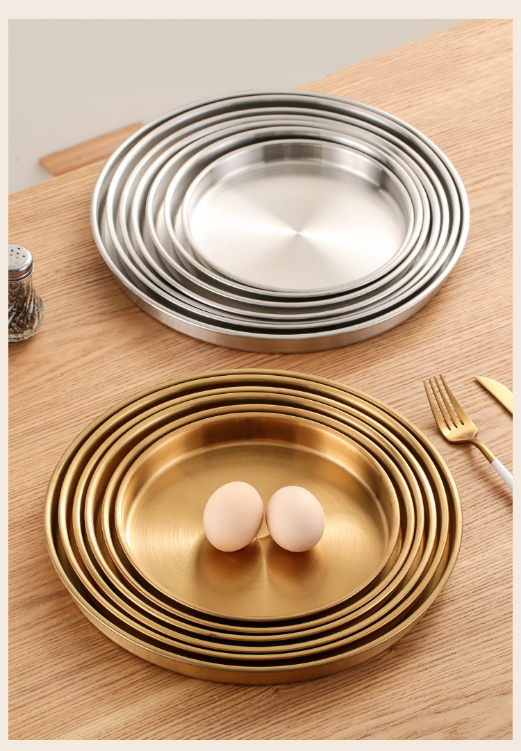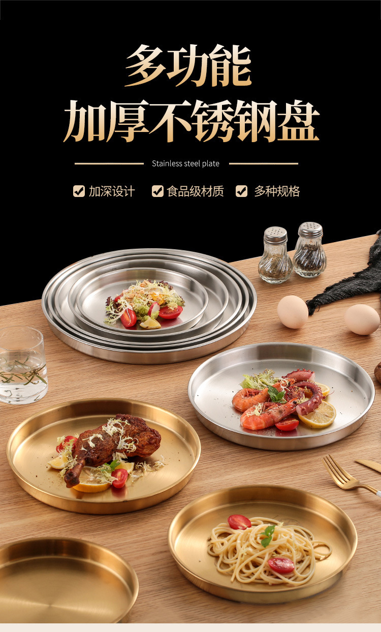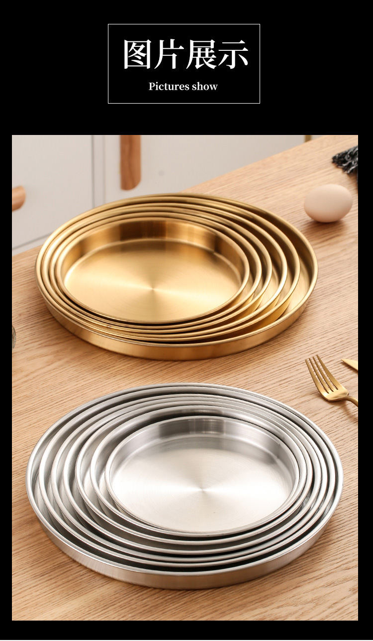 스테인레스 스틸 디스크 상업용 플랫 하단 얕은 플레이트 대형 트레이 라운드 바베큐 플레이트 쌀 그릇 플레이트 스팀 플레이트 디저트 과일 플레이트