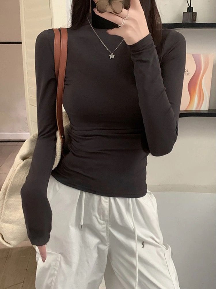 여성용 하프 터틀넥 긴팔 티셔츠, 초가을 디자인, 주름 슬림핏 탑, 슬림하고 우아한 기질