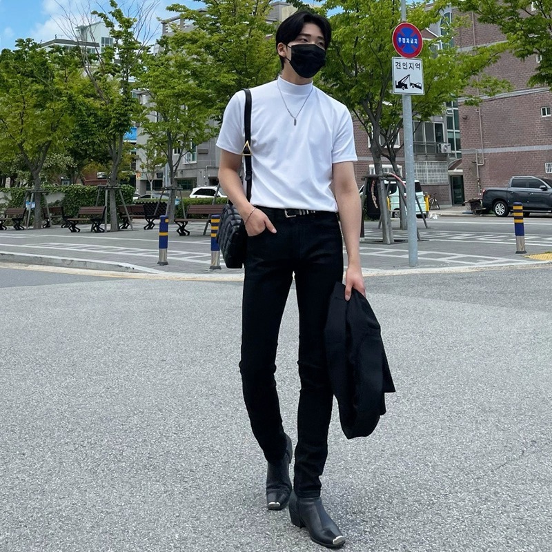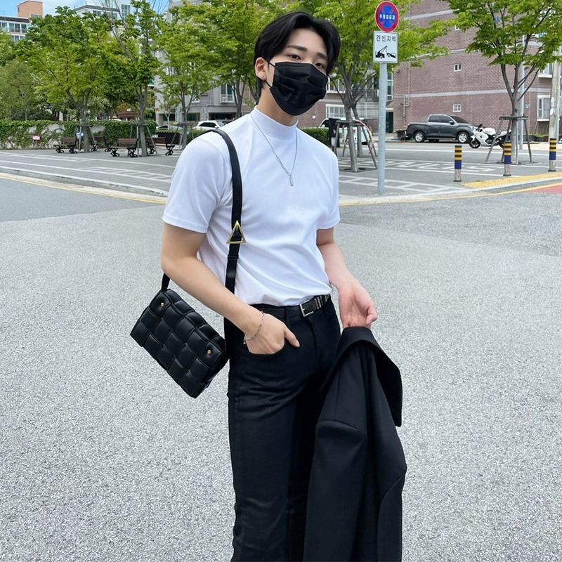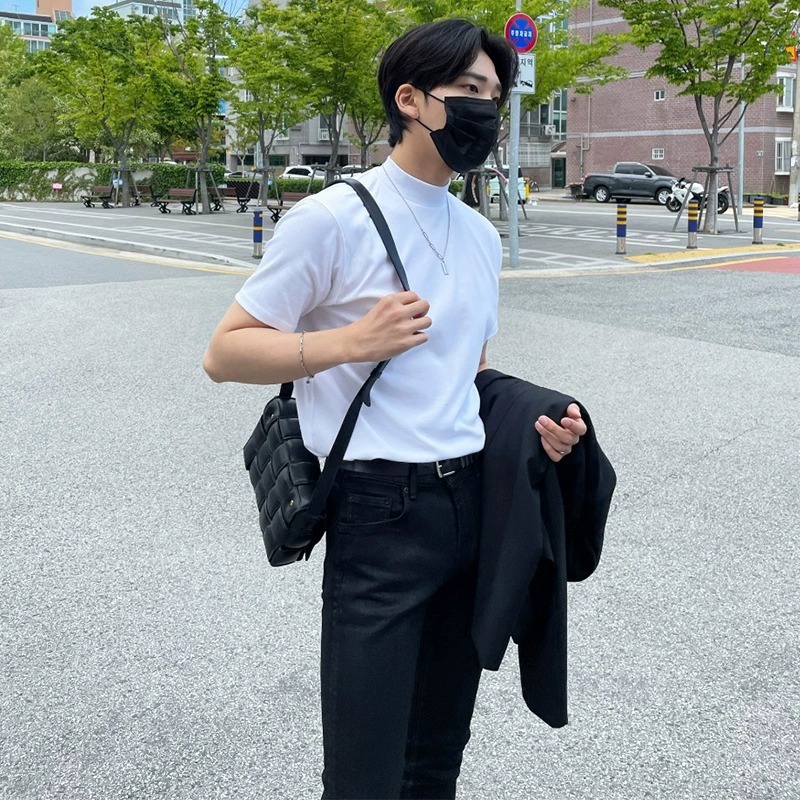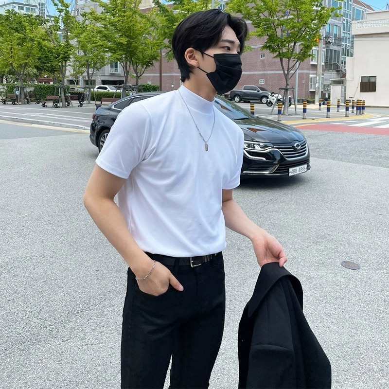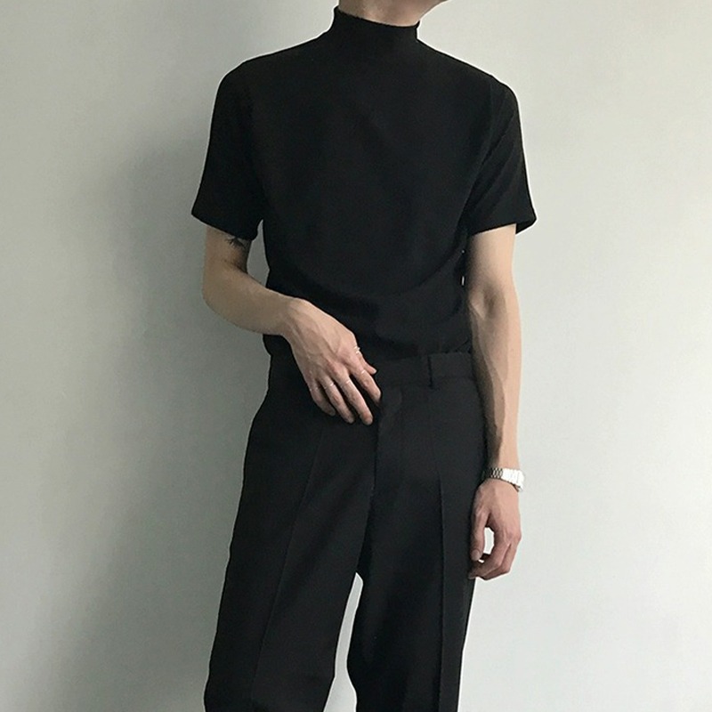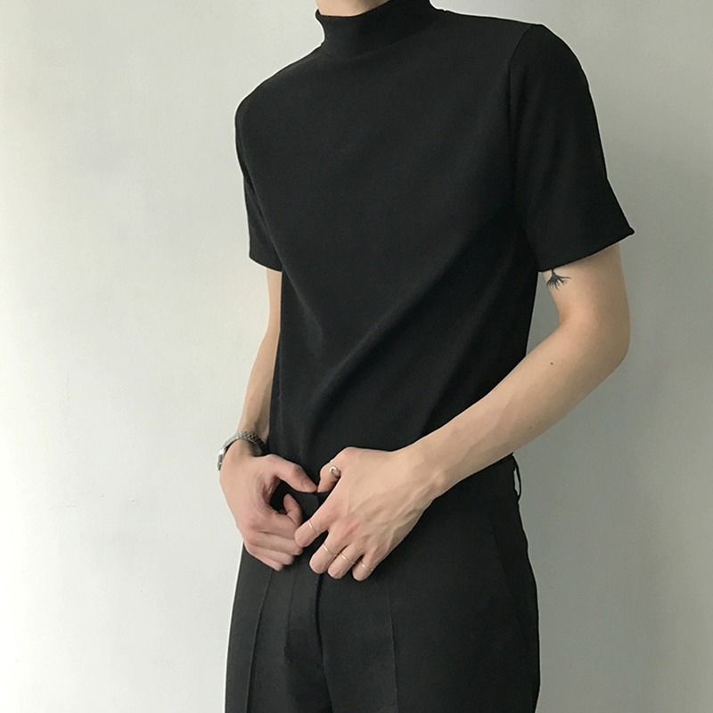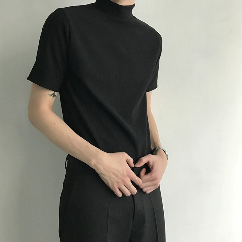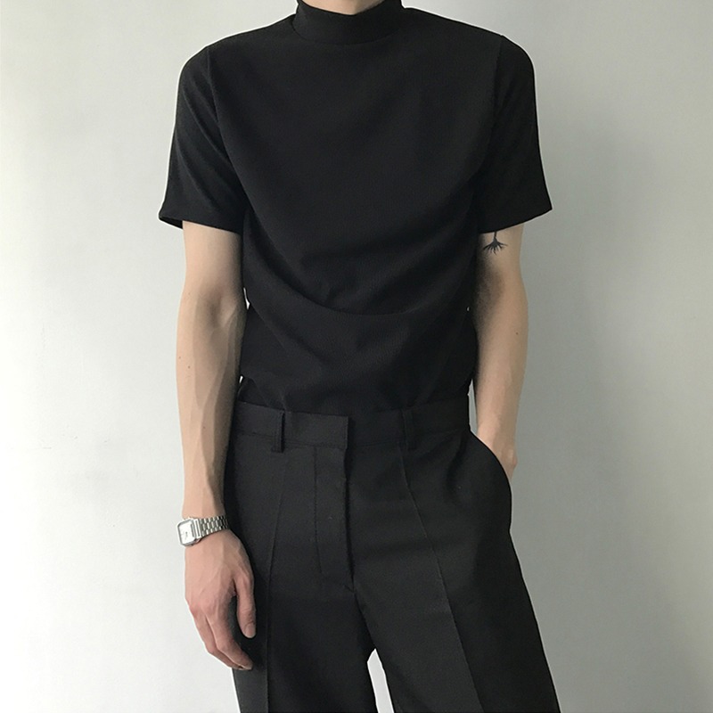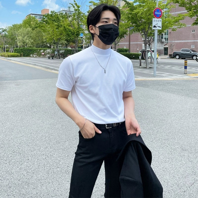 트렌디 한 브랜드 홍콩 스타일 하프 하이 칼라 반팔 티셔츠 남자 여름 새로운 한국 스타일 트렌디 하이 칼라 올매치 베이스 셔츠 탑