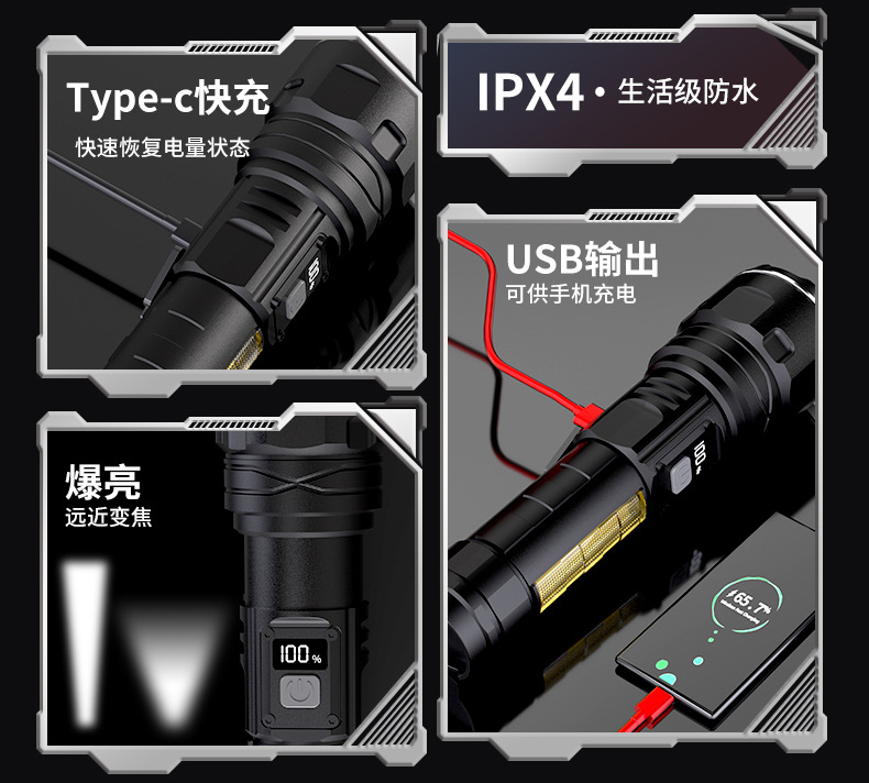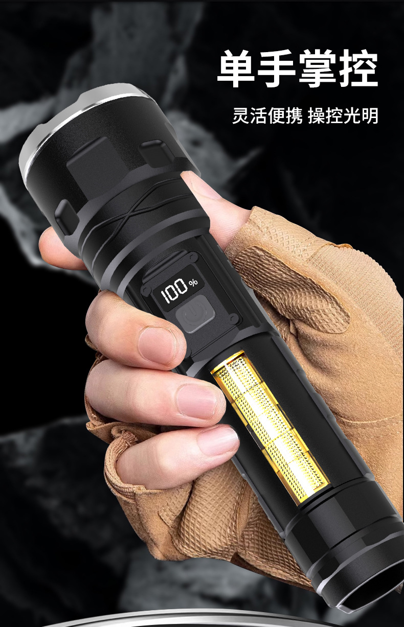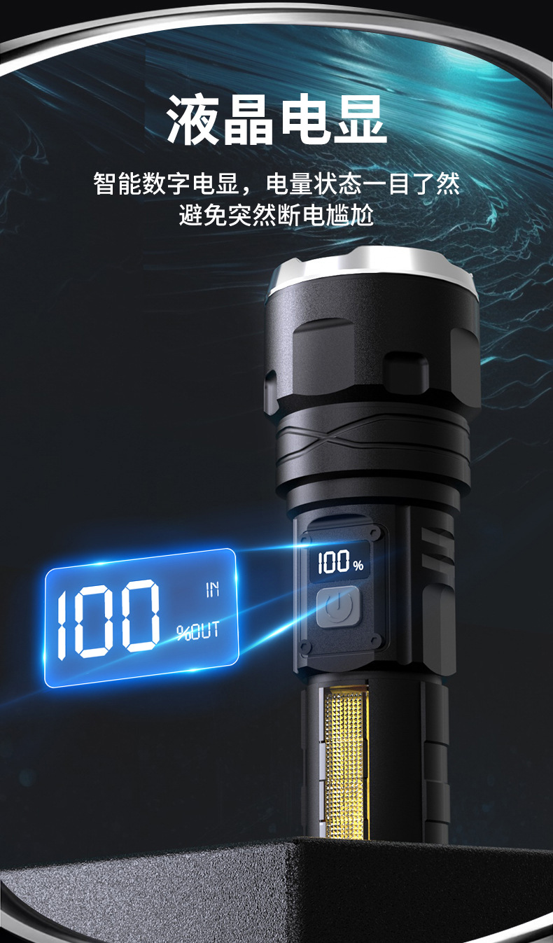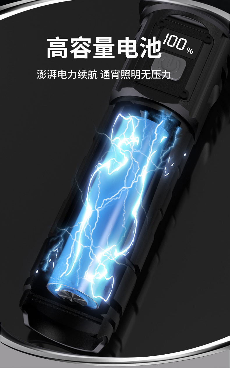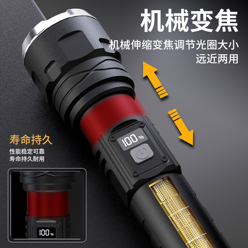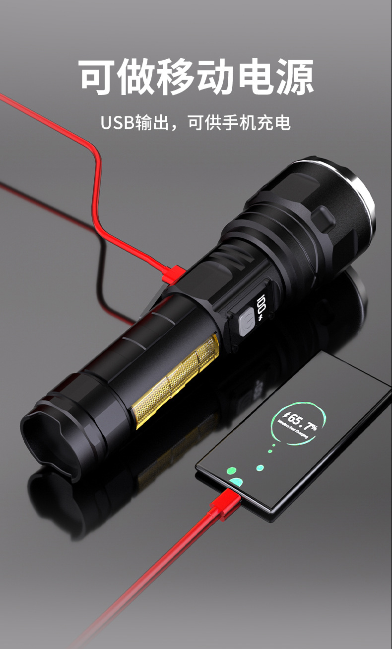 국경을 넘는 LED 초강력 장거리 야외 충전식 손전등 타입C 고속 충전 LCD 디지털 디스플레이 휴대폰 충전 가능