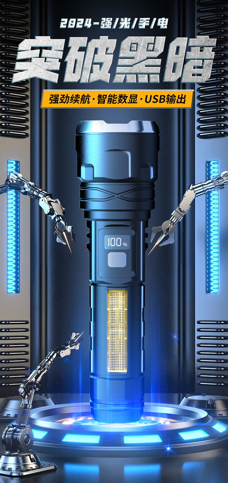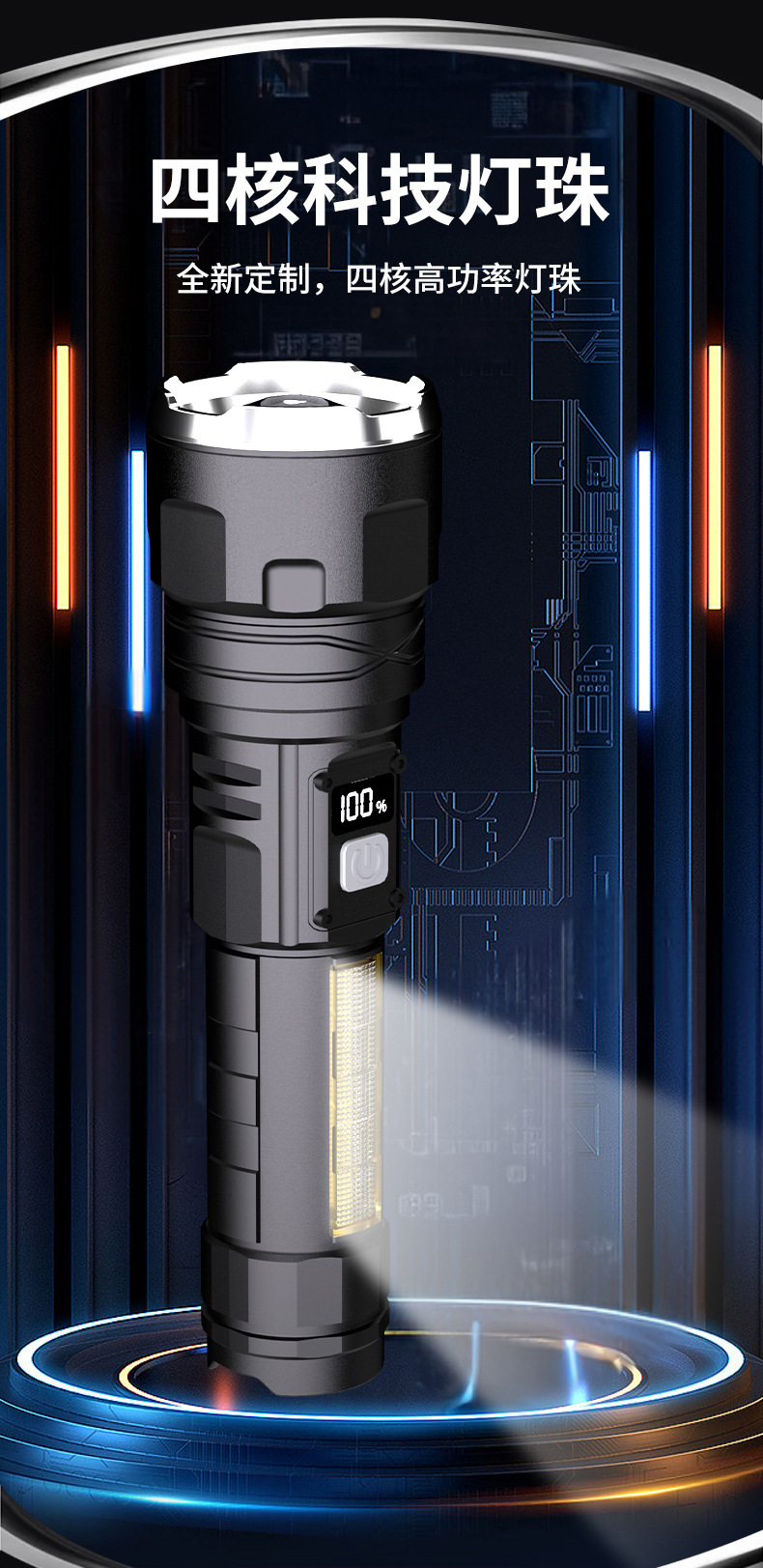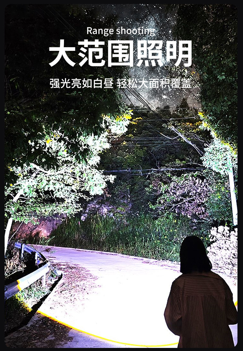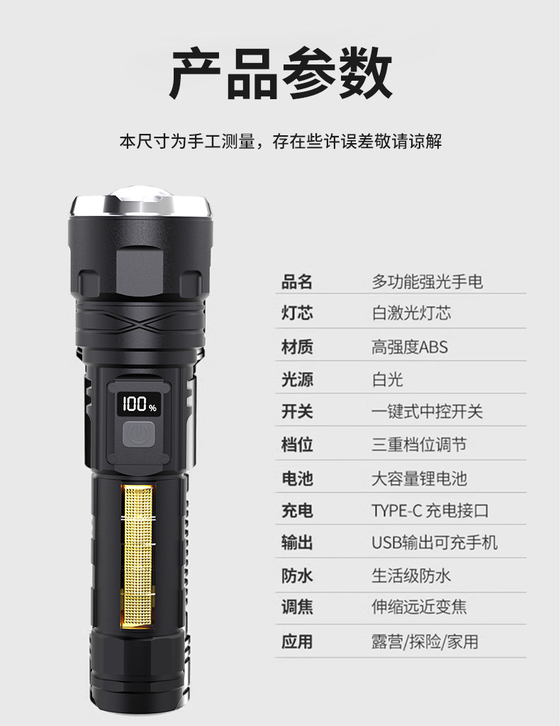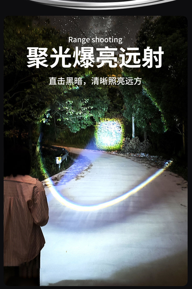 국경을 넘는 LED 초강력 장거리 야외 충전식 손전등 타입C 고속 충전 LCD 디지털 디스플레이 휴대폰 충전 가능