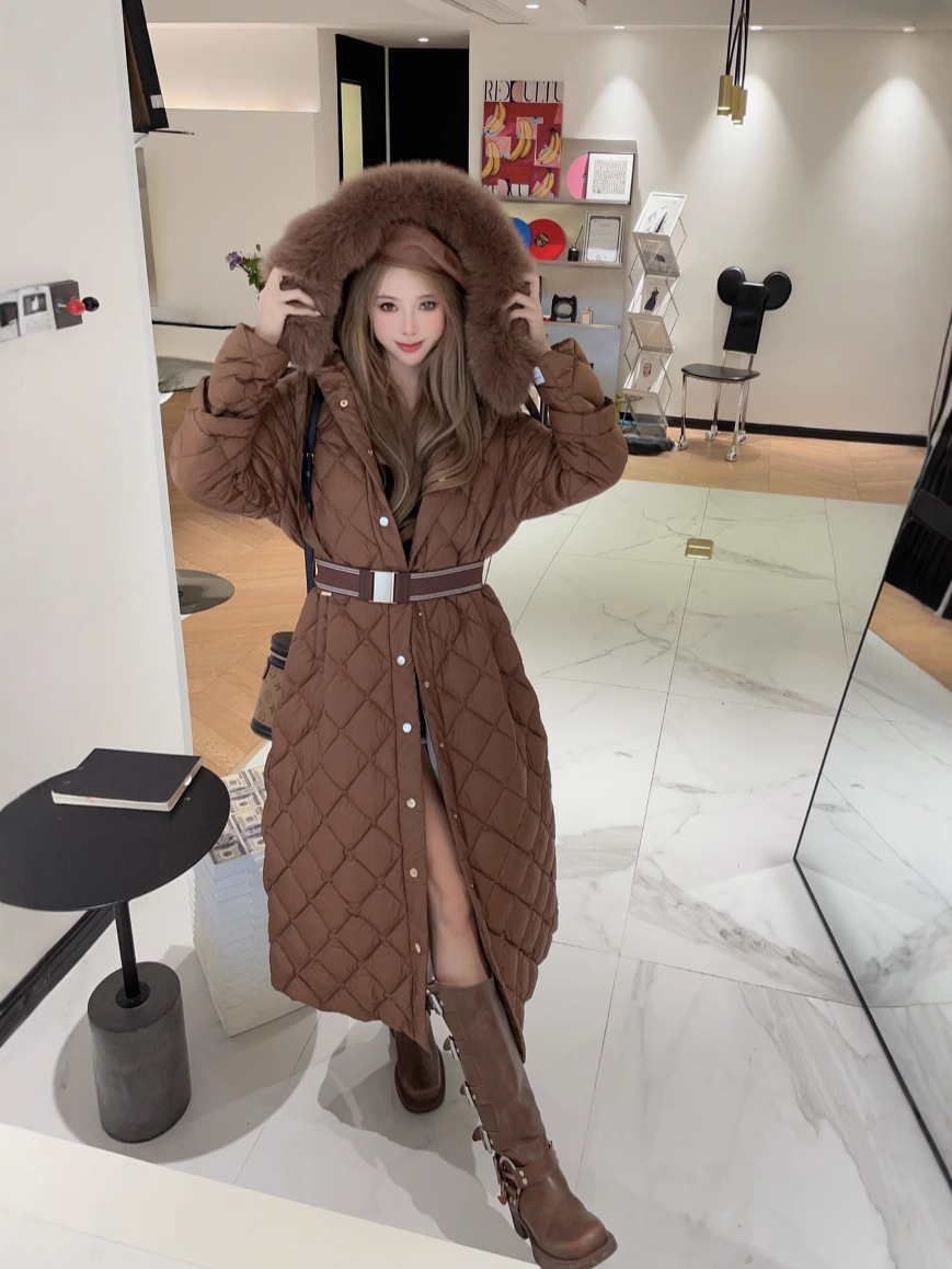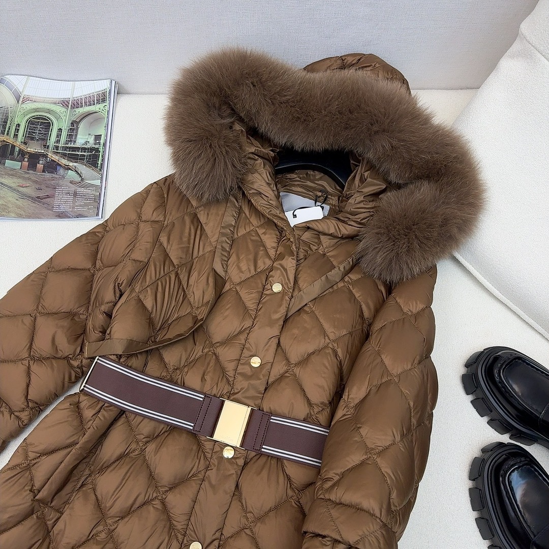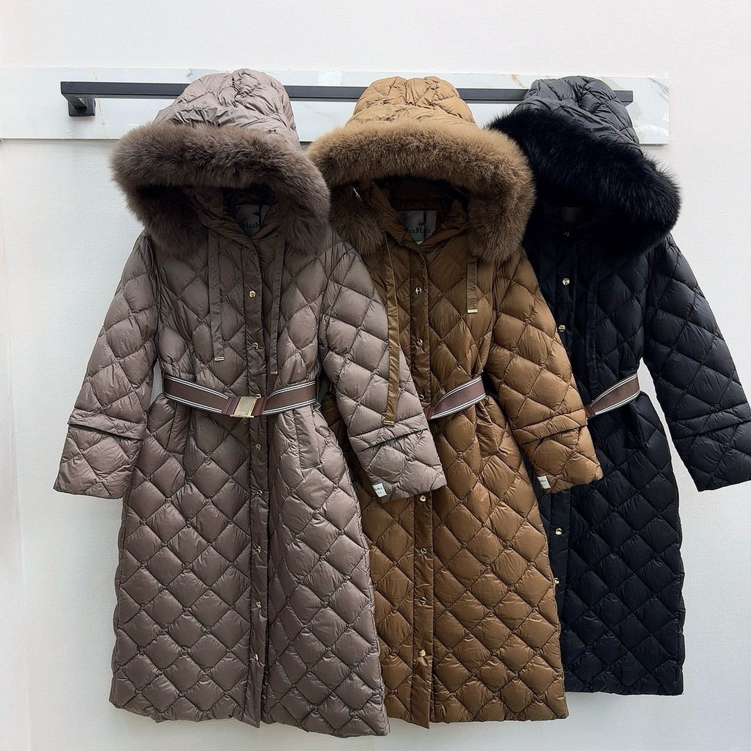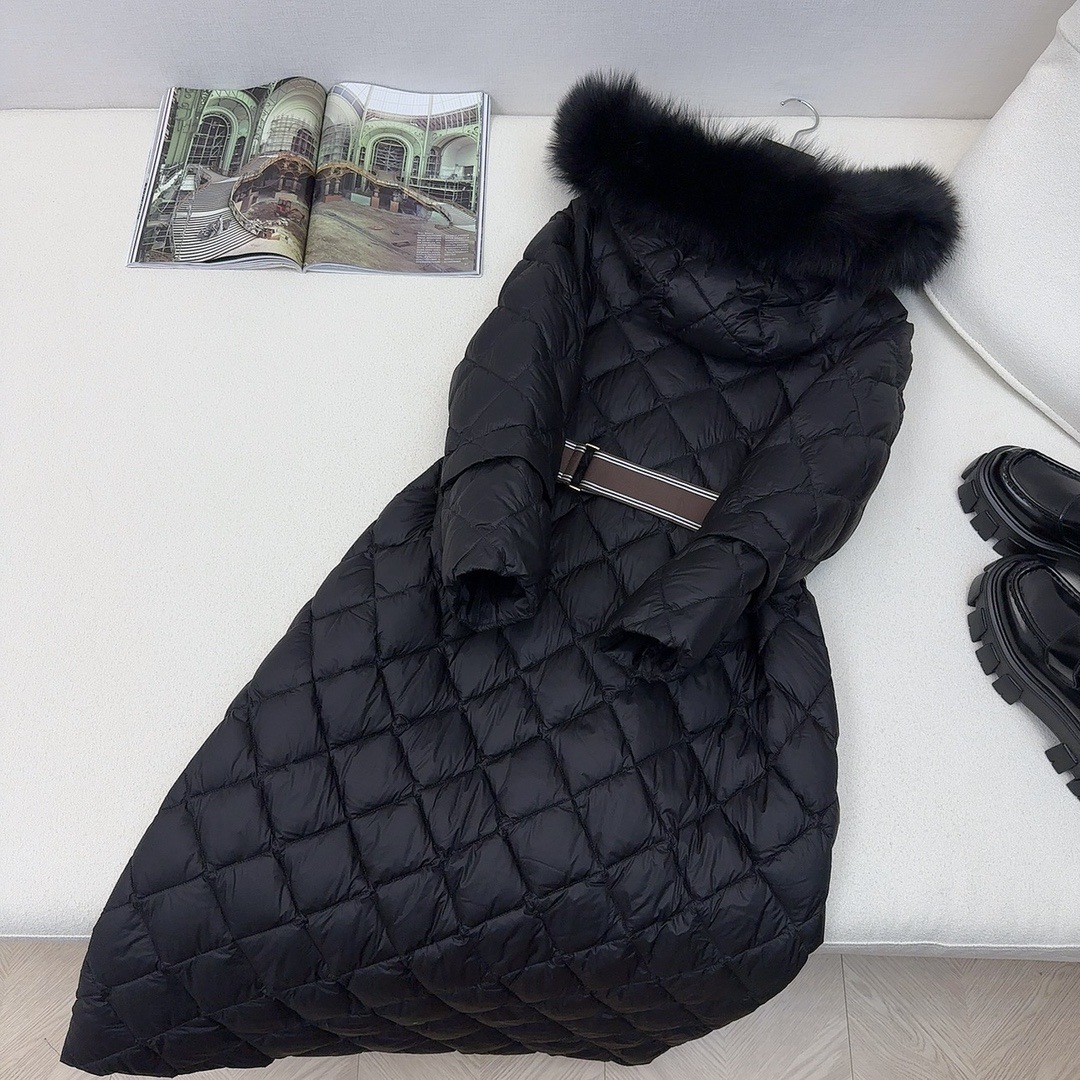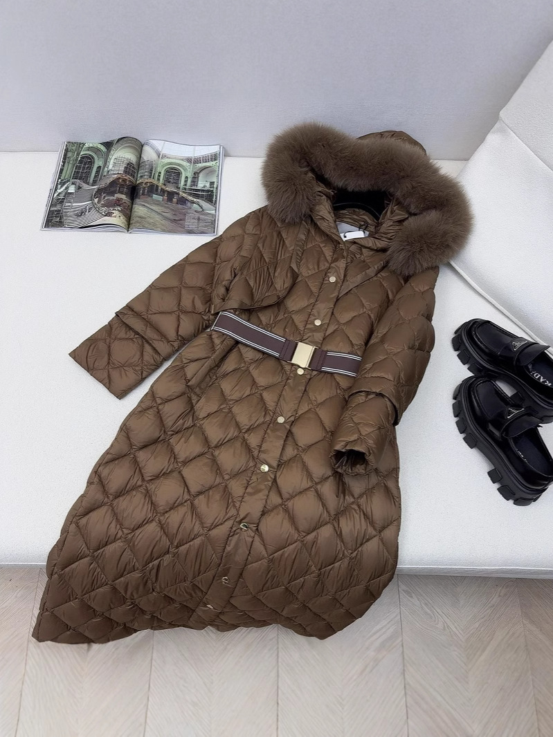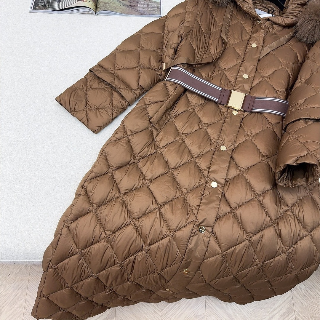 유럽과 미국의 MAX 홈 대외 무역 품질 하이 엔드 유럽 패션 벨트 마름모 롱 화이트 구스 다운 재킷