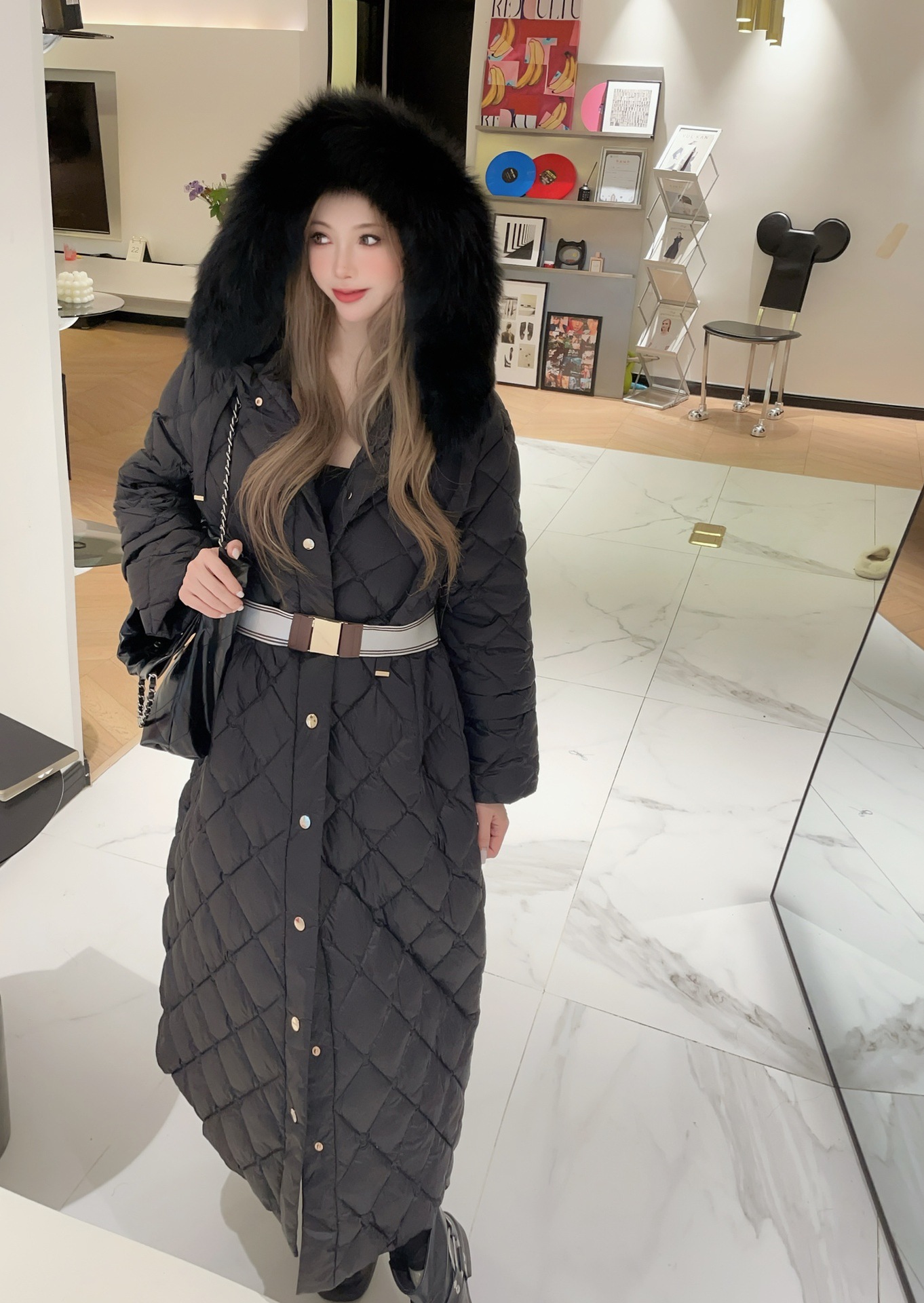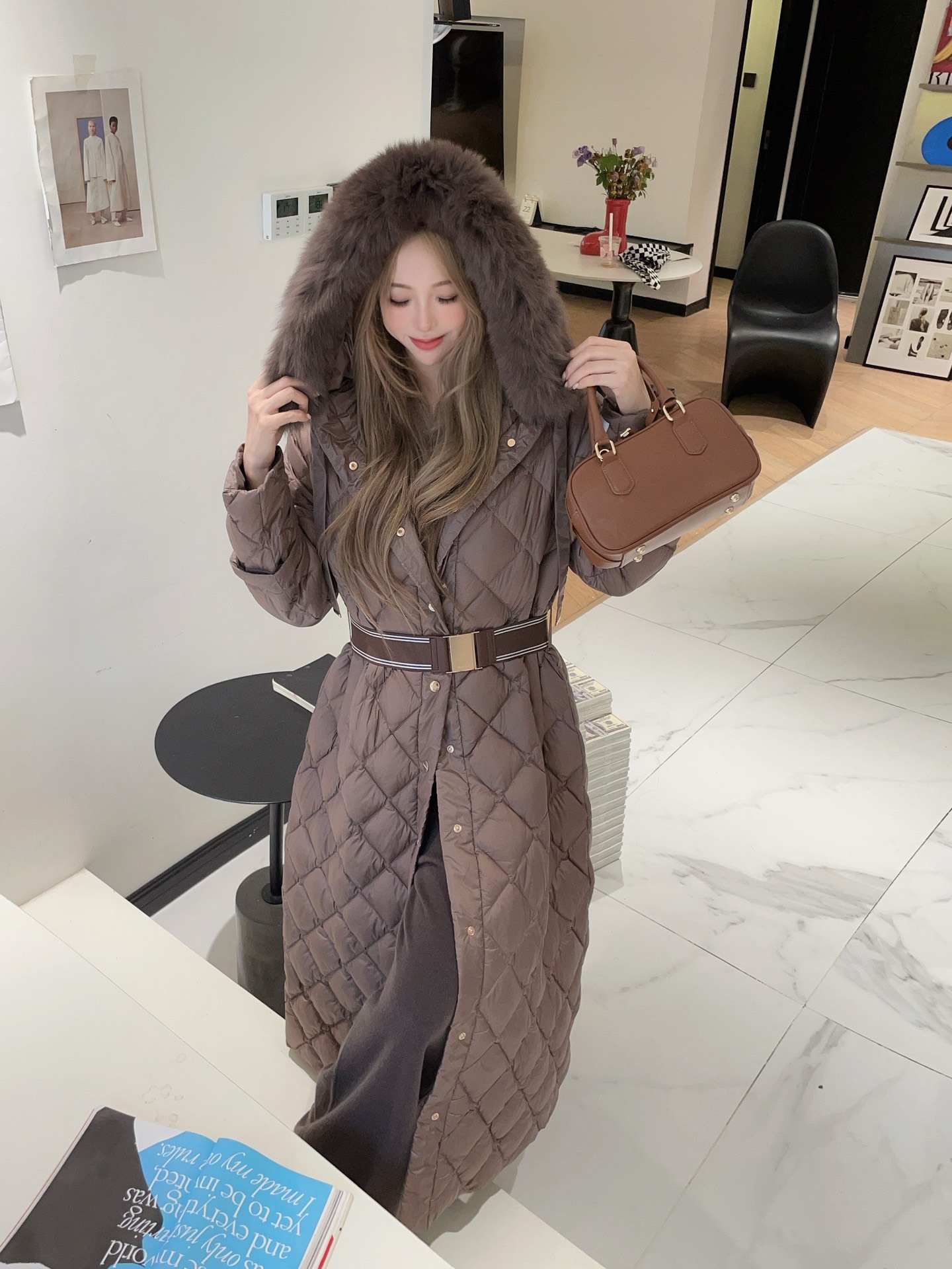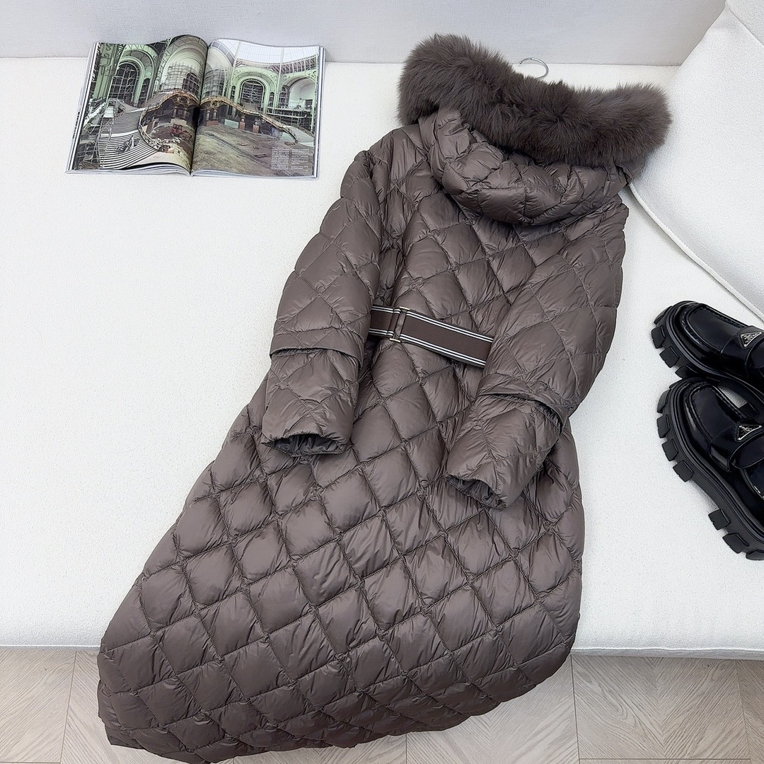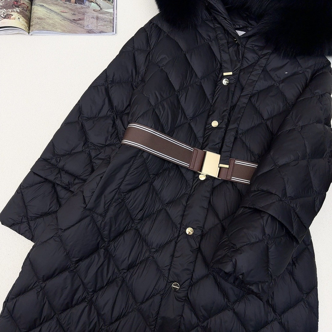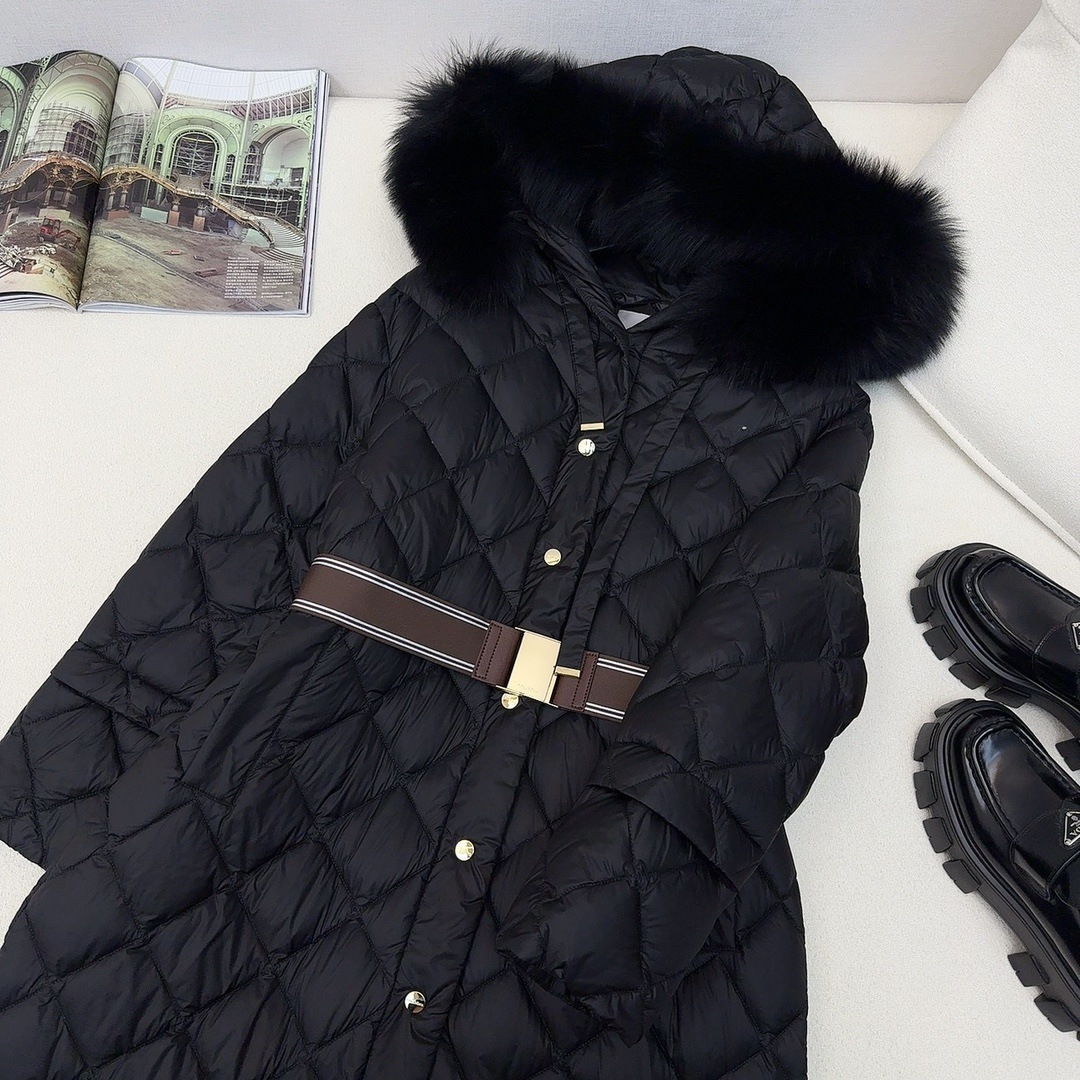 유럽과 미국의 MAX 홈 대외 무역 품질 하이 엔드 유럽 패션 벨트 마름모 롱 화이트 구스 다운 재킷