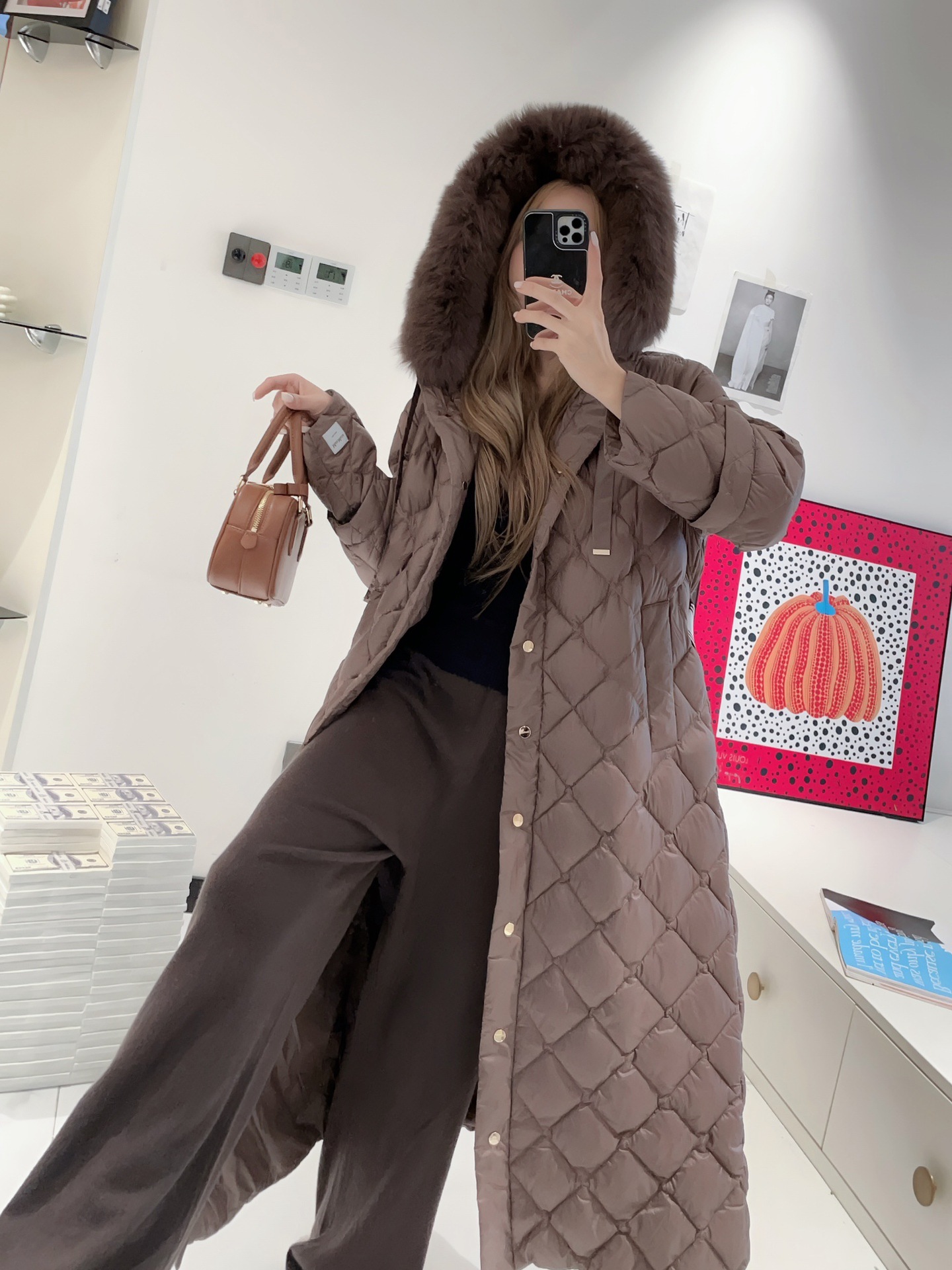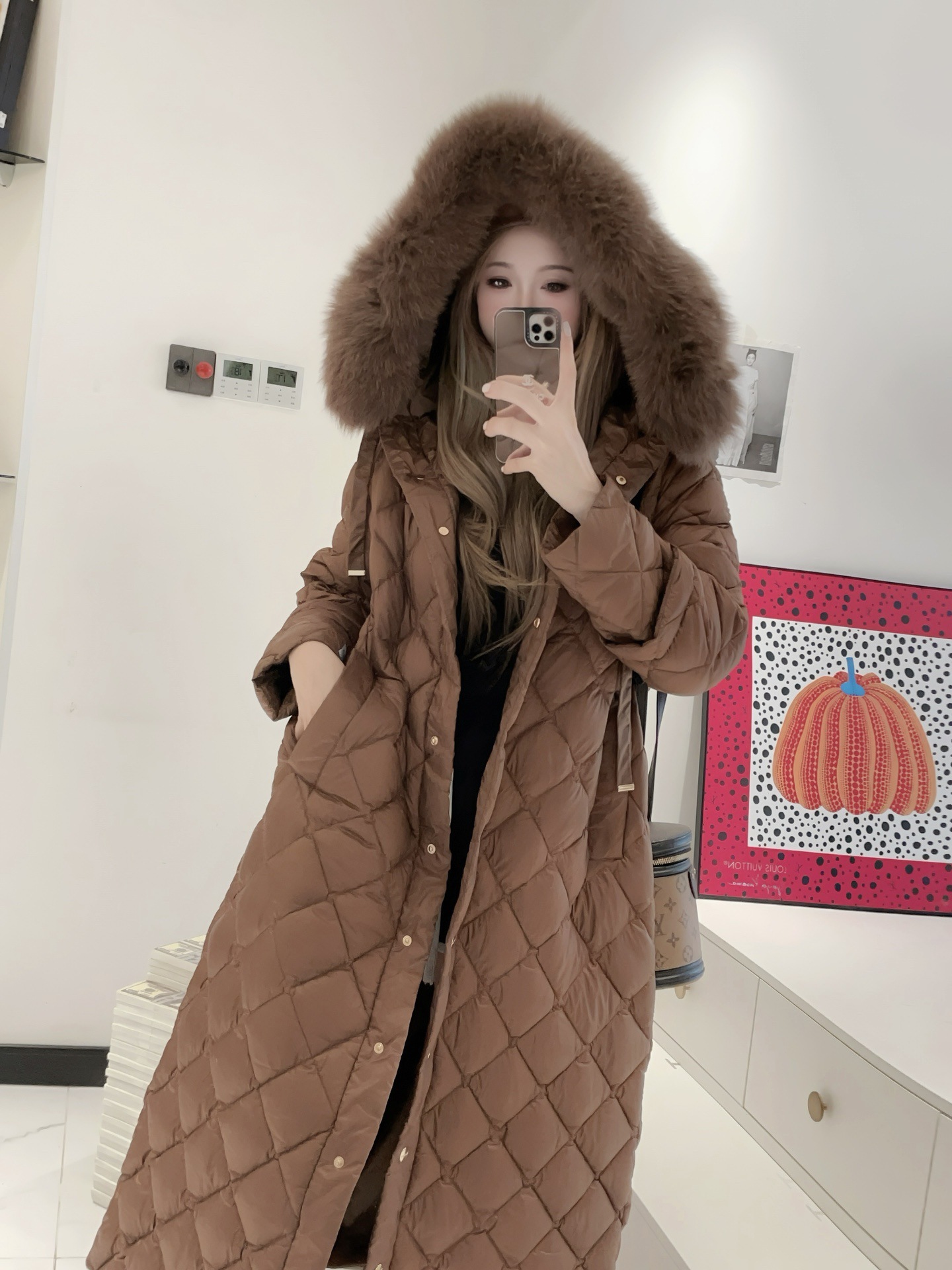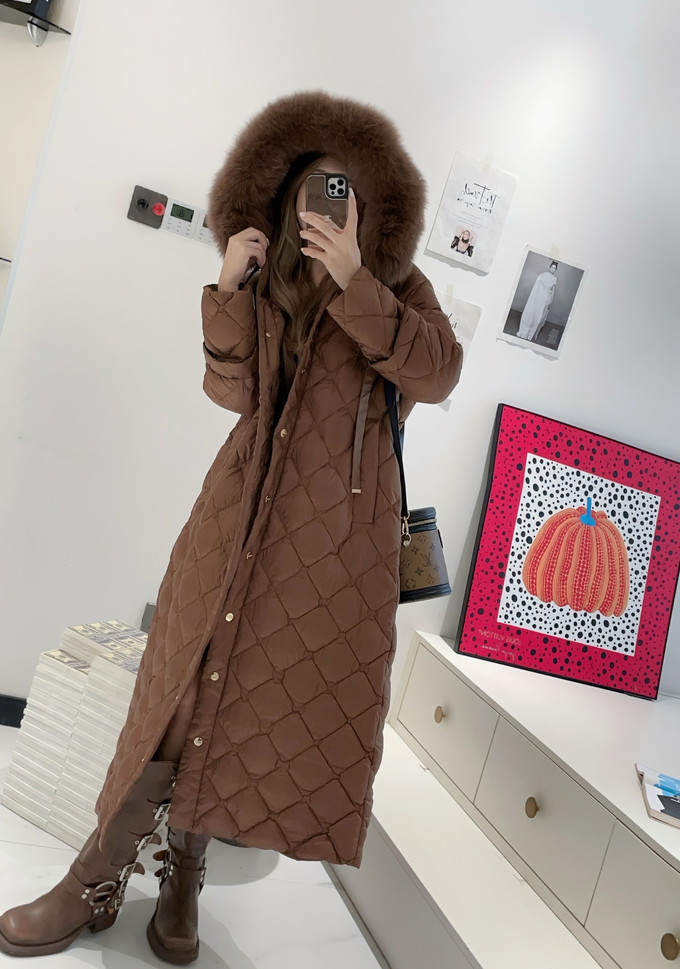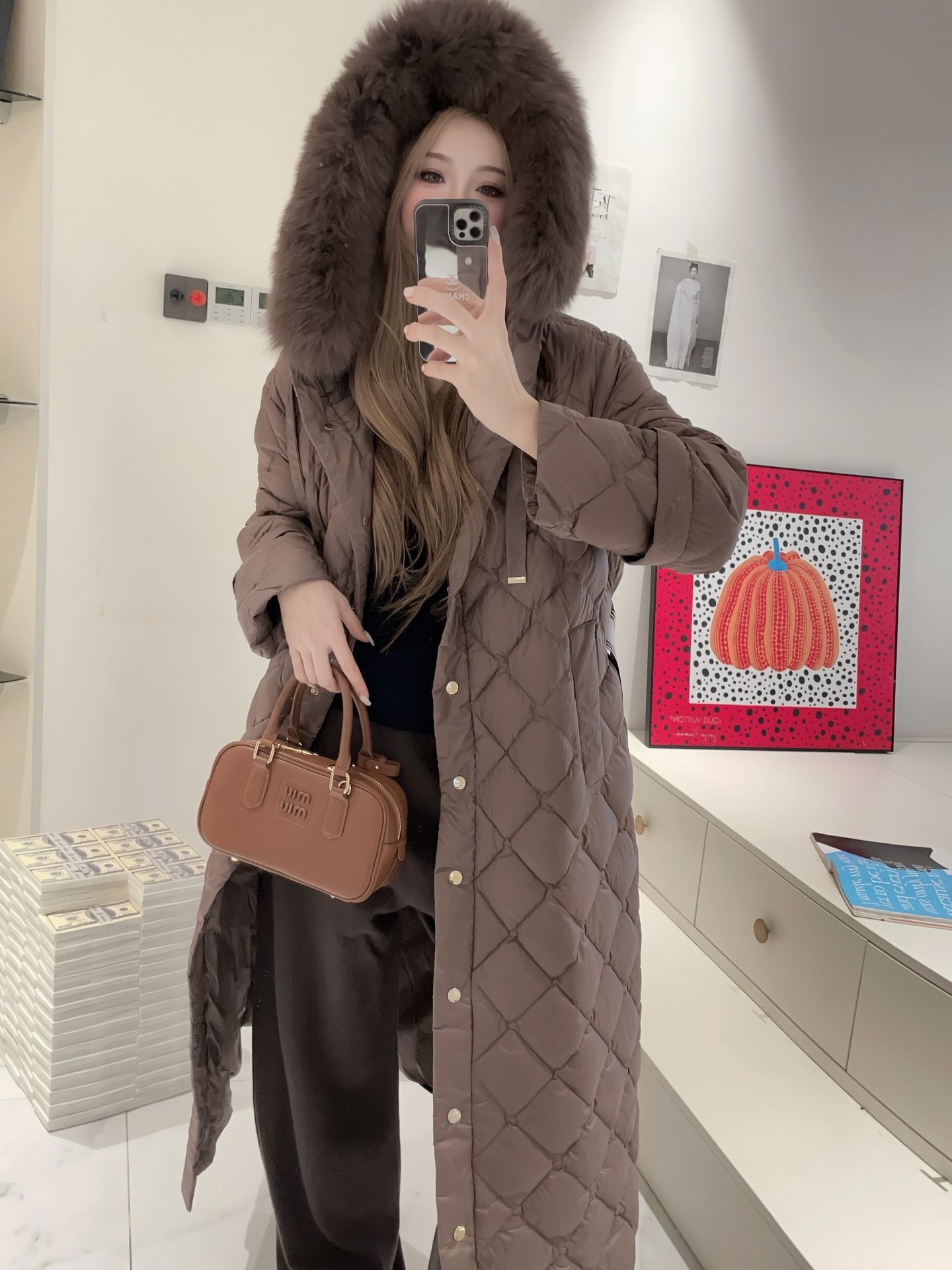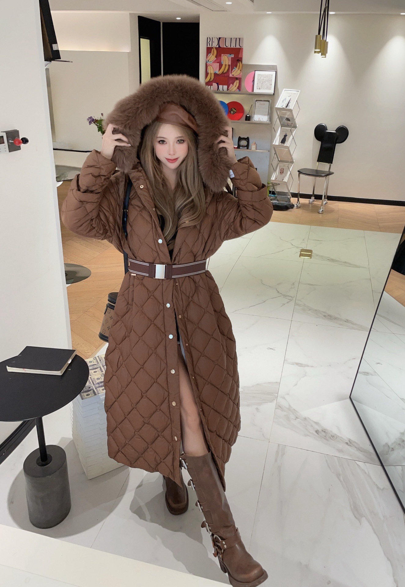 유럽과 미국의 MAX 홈 대외 무역 품질 하이 엔드 유럽 패션 벨트 마름모 롱 화이트 구스 다운 재킷