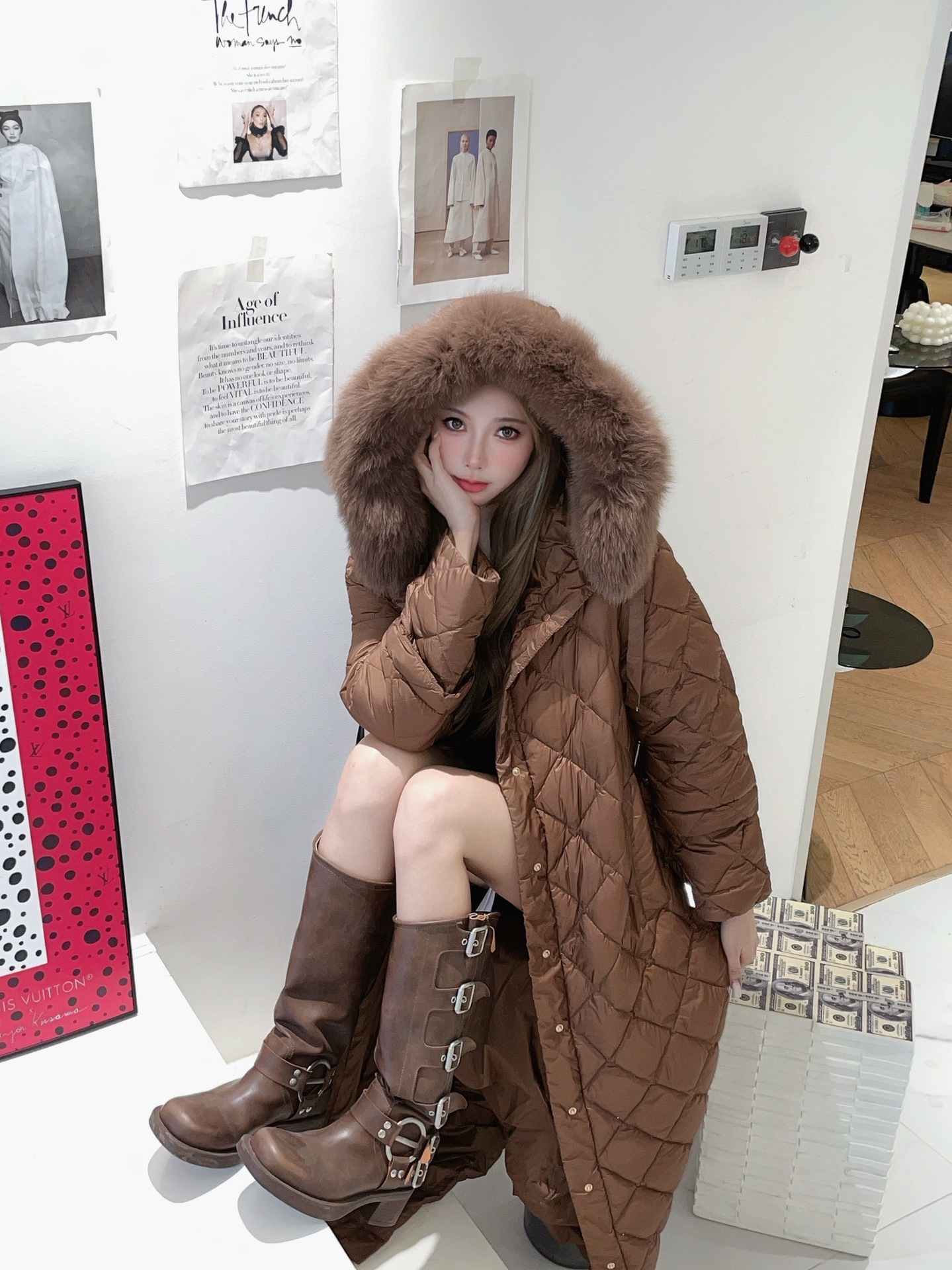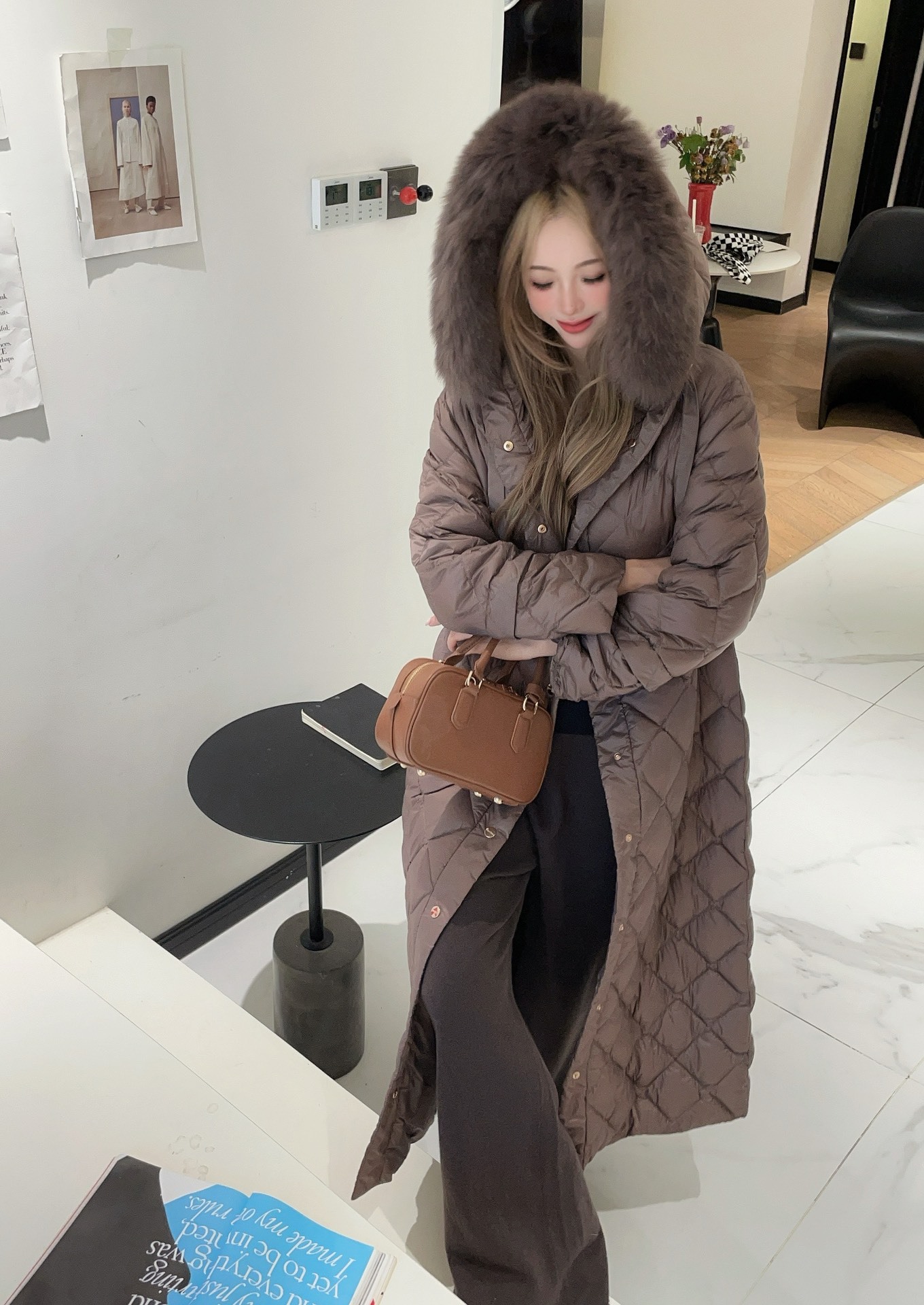 모피 칼라가 있는 브라운