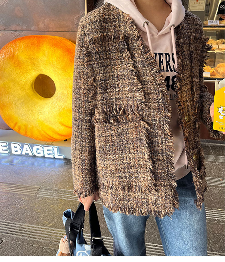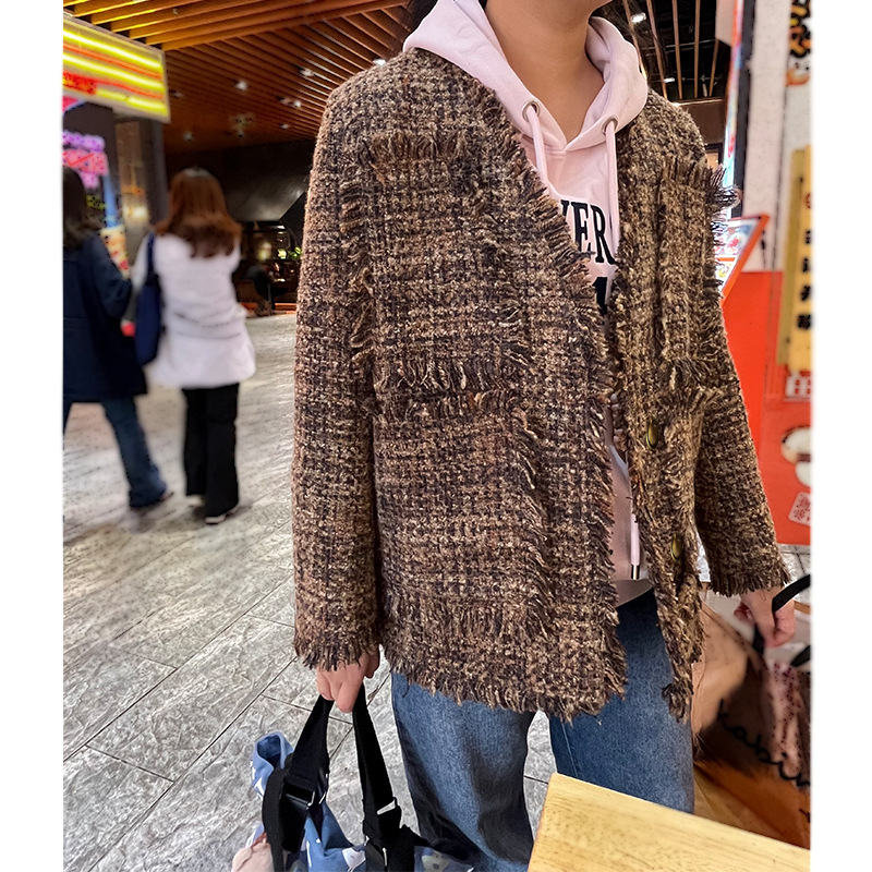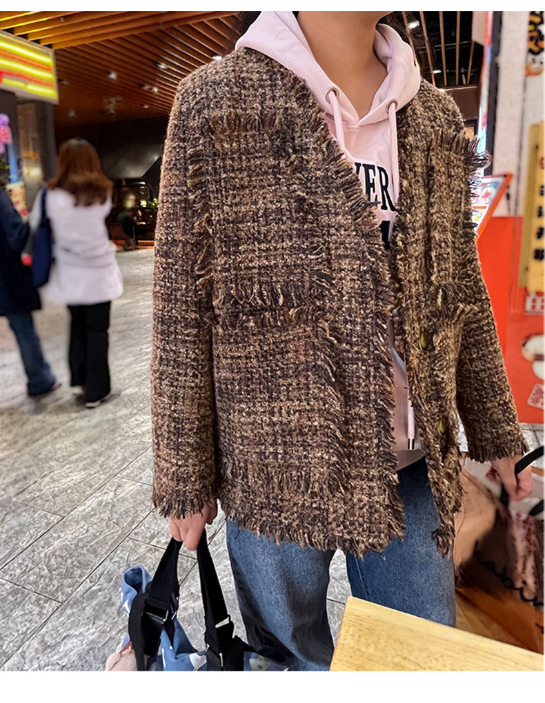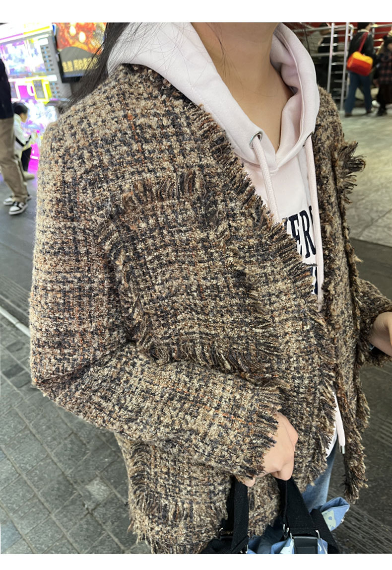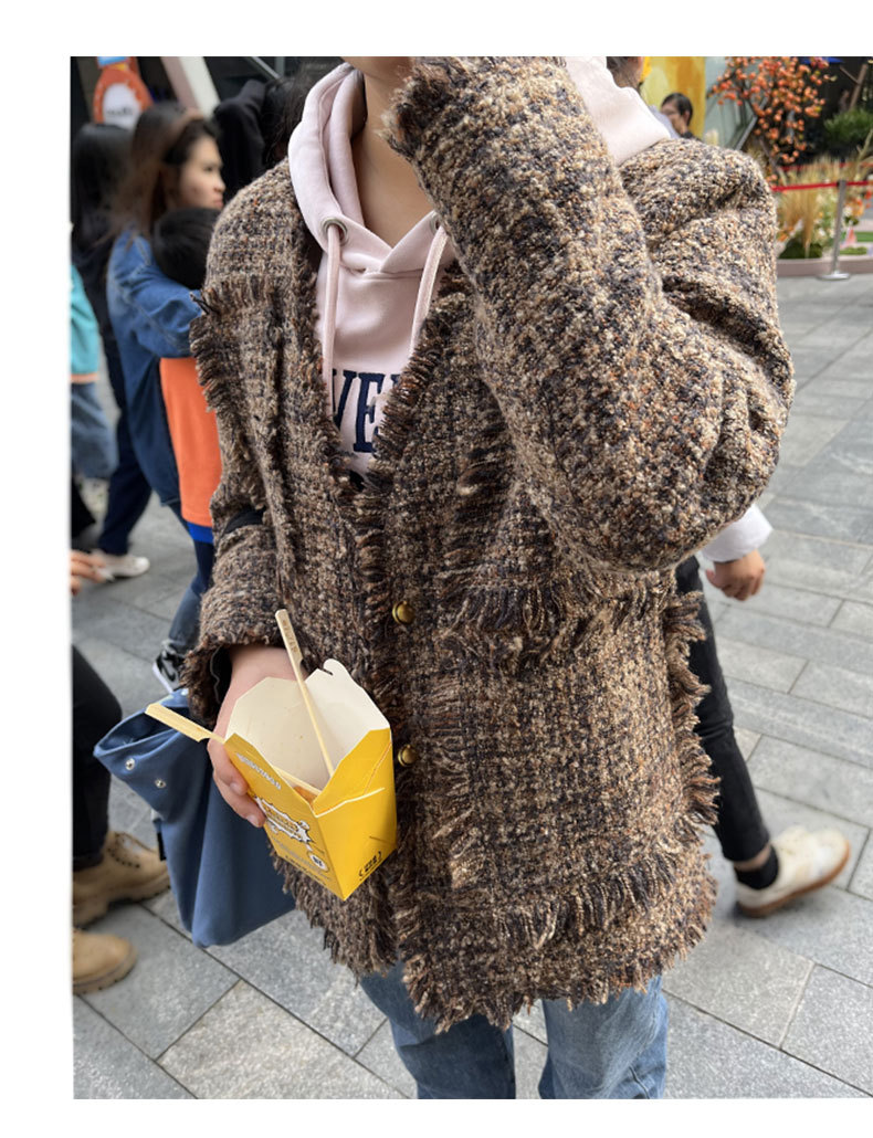 여성을위한 플러스 사이즈 새로운 Maillard 중간 길이의 트위드 탑 통통녀 디자인 Tassel Chanel 스타일 느슨한 코트