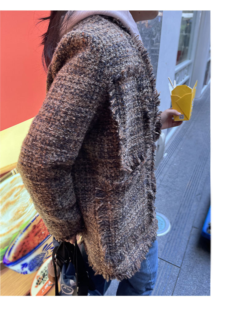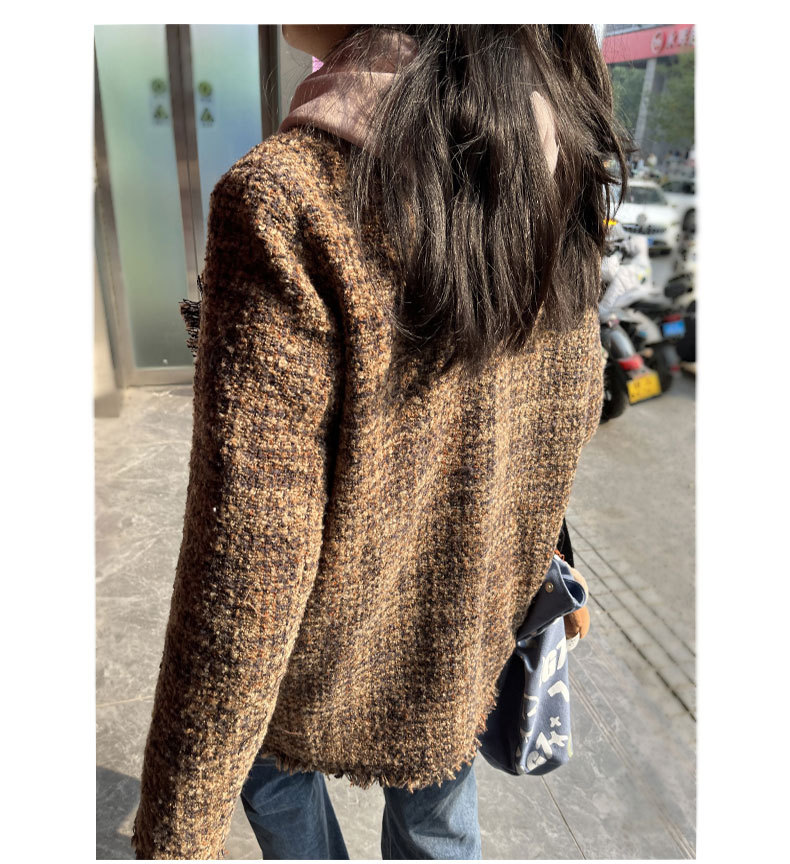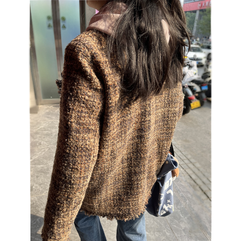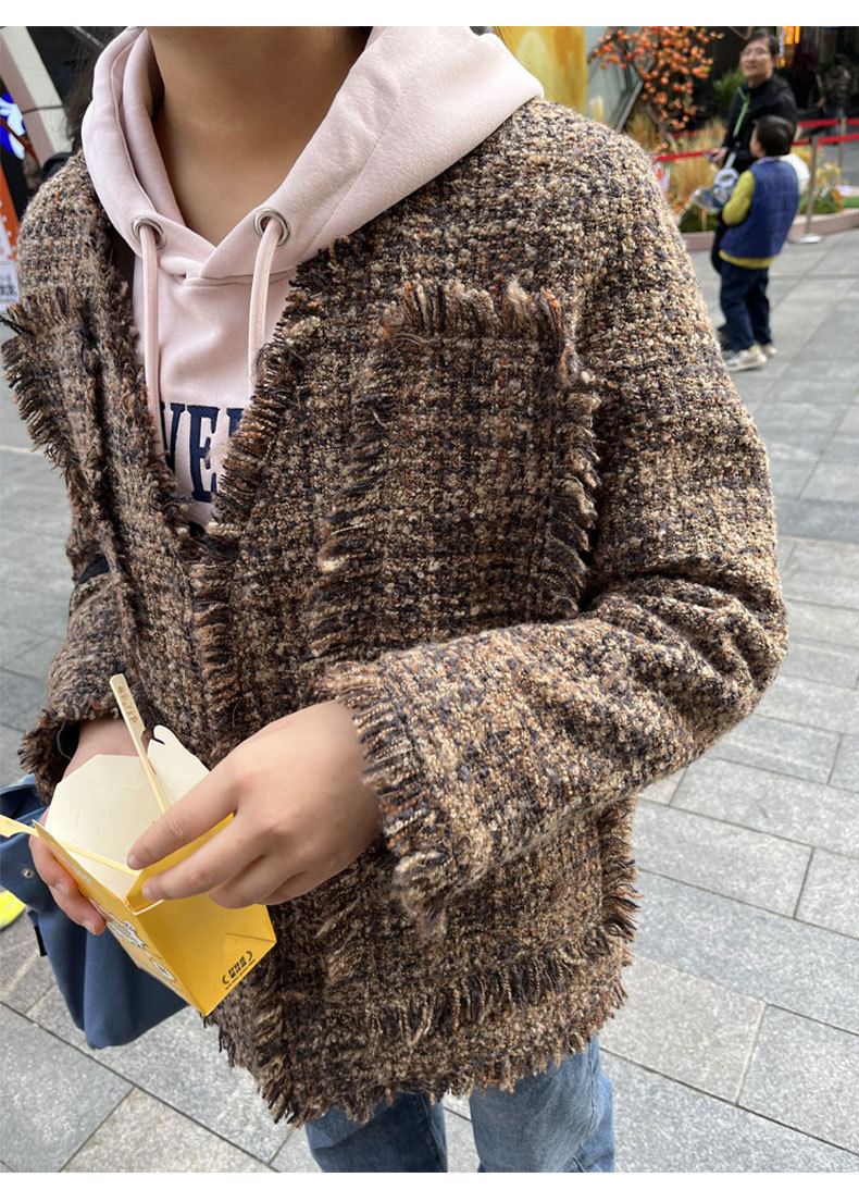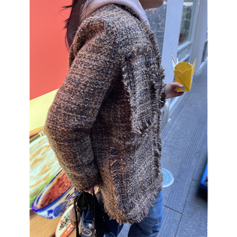 여성을위한 플러스 사이즈 새로운 Maillard 중간 길이의 트위드 탑 통통녀 디자인 Tassel Chanel 스타일 느슨한 코트