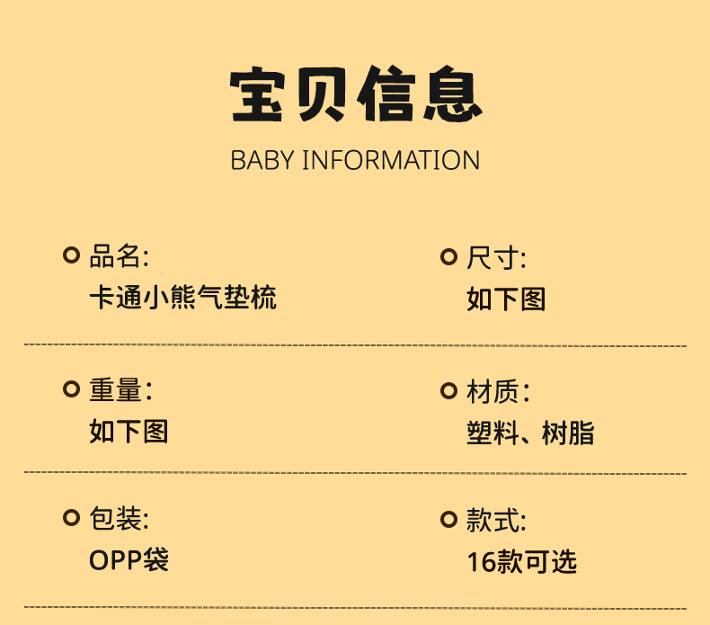 귀여운 곰돌이 에어쿠션 빗, 여성용 빗, 미용 도구, 어린이 마사지 빗, 휴대용 소형 빗 도매