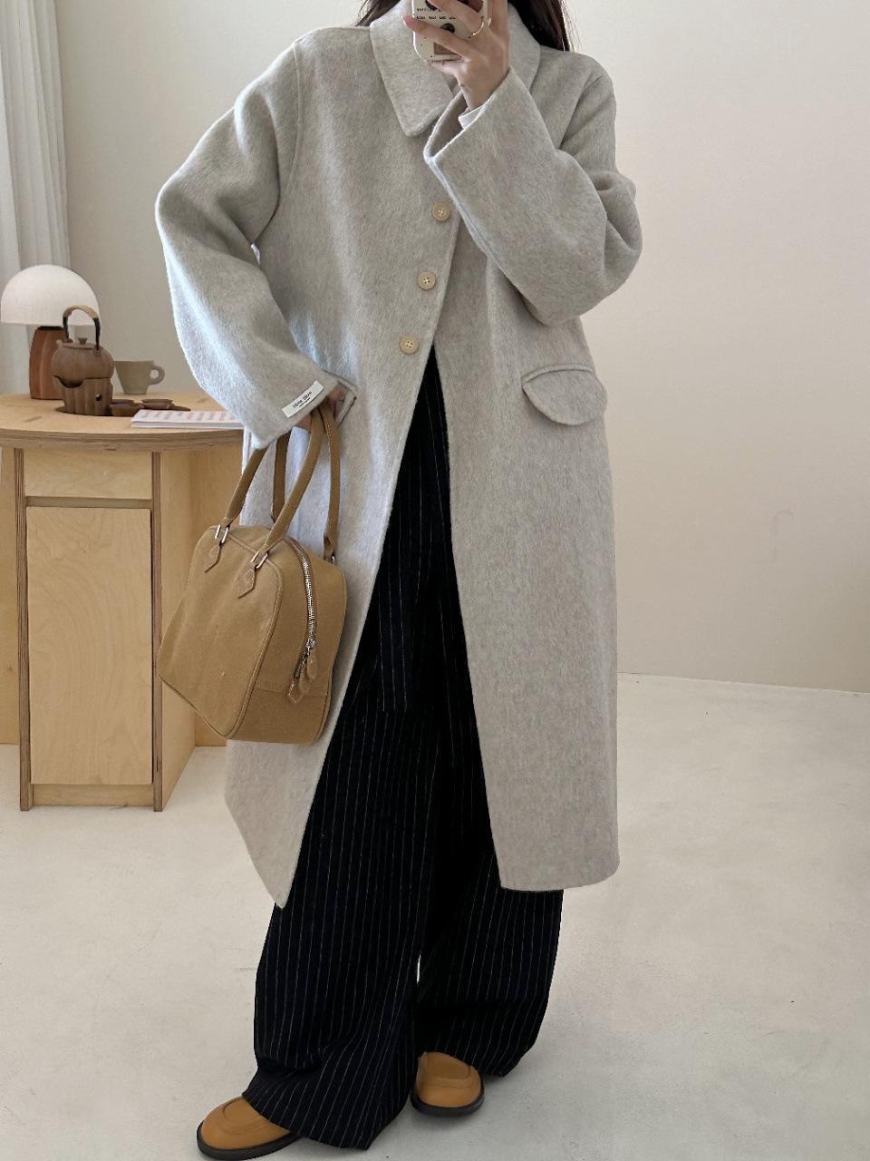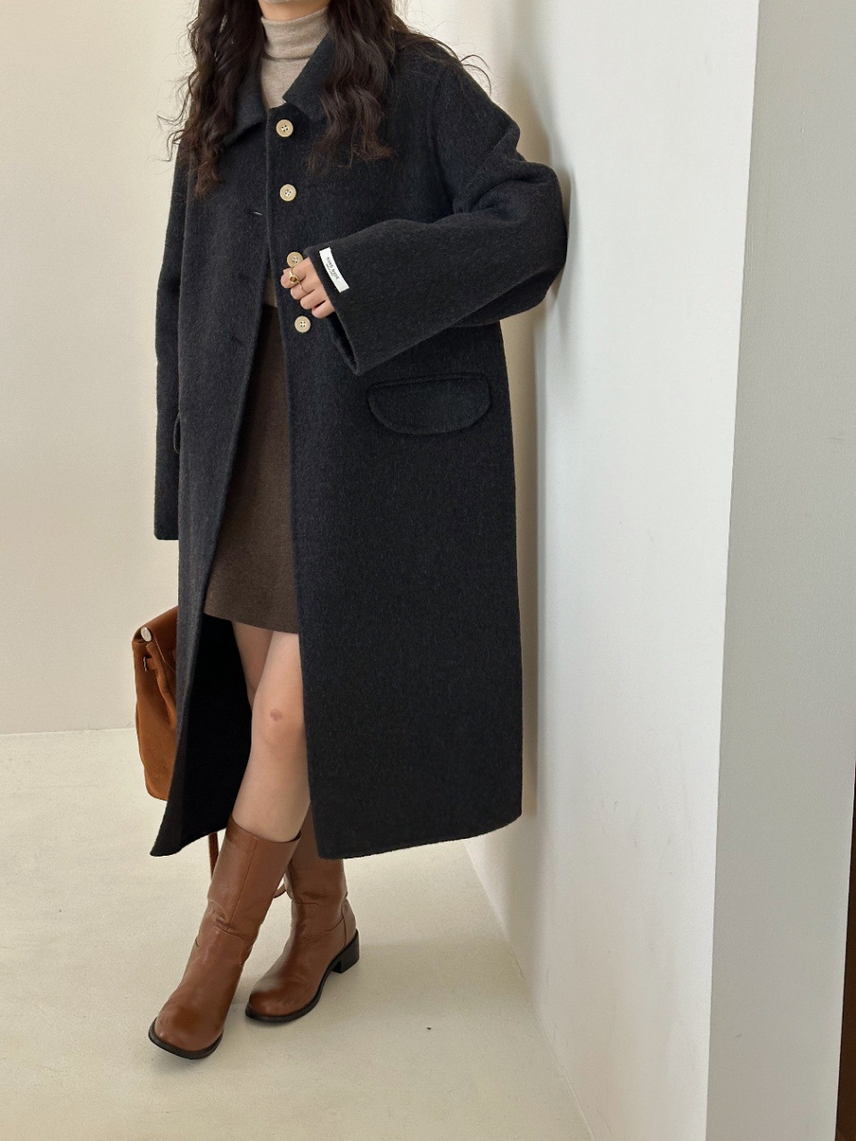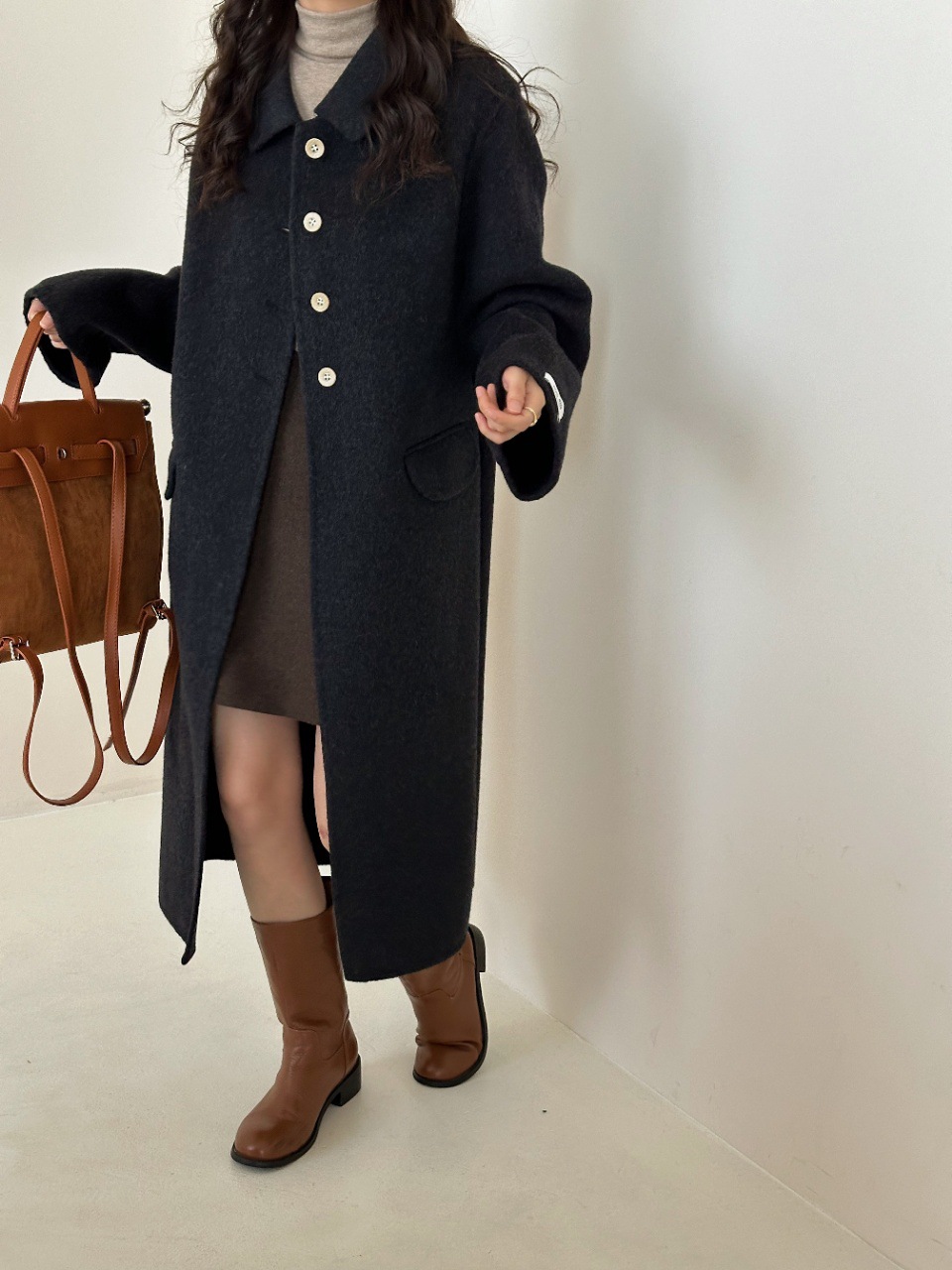인형 칼라 고급 중간 길이 간단한 단일 가슴 양면 양모 코트 두꺼운 대형 커프 캐시미어 재킷