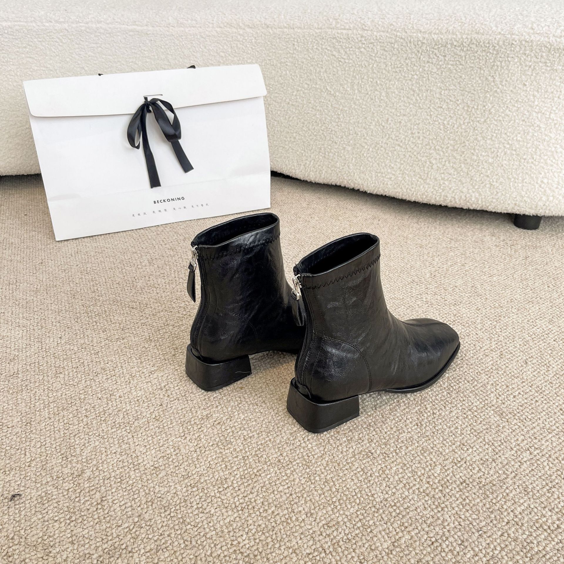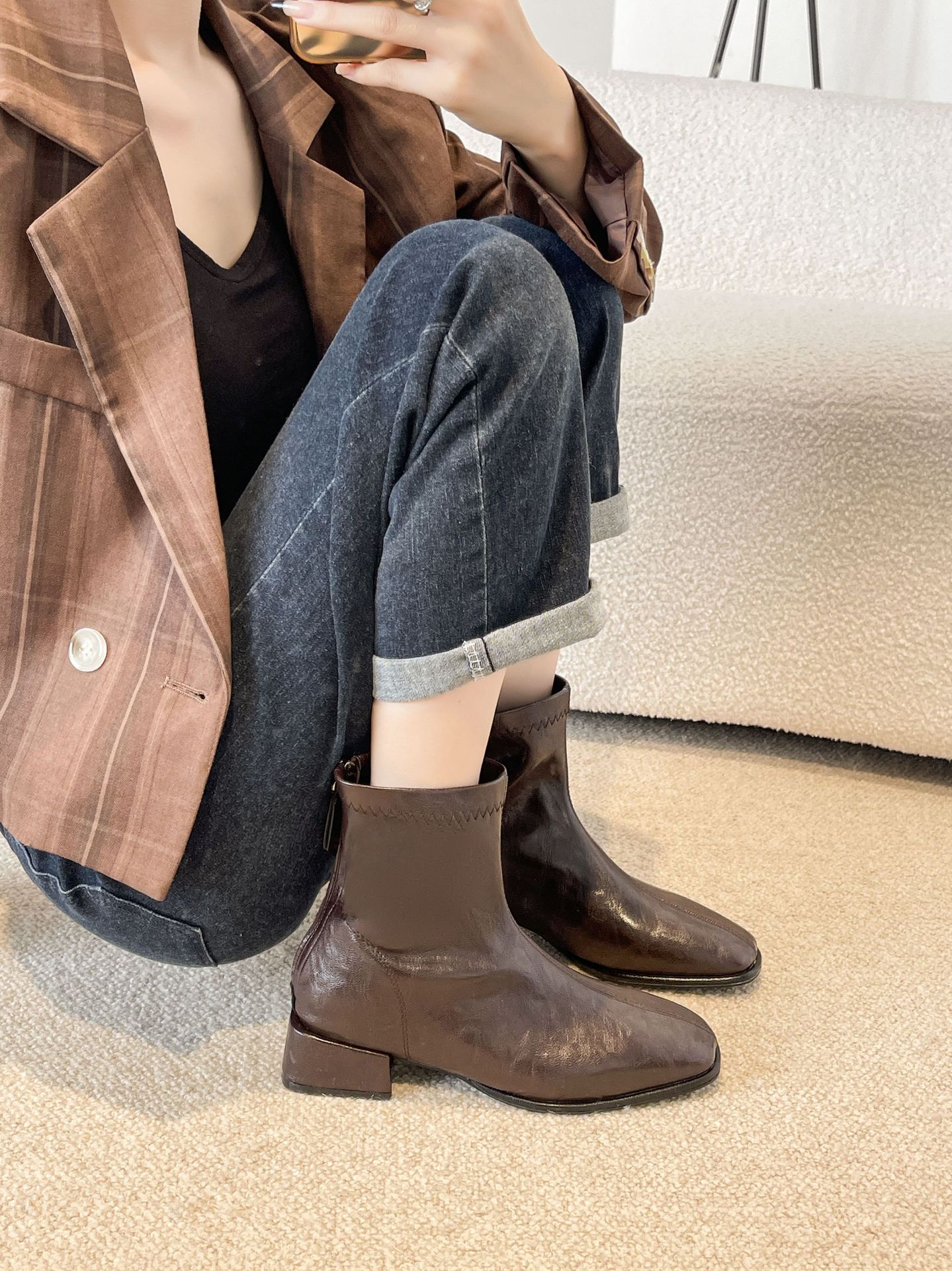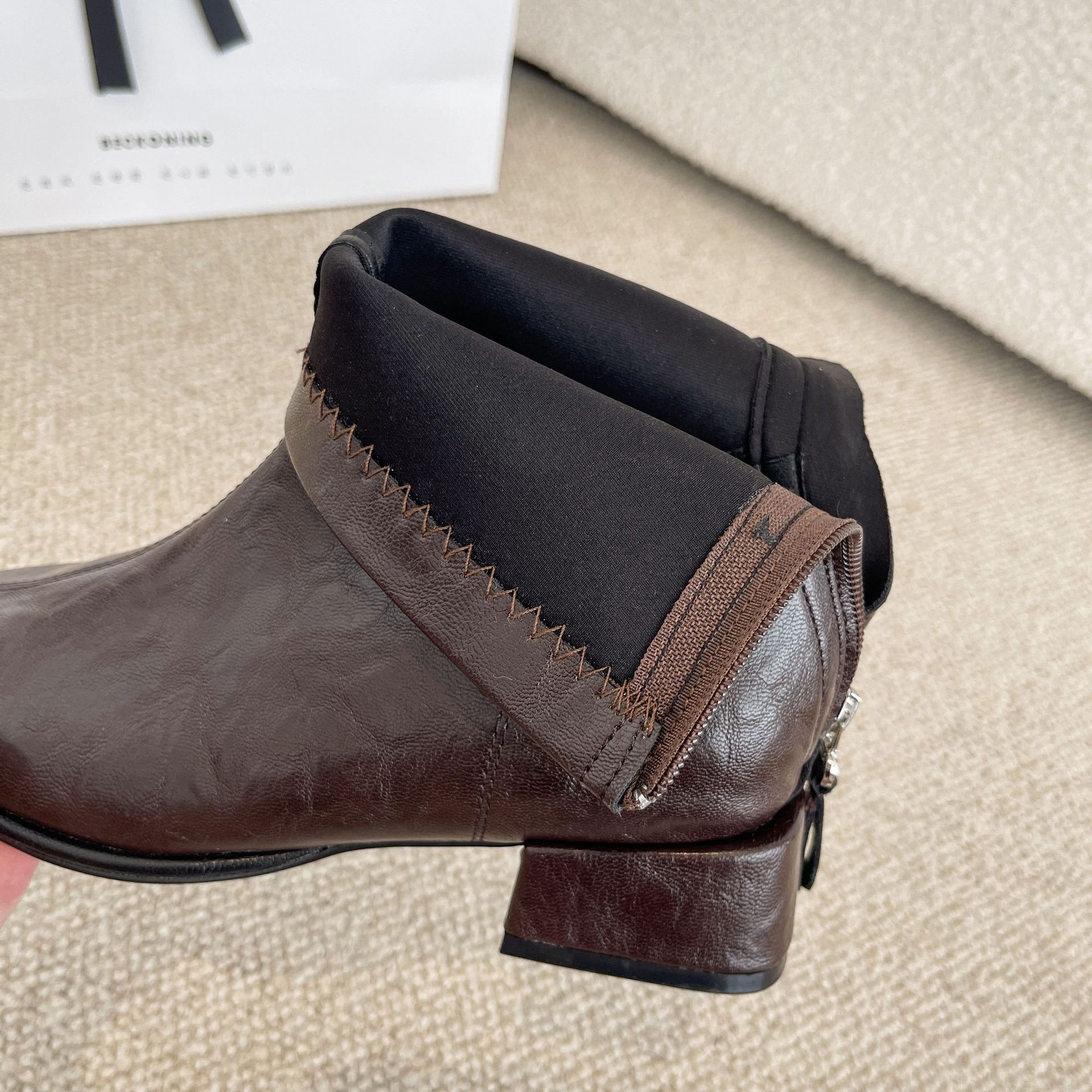 2024 가을과 겨울을위한 넓고 뚱뚱한 낮은 굽 마틴 부츠 새로운 스퀘어 헤드 두꺼운 힐 조커 여성용 핸드 헬드 플러스 사이즈 발목 부츠