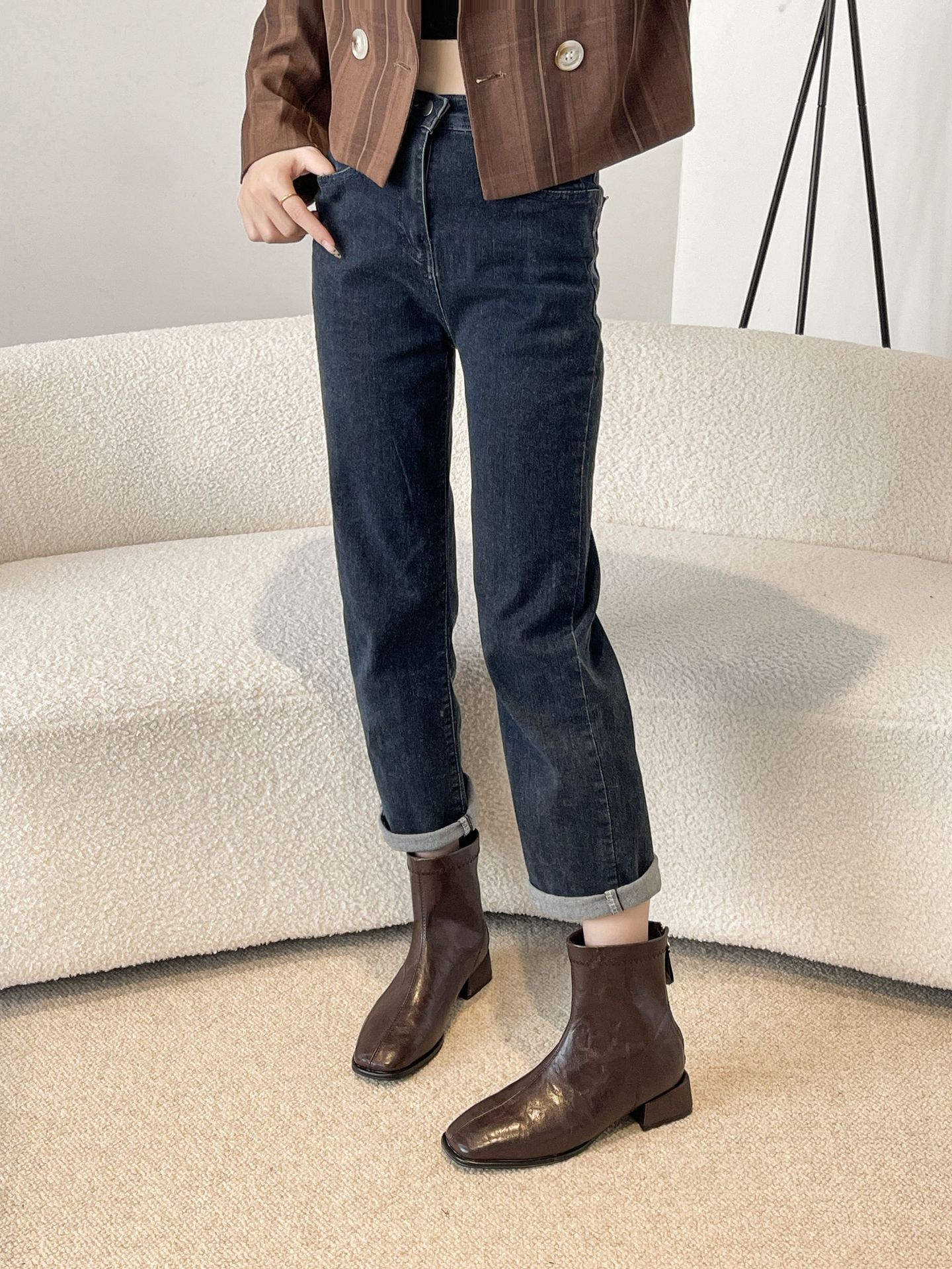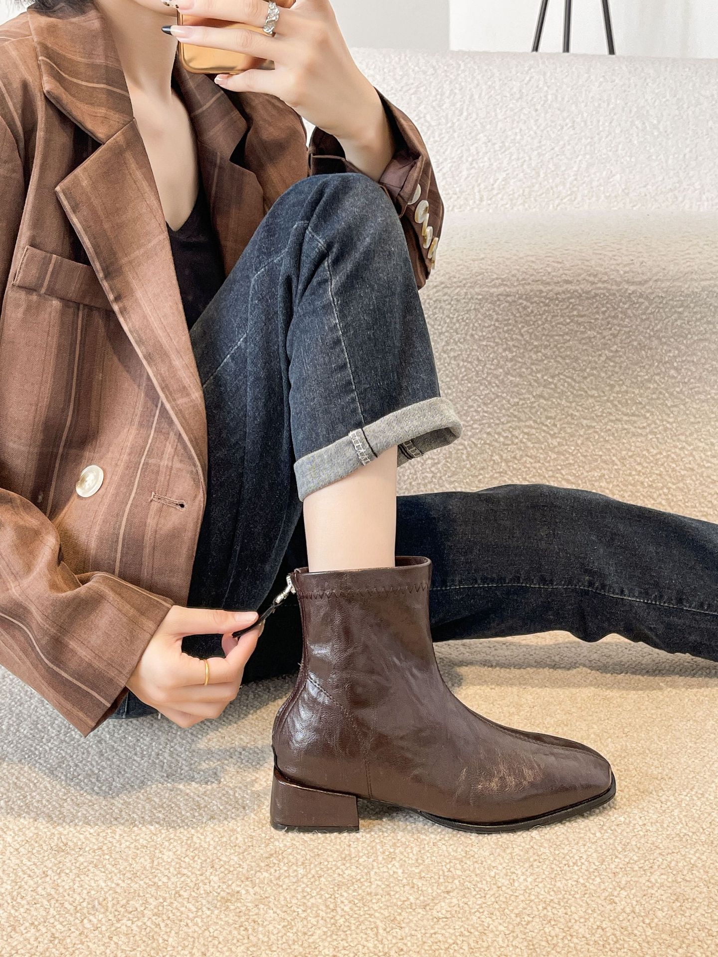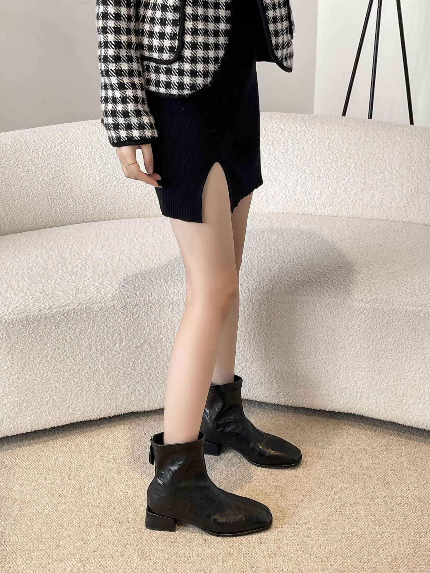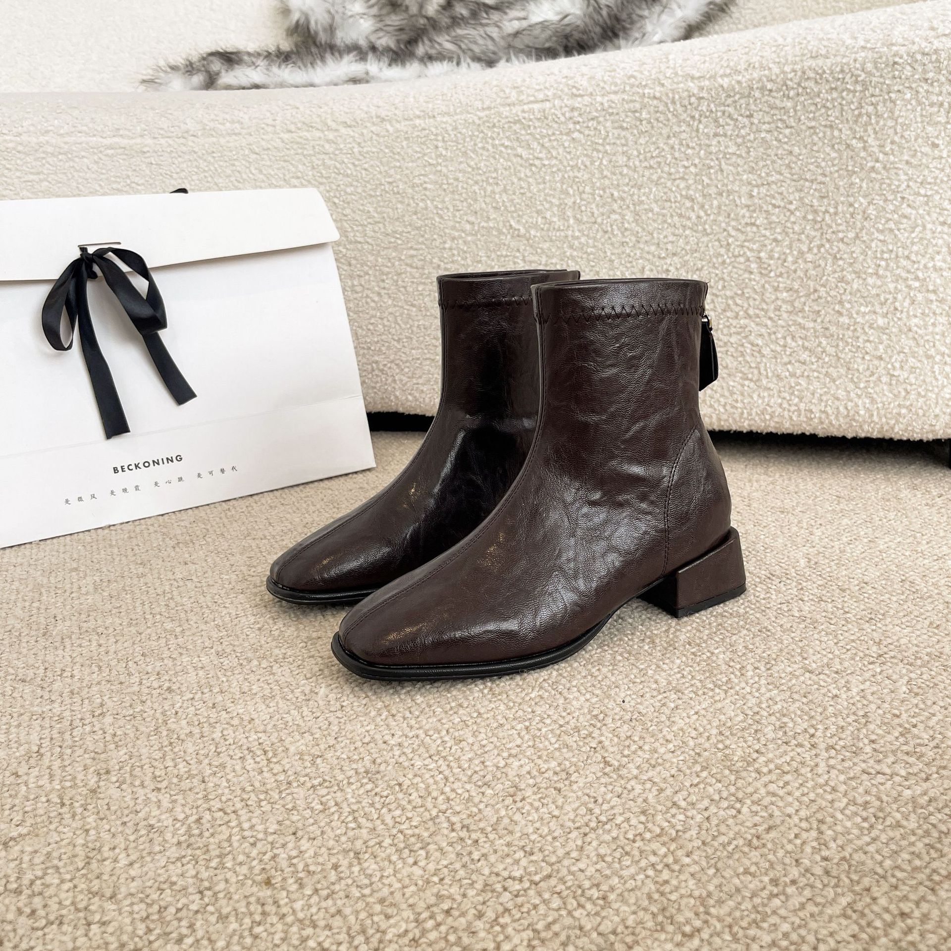 2024 가을과 겨울을위한 넓고 뚱뚱한 낮은 굽 마틴 부츠 새로운 스퀘어 헤드 두꺼운 힐 조커 여성용 핸드 헬드 플러스 사이즈 발목 부츠