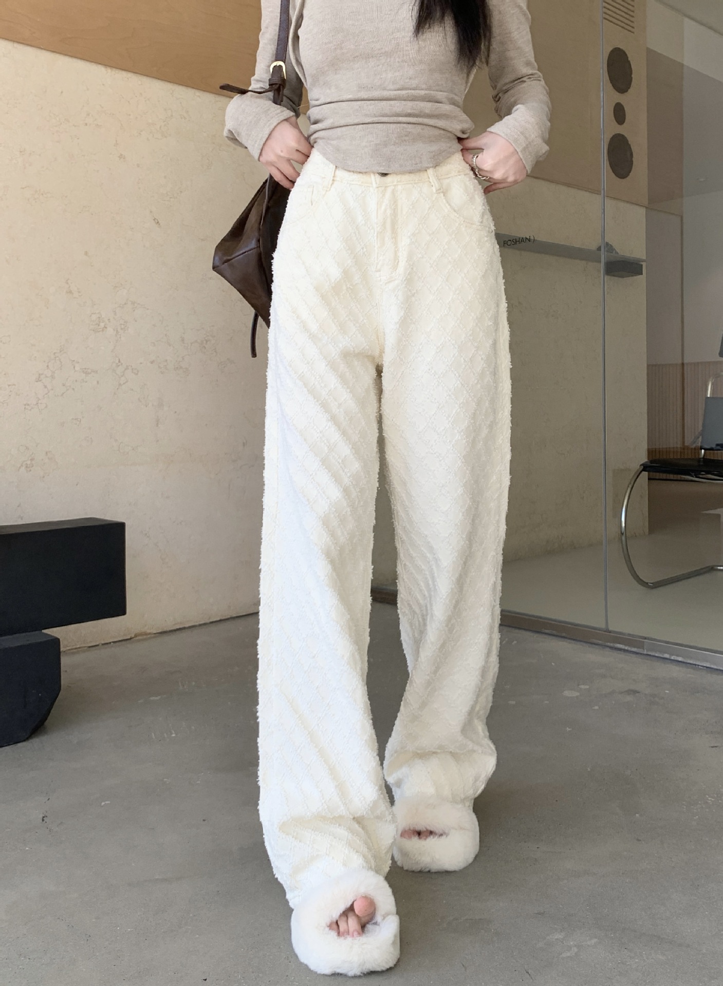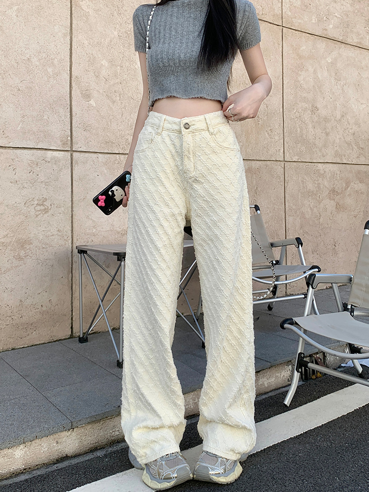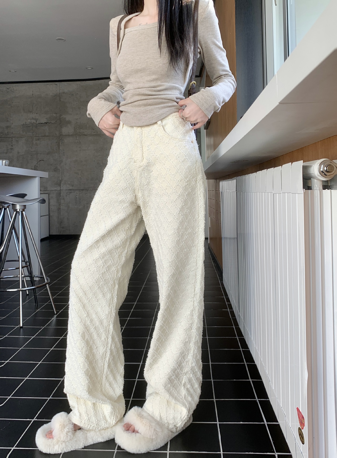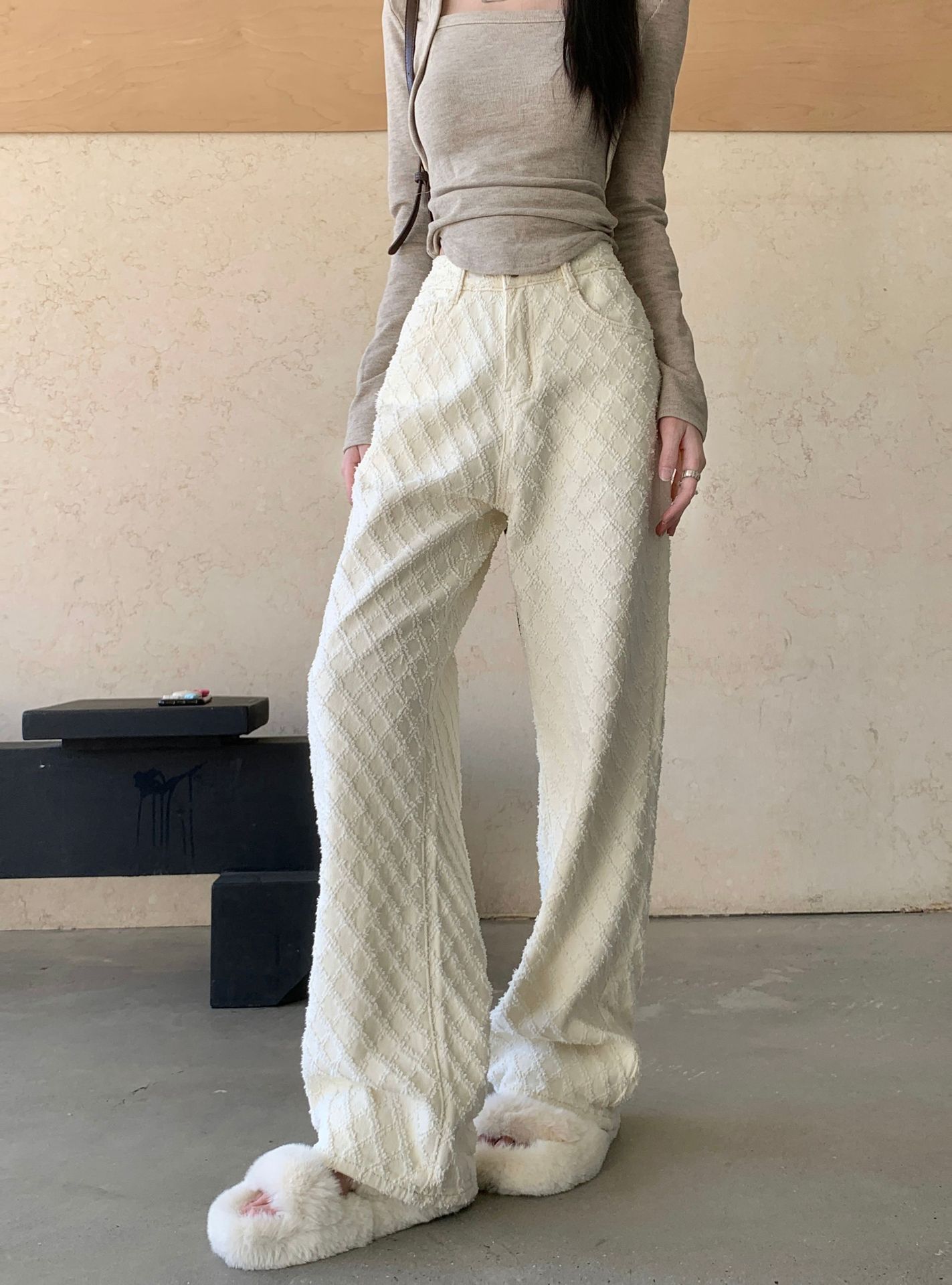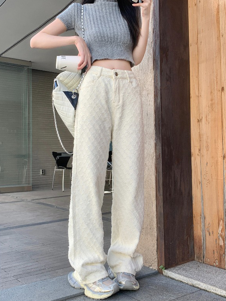 디자인 센스 향기로운 스타일 격자 무늬 화이트 높은 허리 다이아몬드 격자 무늬 청바지 여성의 새로운 자카드 슬리밍 넓은 다리 바지