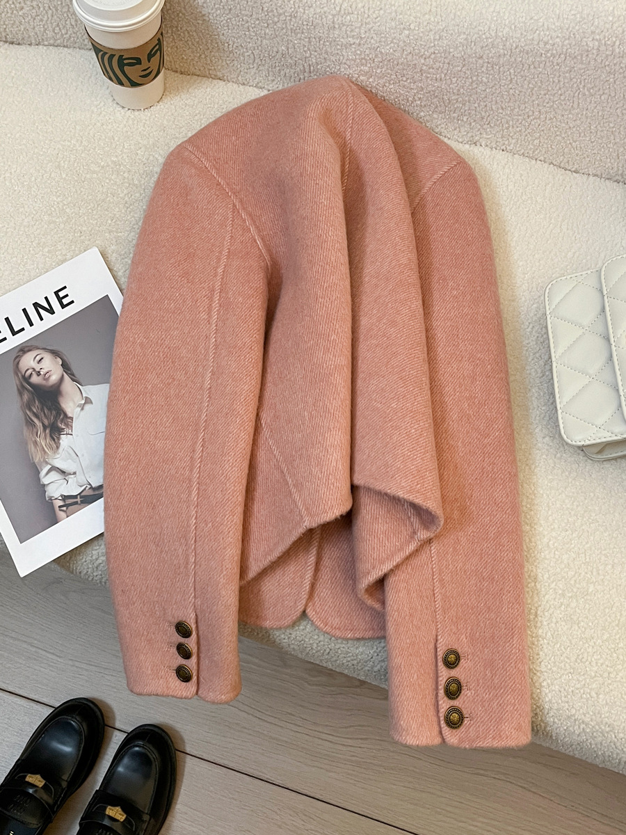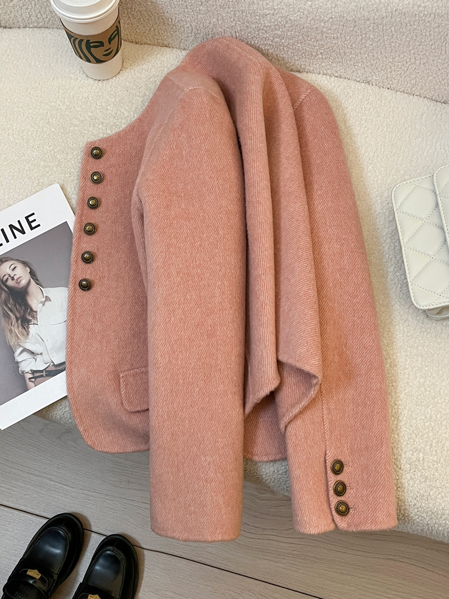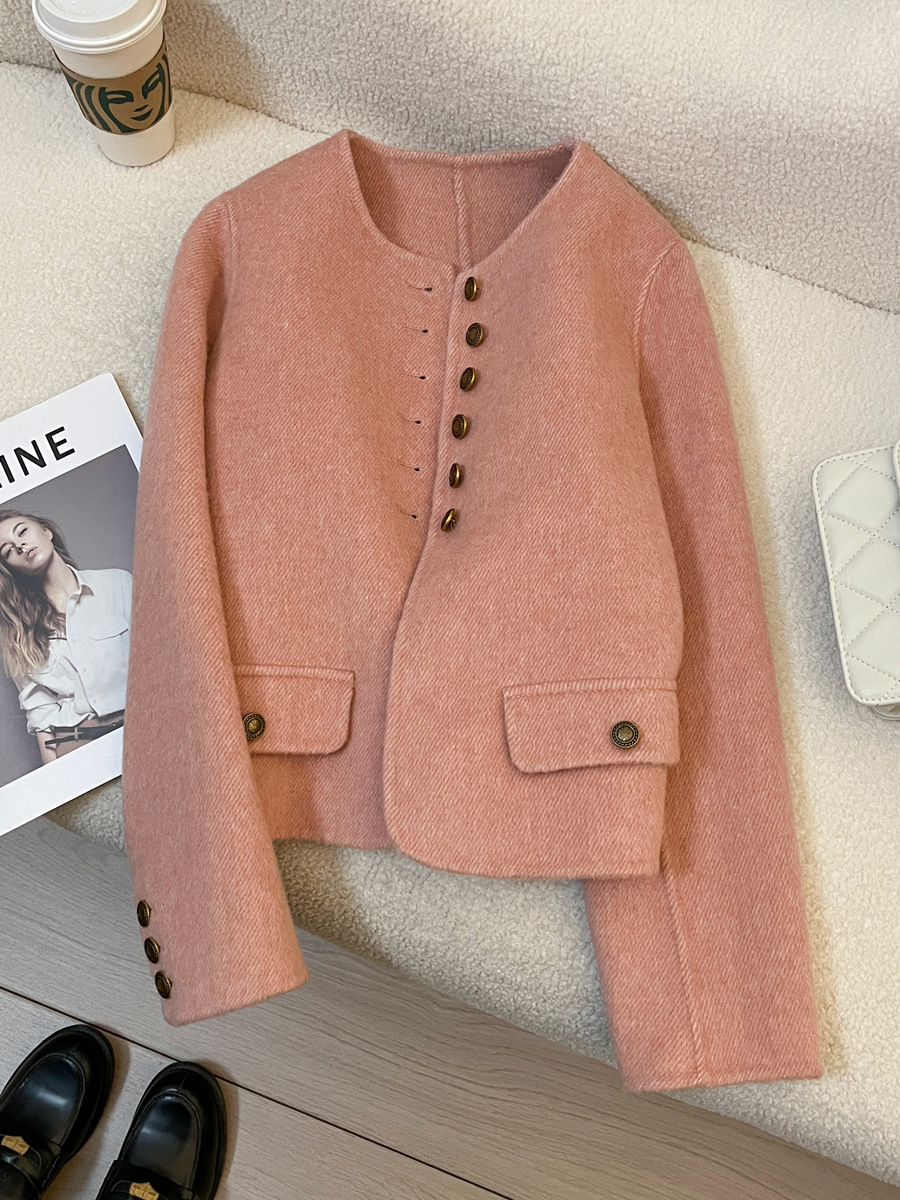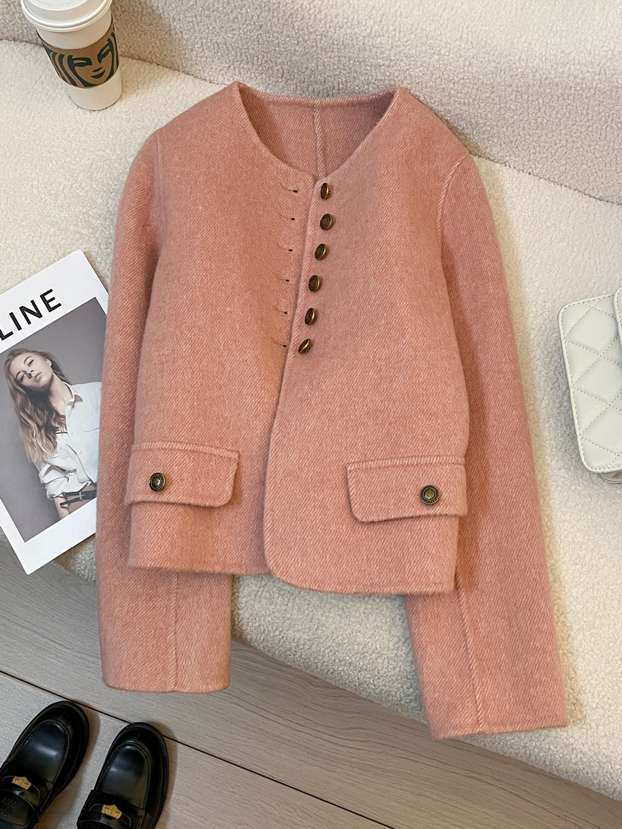 핑크색 짧은 고급 양모 양면 모직 여성 코트 2025 가을 겨울 신상 69% 울 소재 샤넬 스타일 재킷