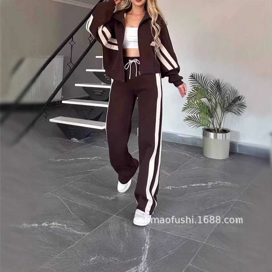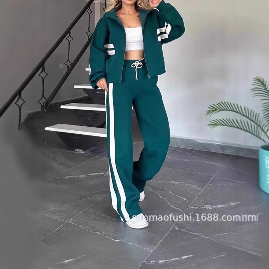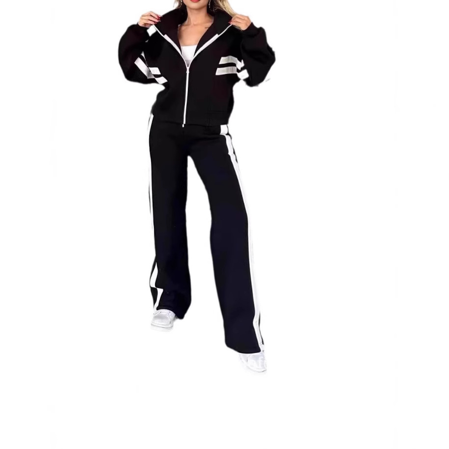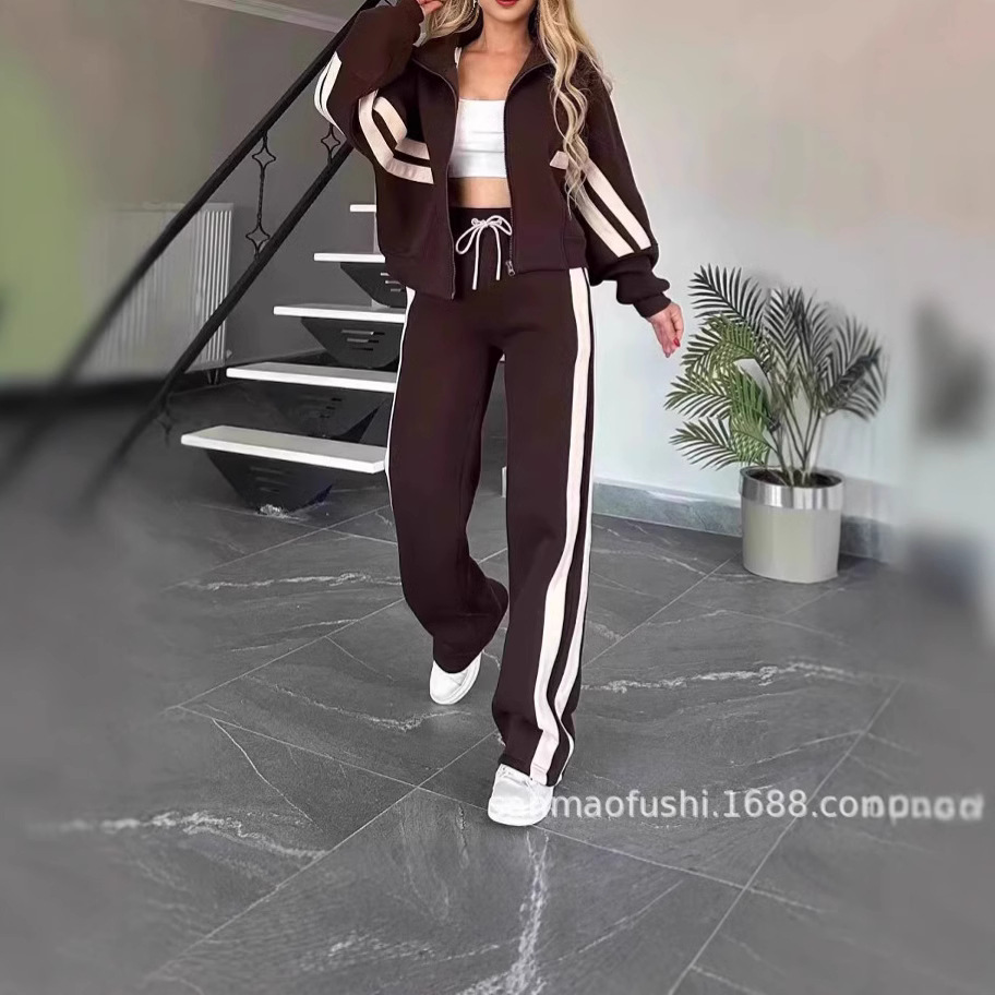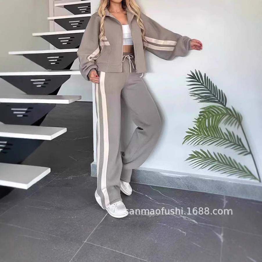 2024 유럽과 미국 국경 아마존 가을 대외 무역 Y2K 줄무늬 지퍼 재킷 캐주얼 스포츠 세트 여성