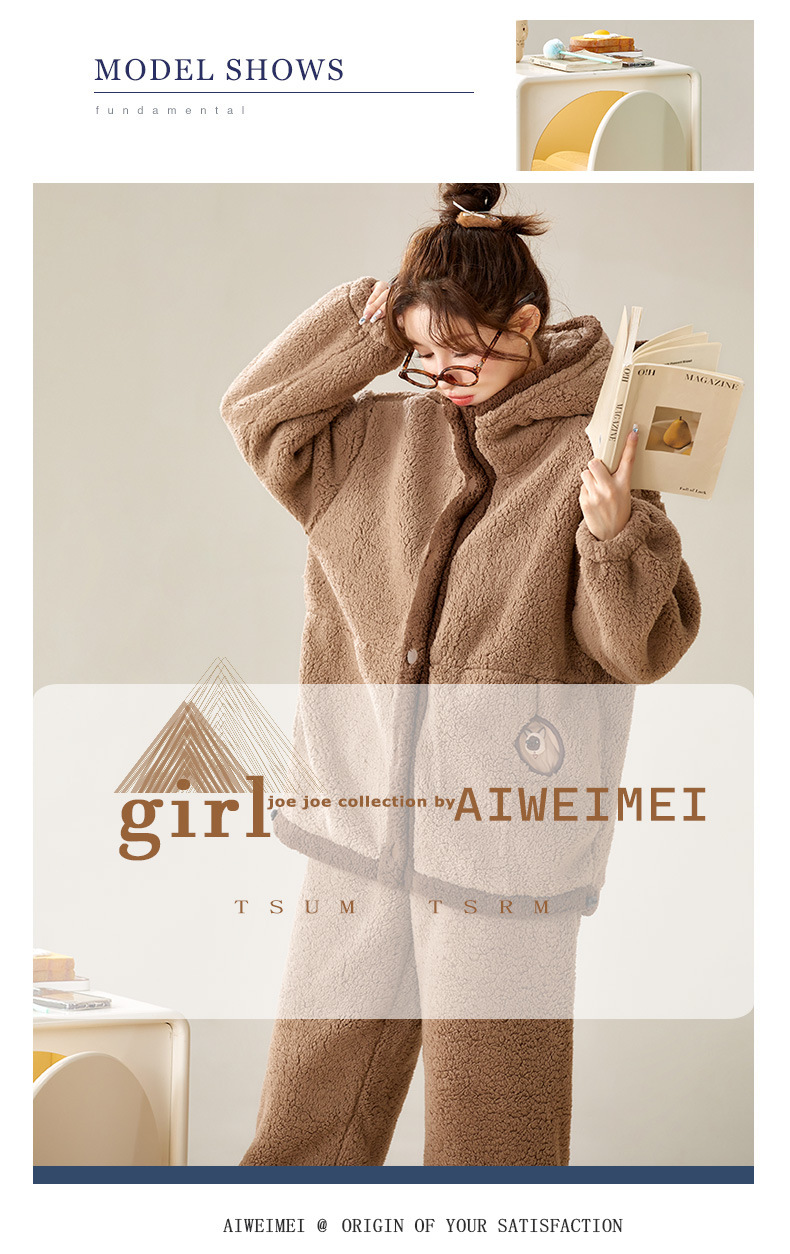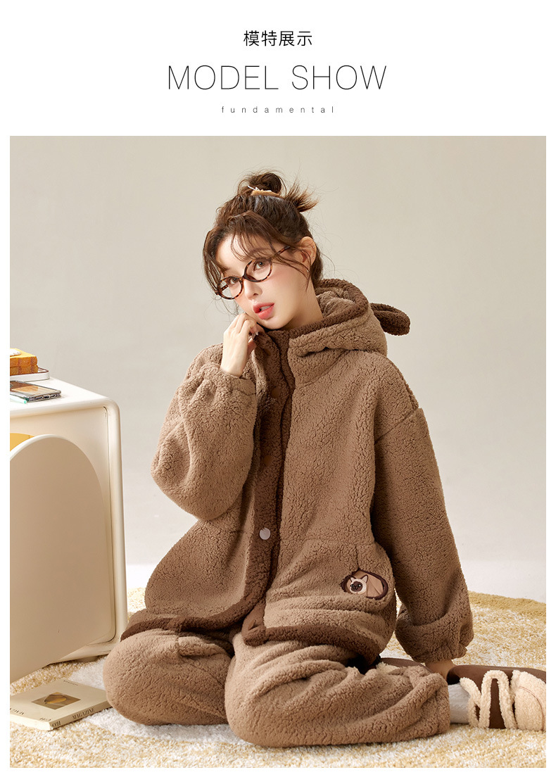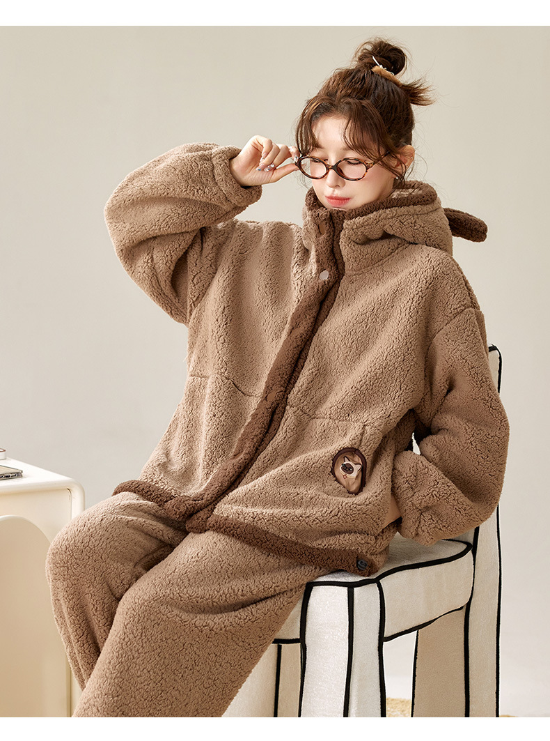 가을과 겨울 양가죽 잠옷 여성 만화 귀여운 후드 자이언트 따뜻한 두꺼운 느슨한 집 옷 세트 겨울