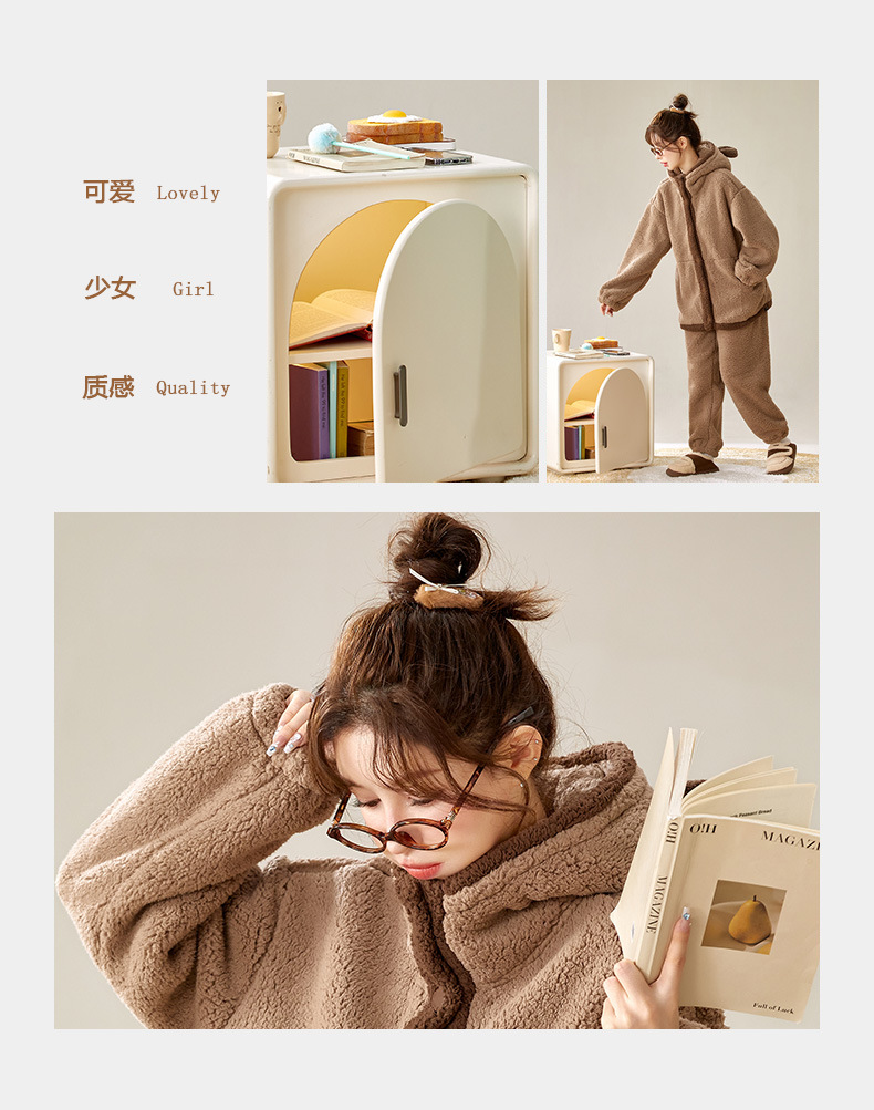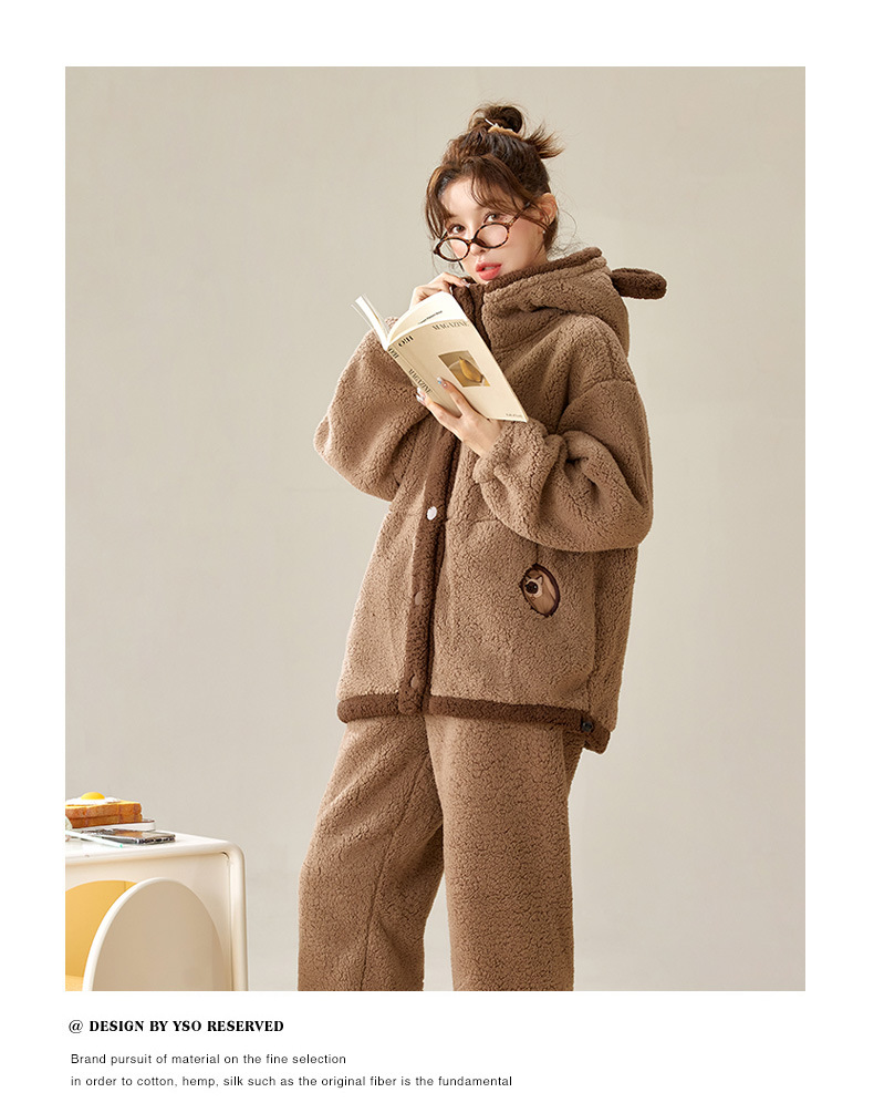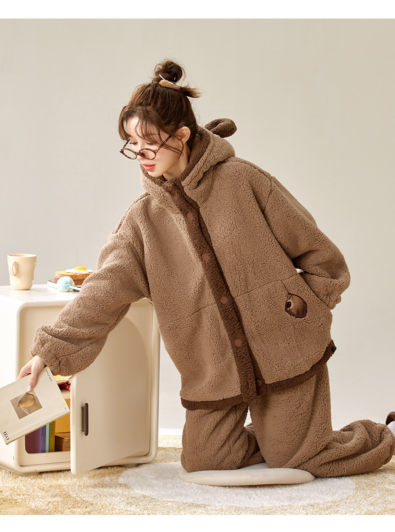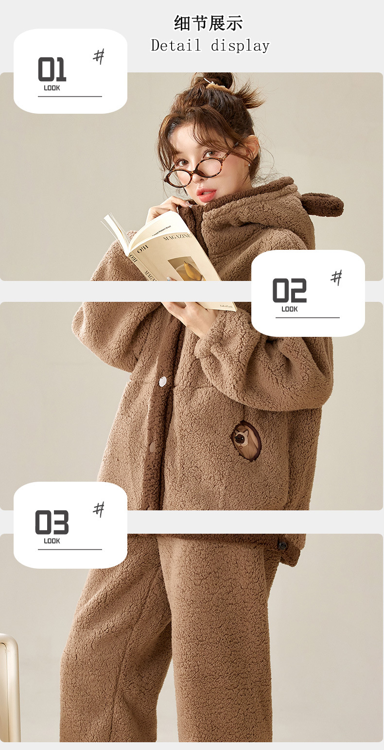 가을과 겨울 양가죽 잠옷 여성 만화 귀여운 후드 자이언트 따뜻한 두꺼운 느슨한 집 옷 세트 겨울