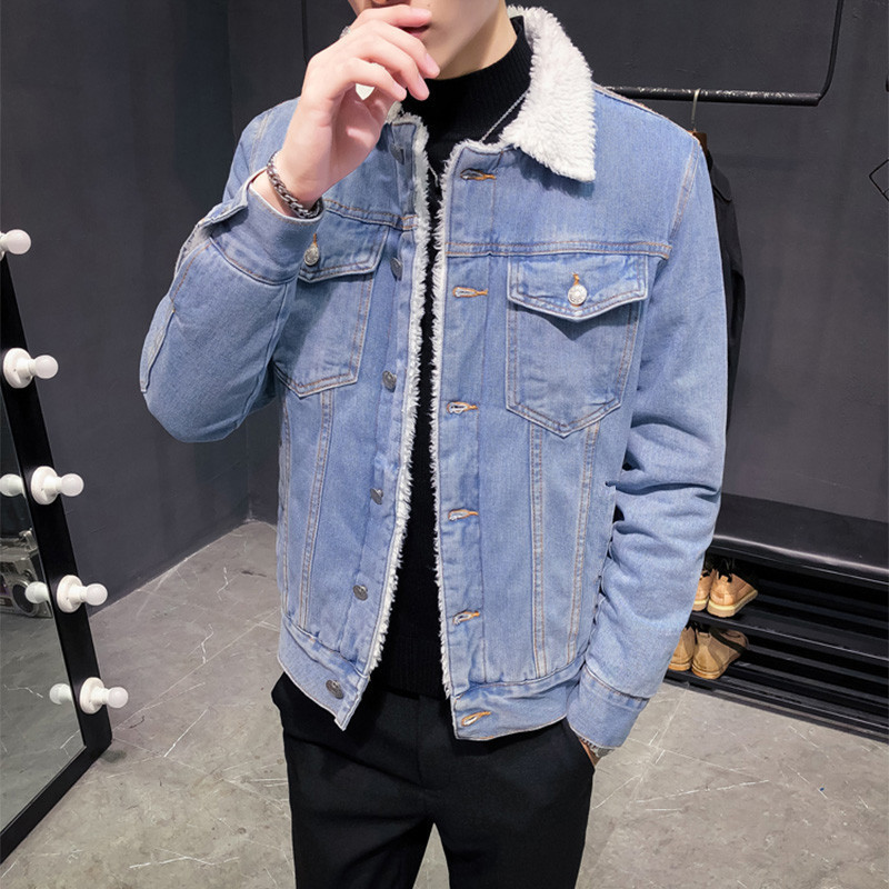 겨울 모피 칼라 데님 재킷 남자 기모 두꺼운 양가죽 재킷 남자 한국 스타일 슬림 핏 청춘면 패딩 코트