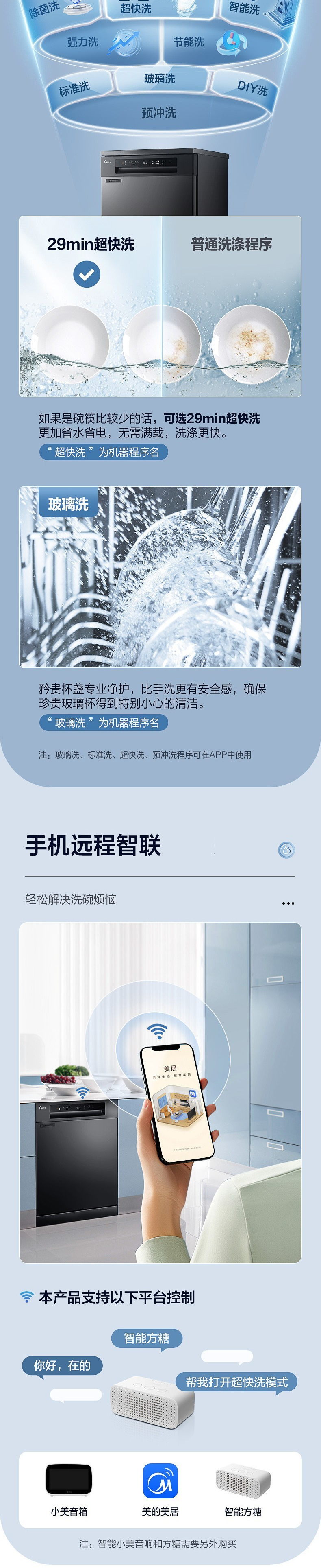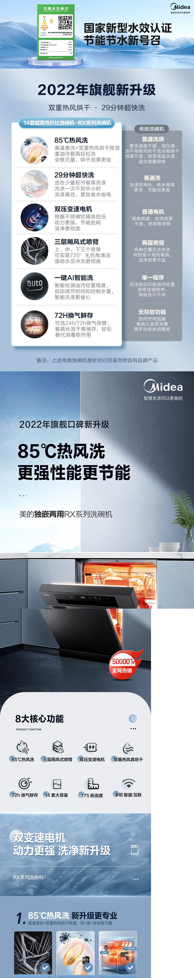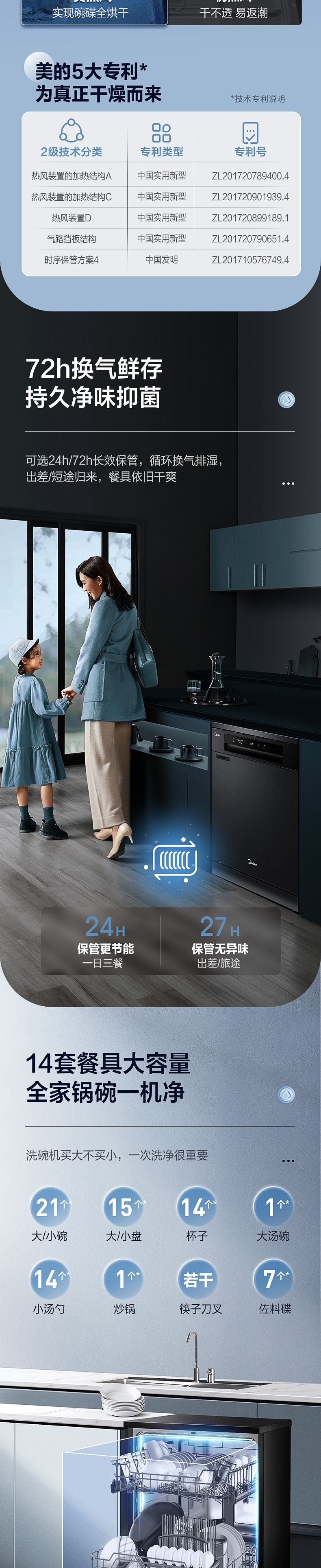 Midea 14 세트 식기 세척기 자동 지능형 가정용 테이블 임베디드 소독 85 ℃ 뜨거운 공기 건조 오염 제거 통합