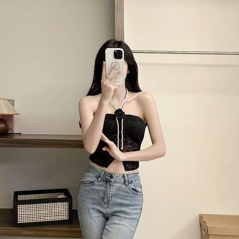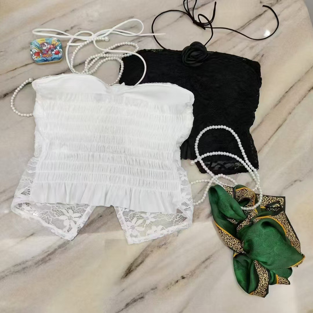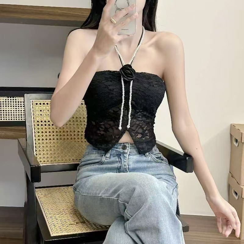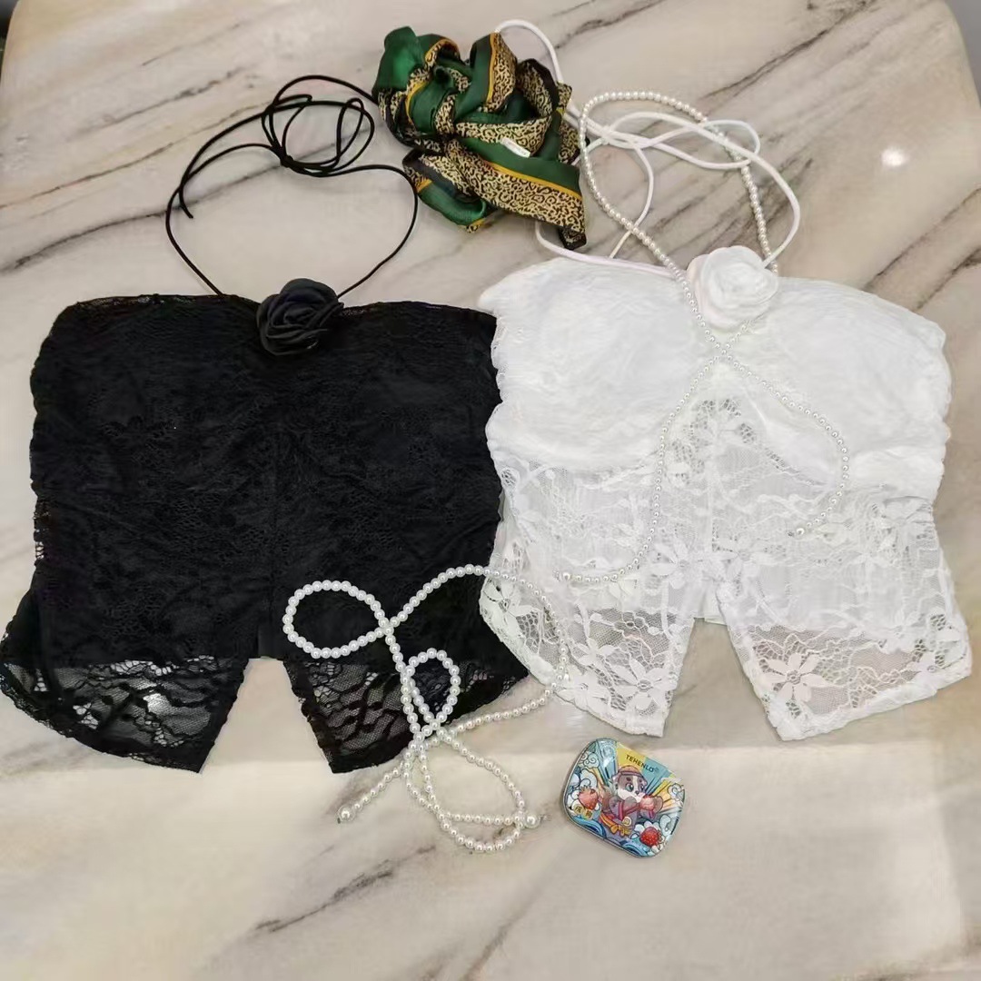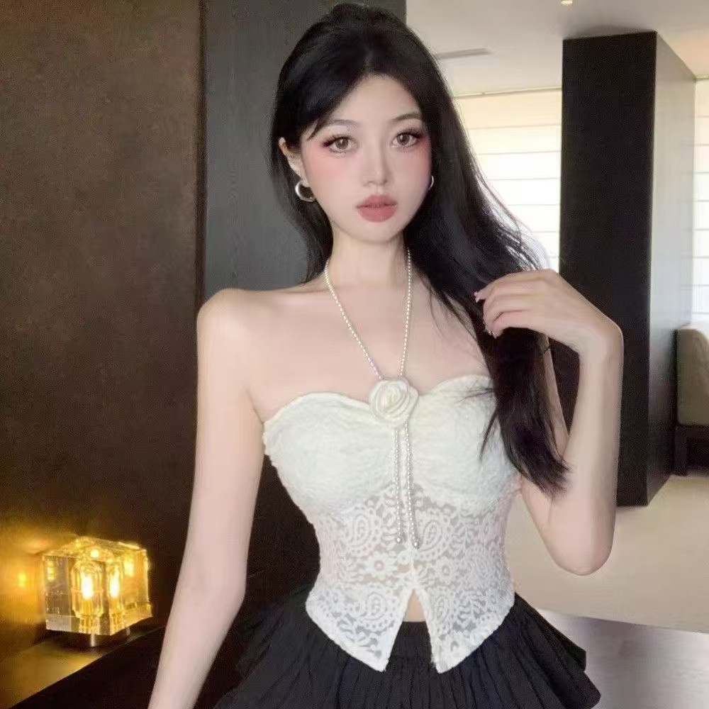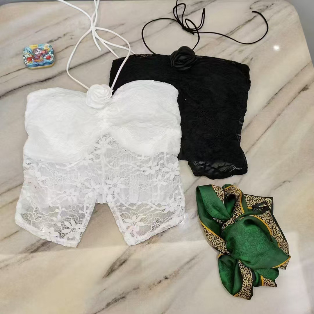 순수 섹시한 레이스 넥 튜브 탑 가슴 패드 스테레오 꽃 장식 섹시한 내부 튜브 탑