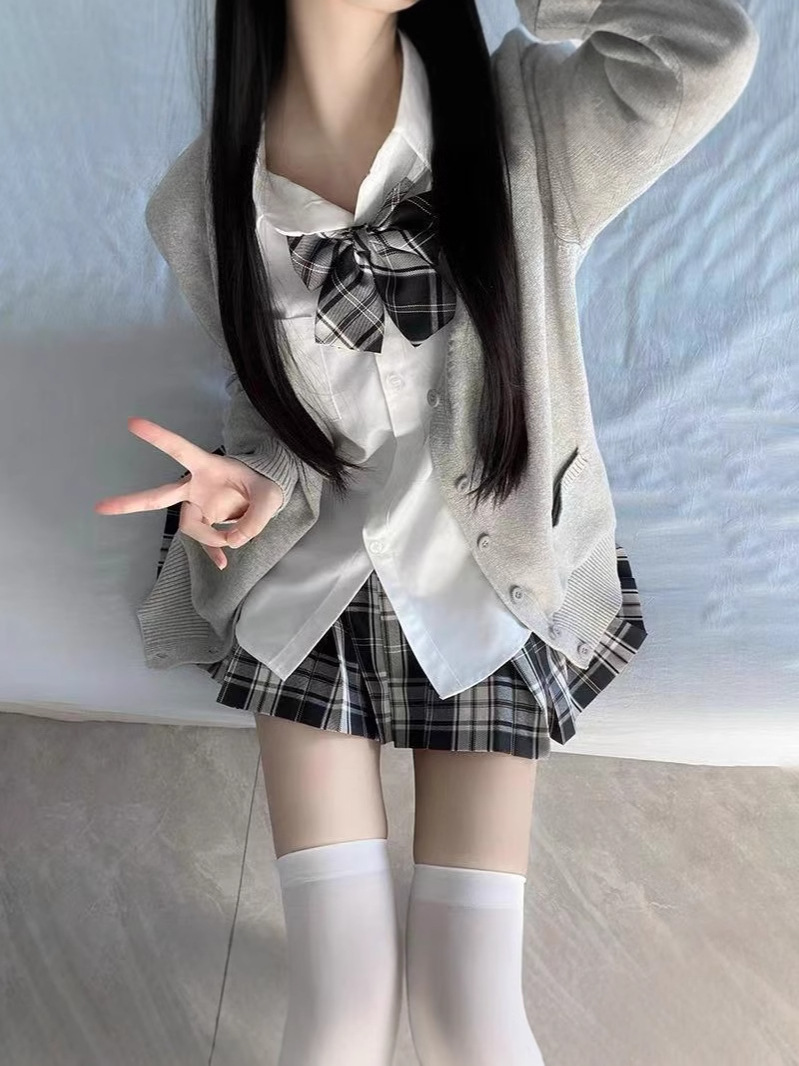 셔츠 + 나비넥타이 + 칠판 스커트 + 라이트 그레이 가디건