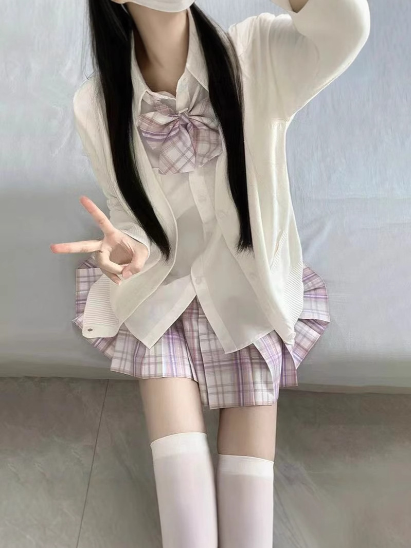 셔츠 + 나비넥타이 + 가리 스커트 + 화이트 가디건