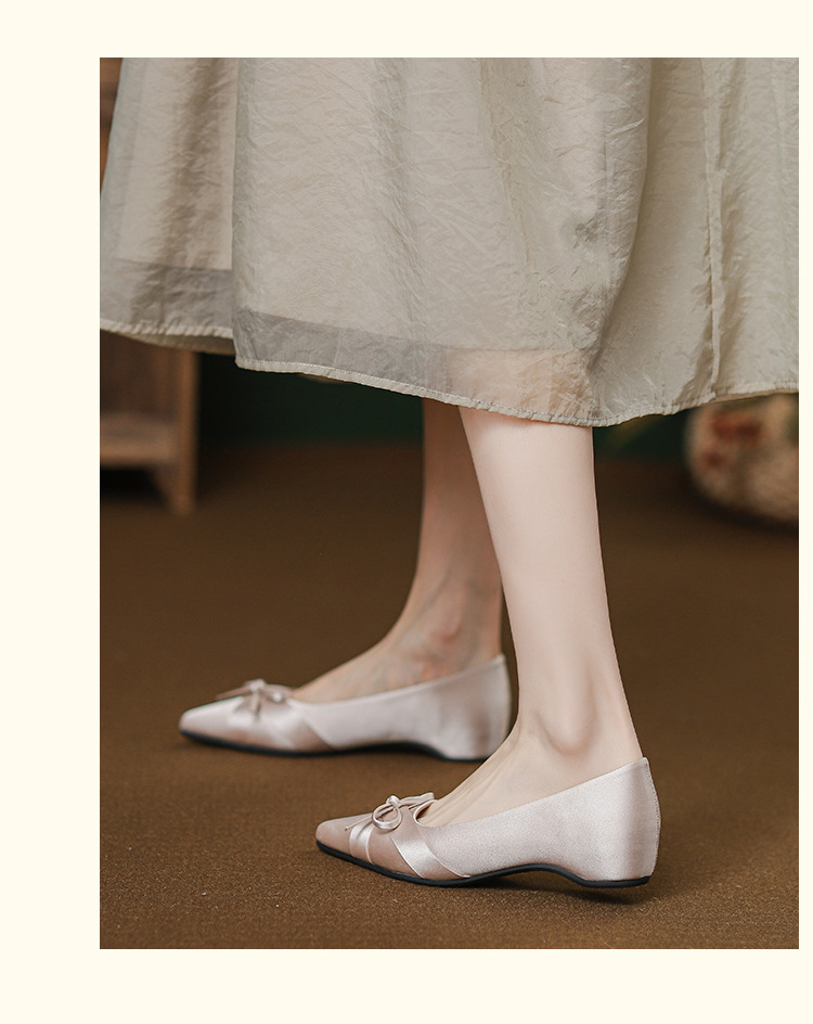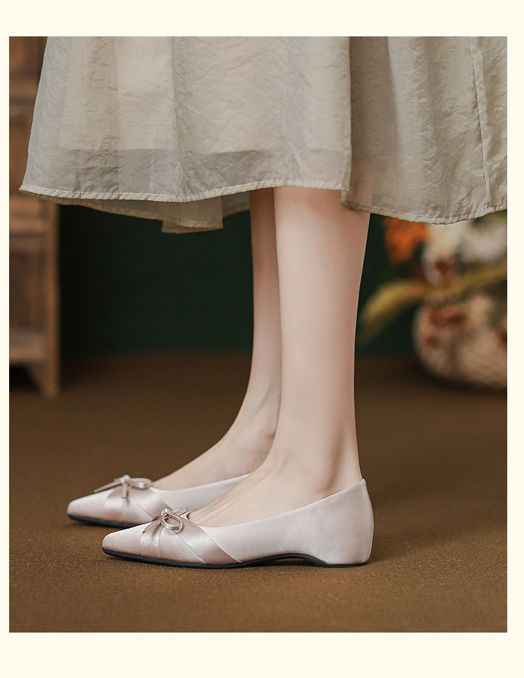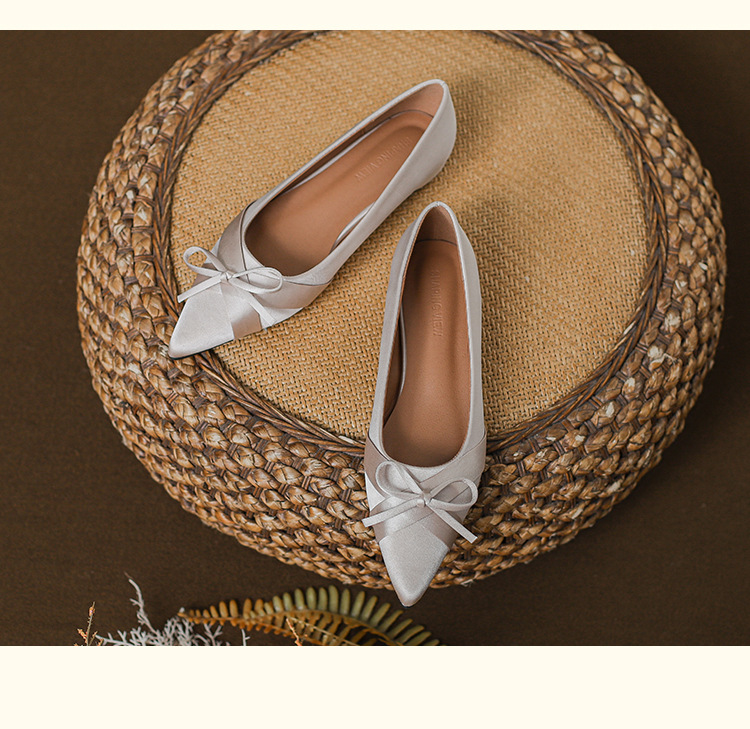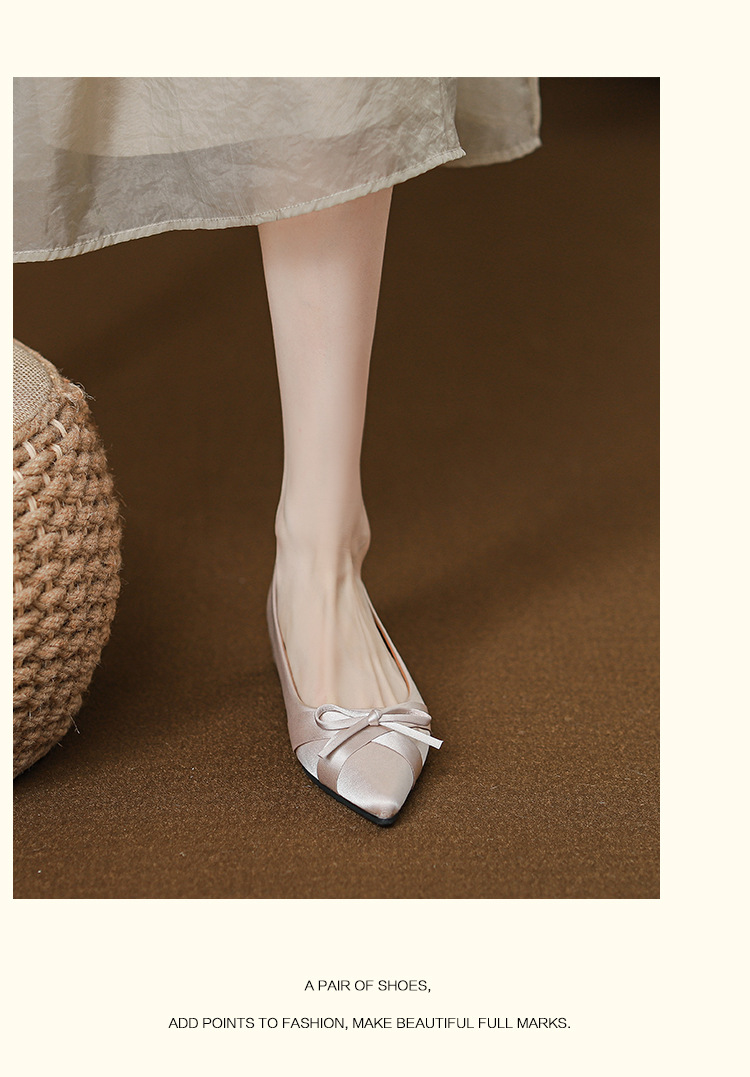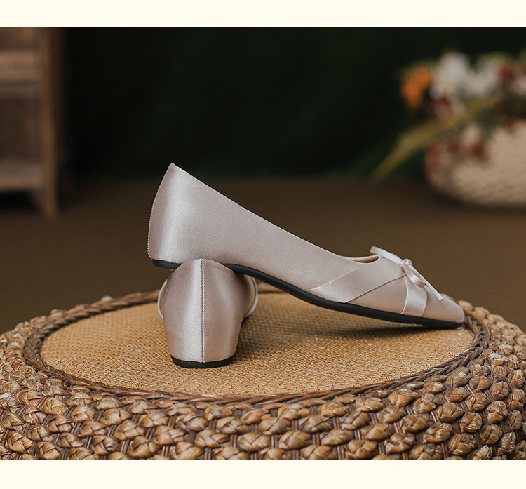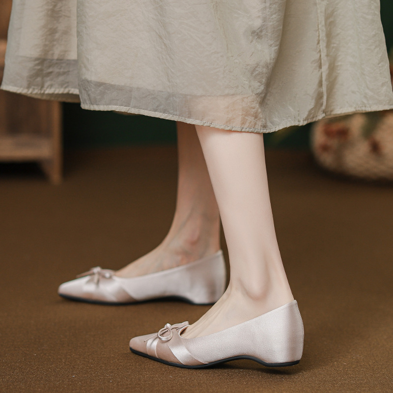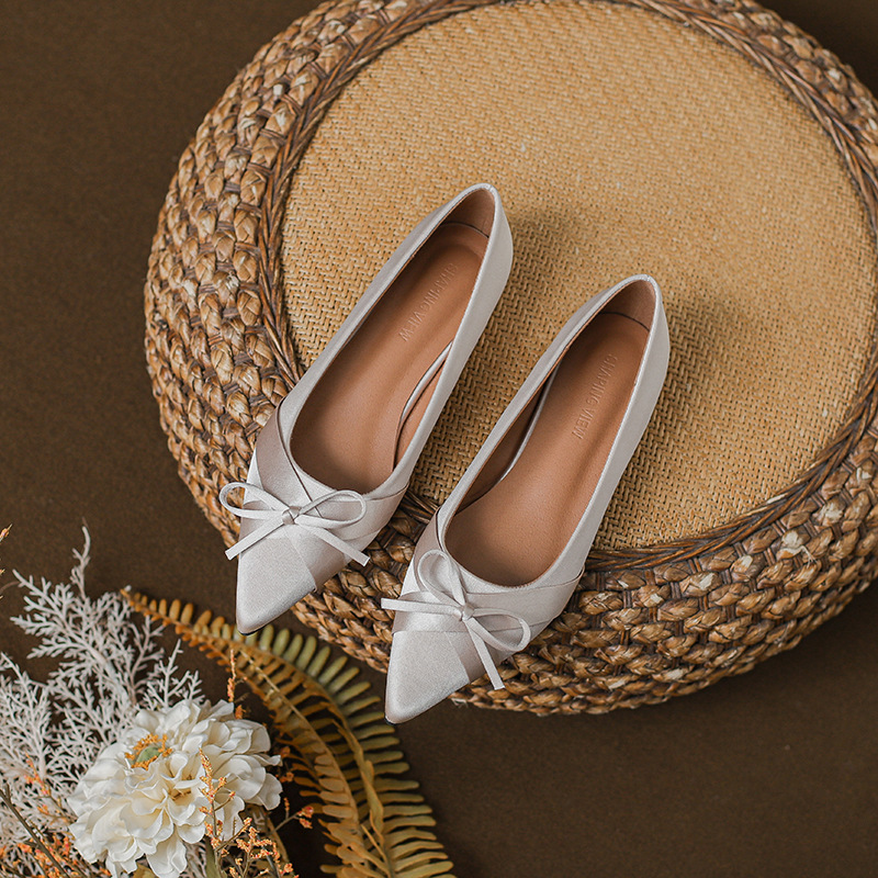 프랑스 스타일의 부드러운 신부 웨딩 슈즈, 여성용 플랫 새틴 포인티드 토 싱글 슈즈, 2026년 신상, 우아한 리본 장식의 작은 굽 슈즈